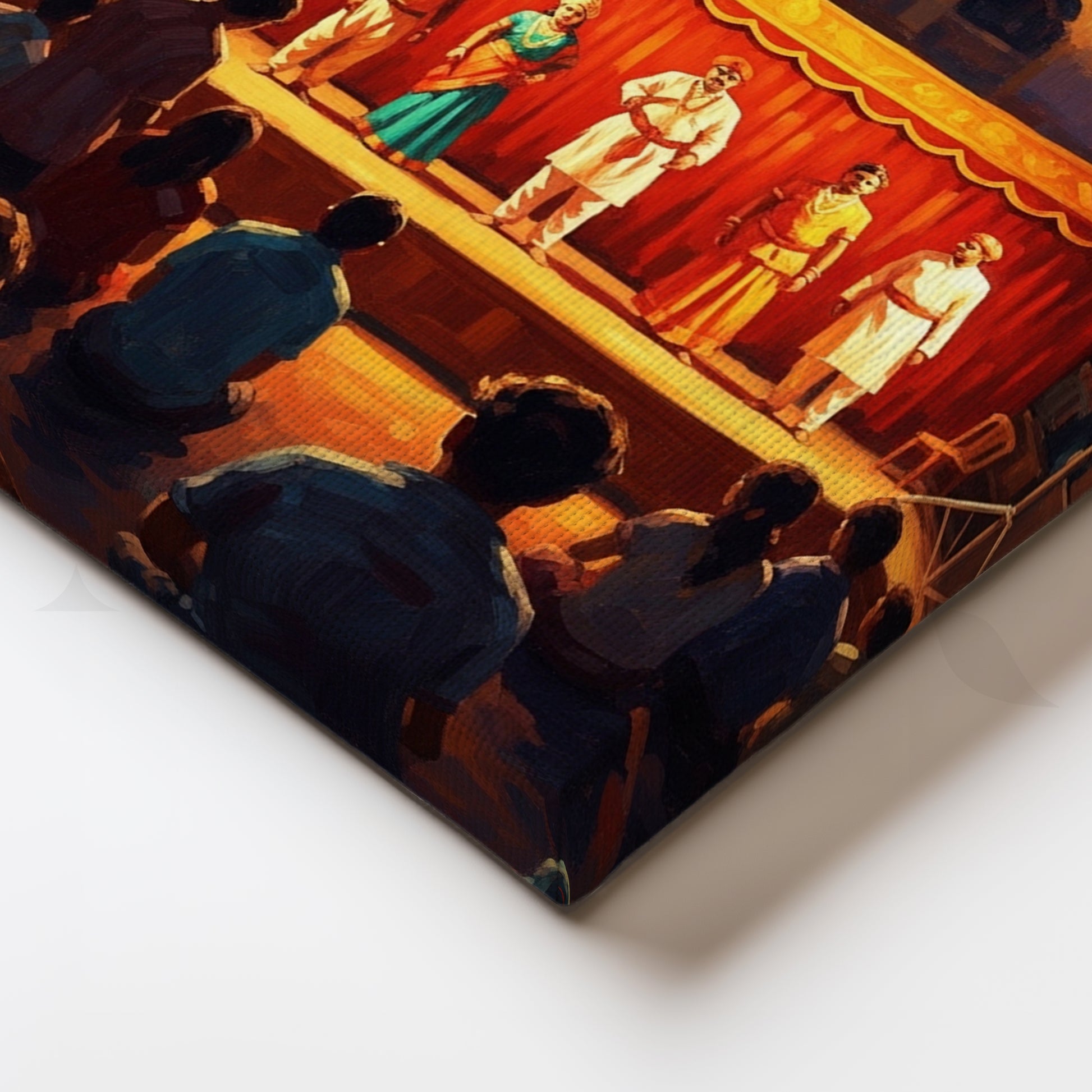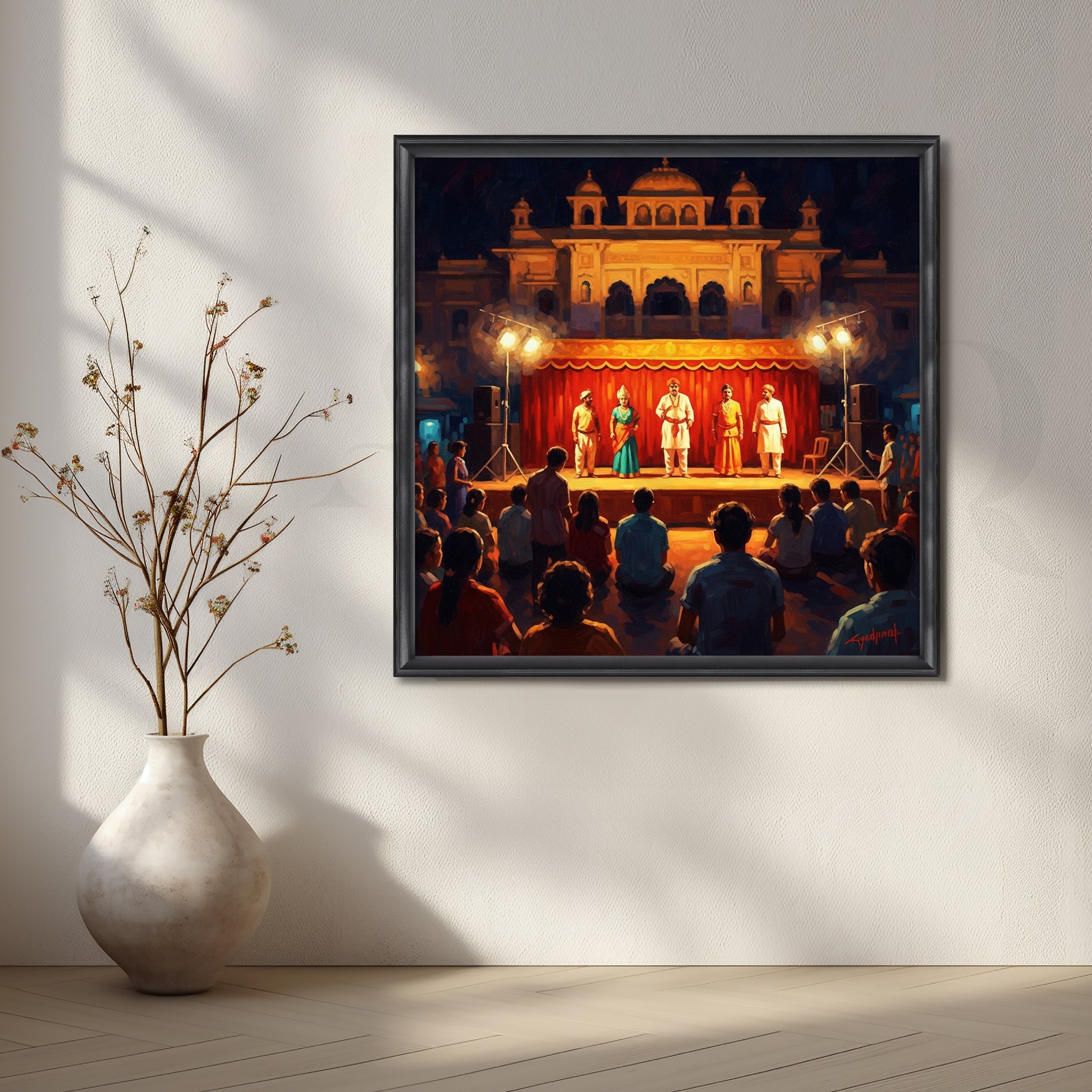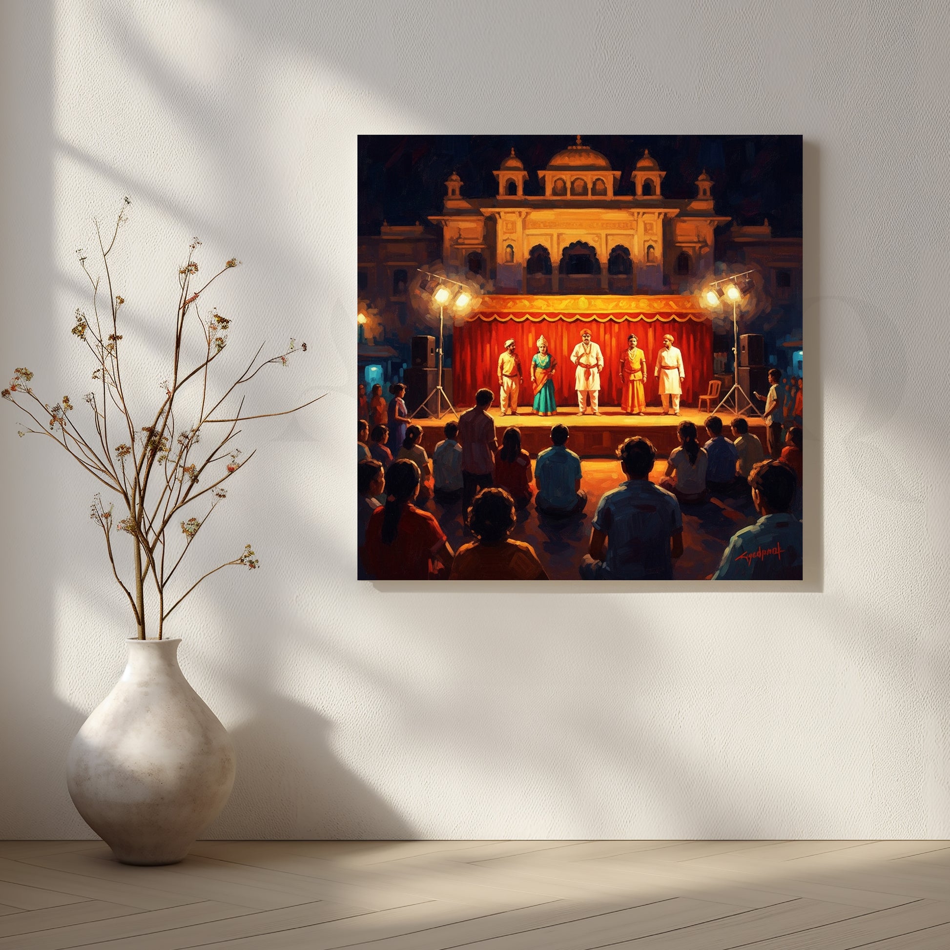 Experience the magic of traditional Indian folk theater with this canvas art capturing an open-air stage performance under warm evening lights. The audience’s engagement and vivid colors bring the artwork to life. This painting is ideal for showcasing Indian performing arts and adds depth, drama, and storytelling to any wall.