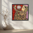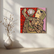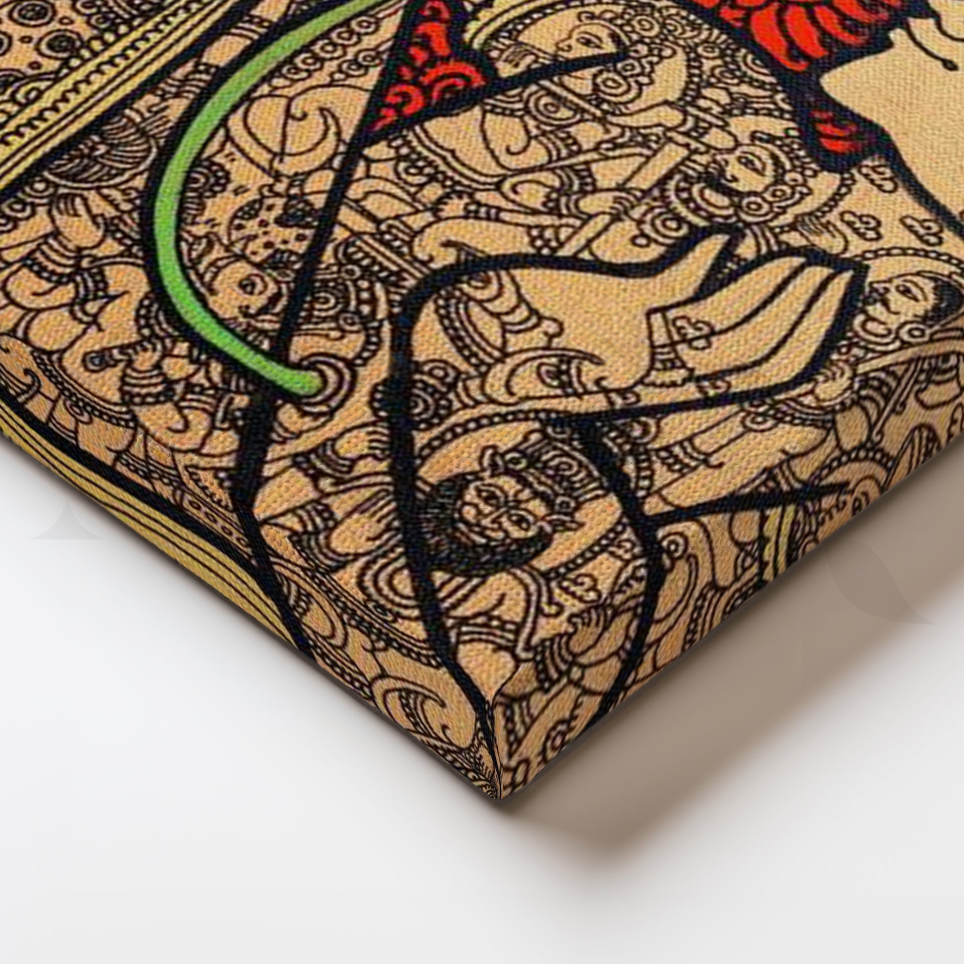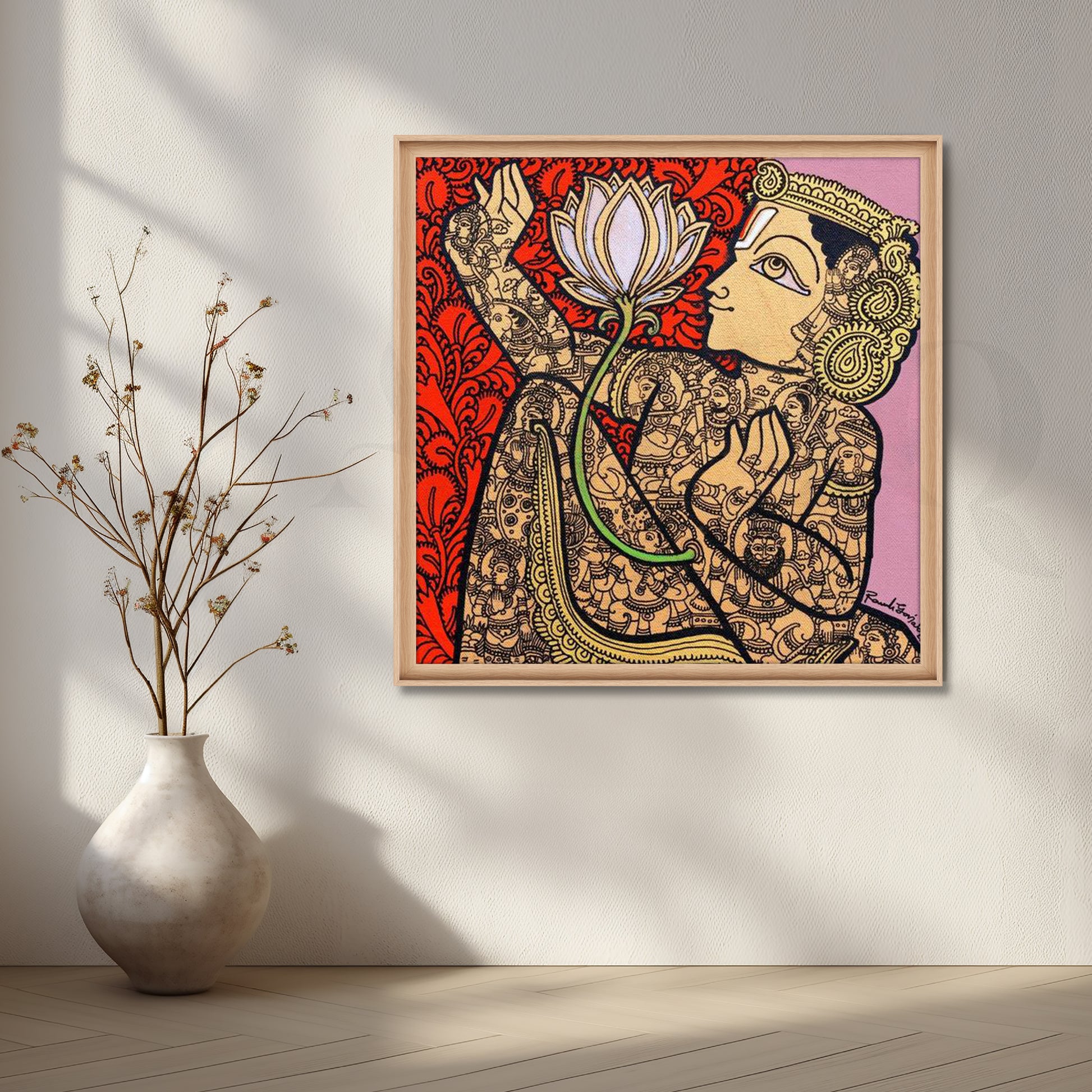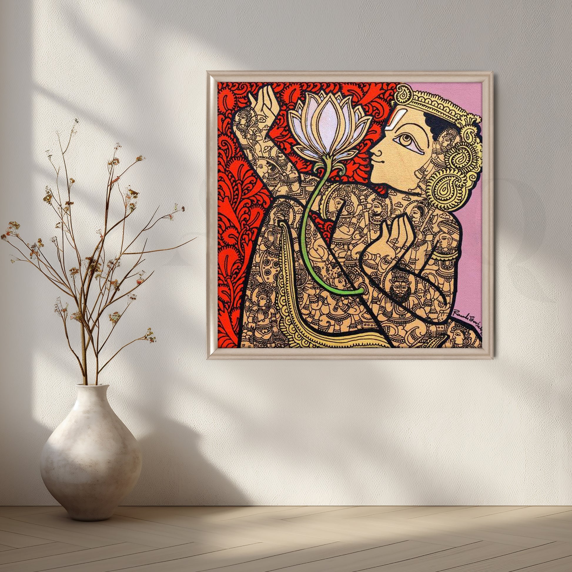 This canvas artwork features a stylised Indian deity holding a blooming lotus, rendered in intricate folk-art linework with rich reds, golds and soft pinks. The detailed figures within the form add layers of storytelling. Ideal as spiritual wall art for pooja rooms, living rooms and ethnic home décor corners.