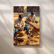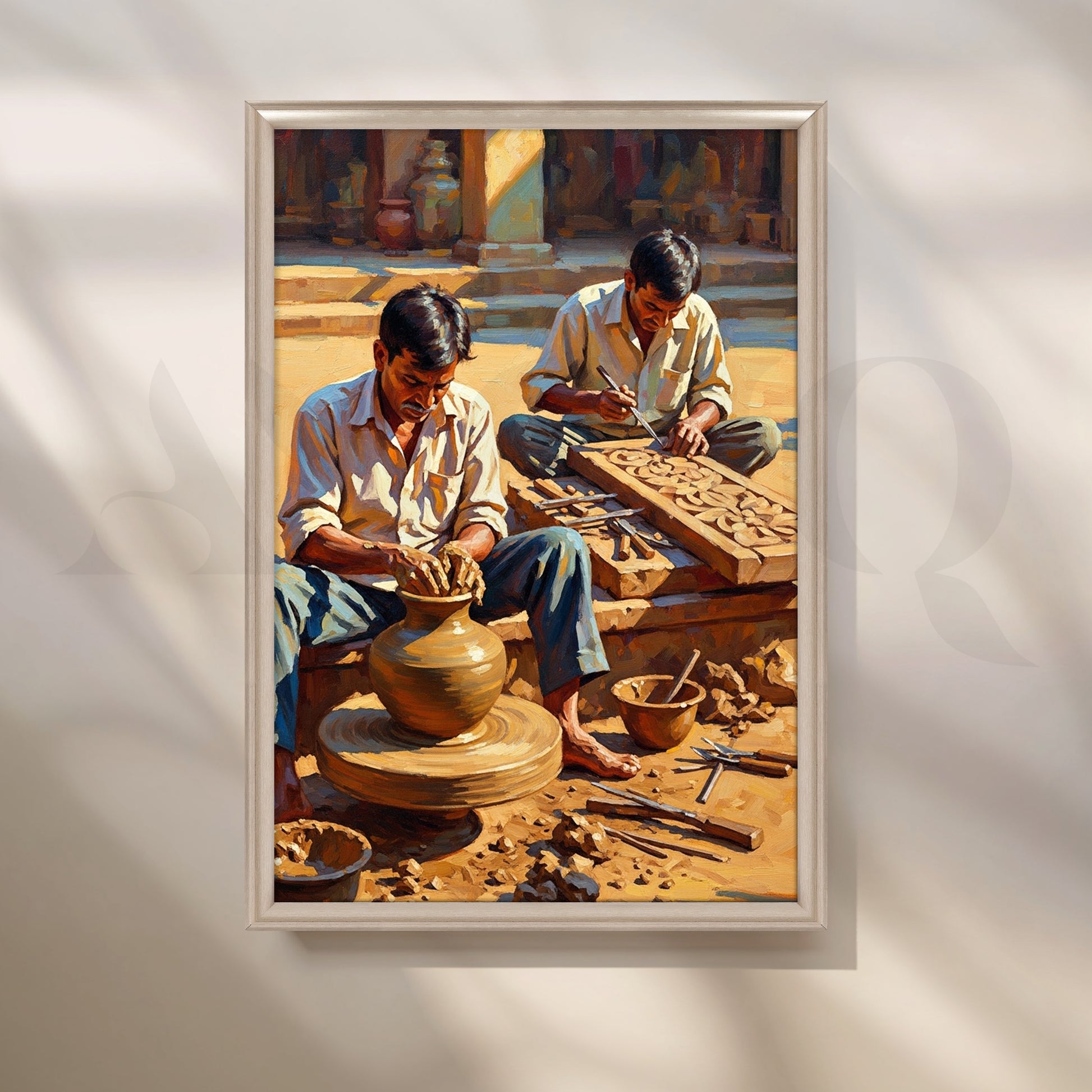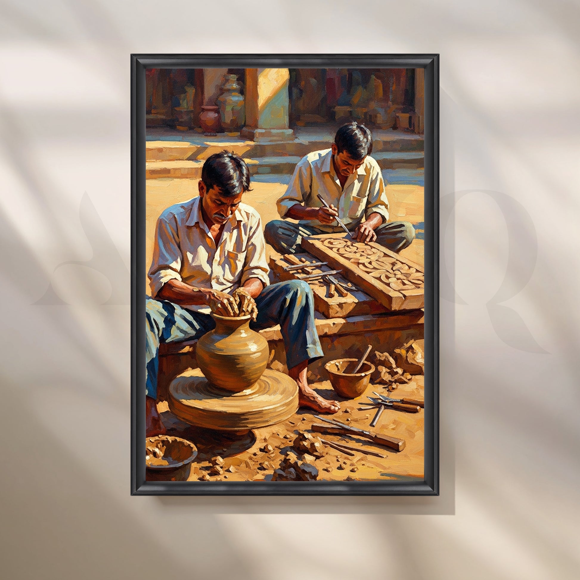 Celebrate India’s artisan heritage with this detailed canvas artwork depicting craftsmen shaping clay pots and carving intricate designs. The earthy tones and realistic brushwork pay tribute to traditional Indian craftsmanship. A perfect wall decor piece for art studios, galleries, or homes that appreciate handmade artistry and cultural legacy.