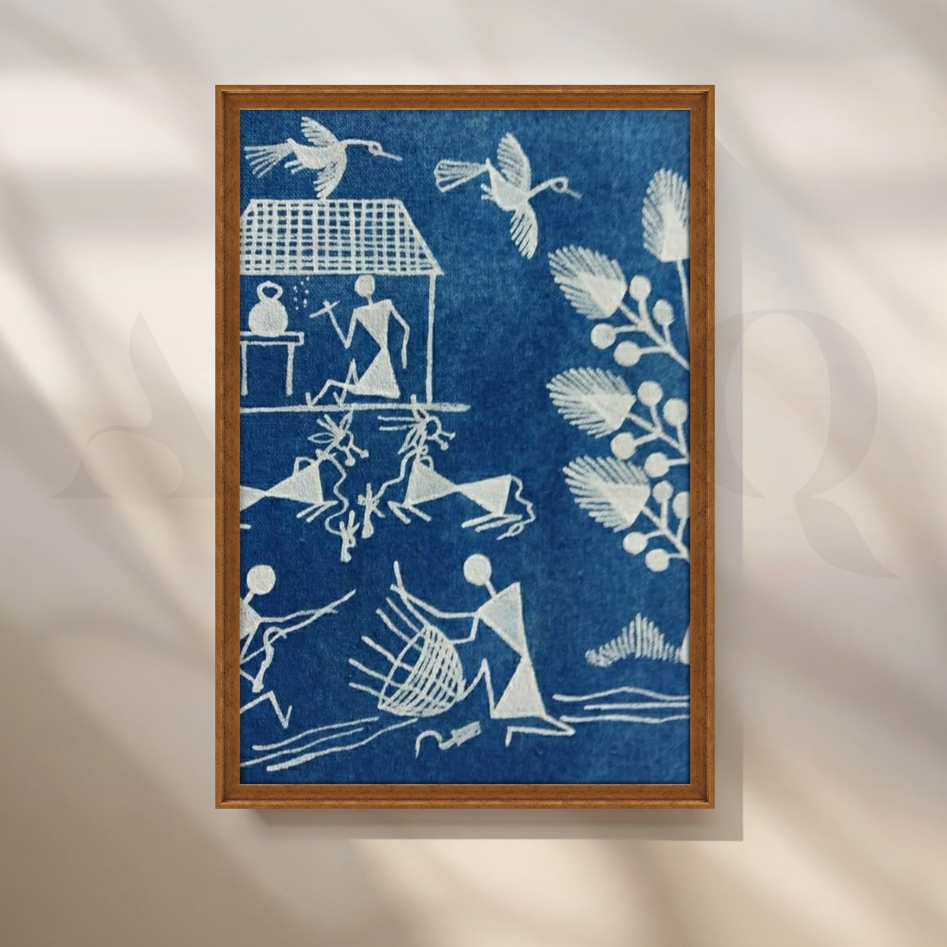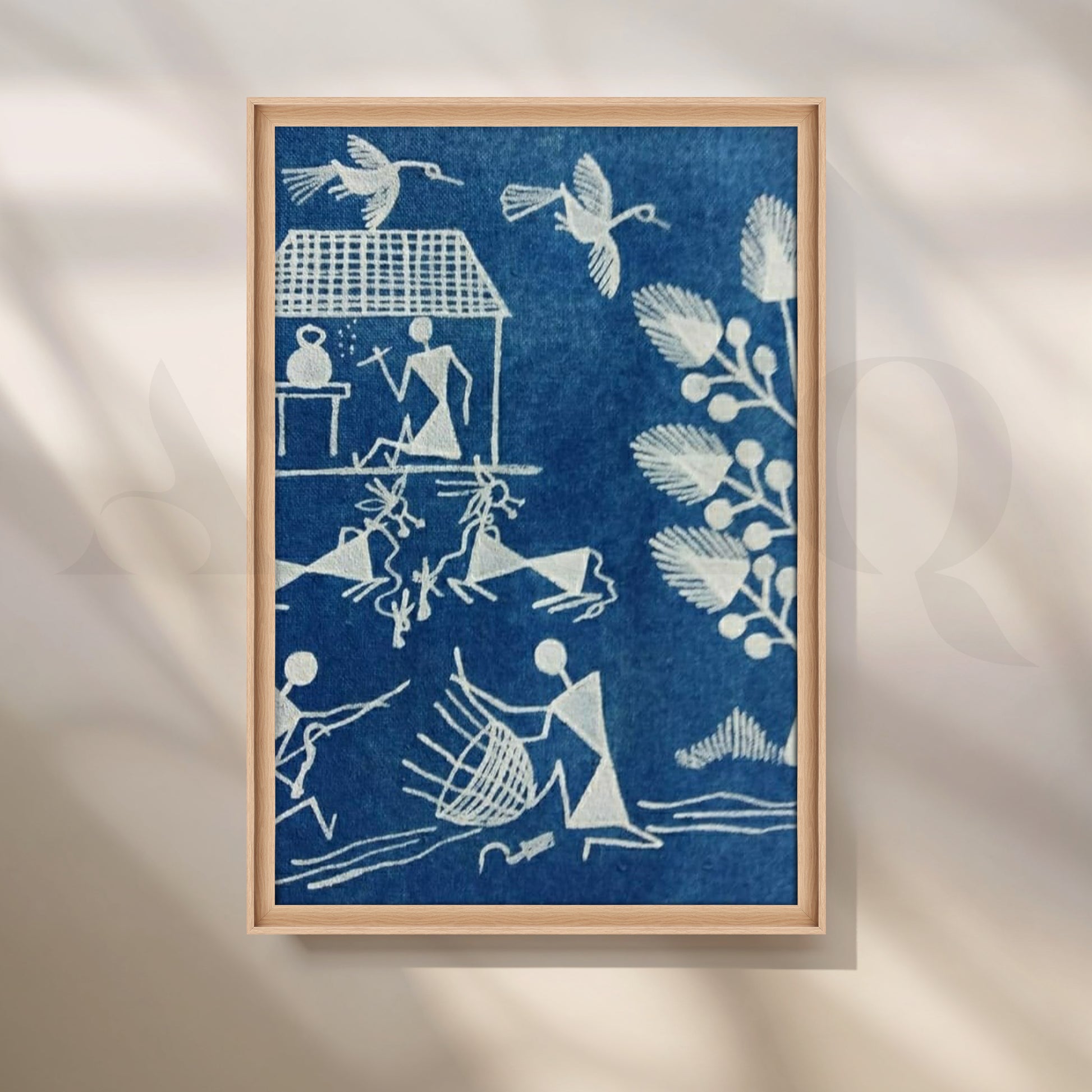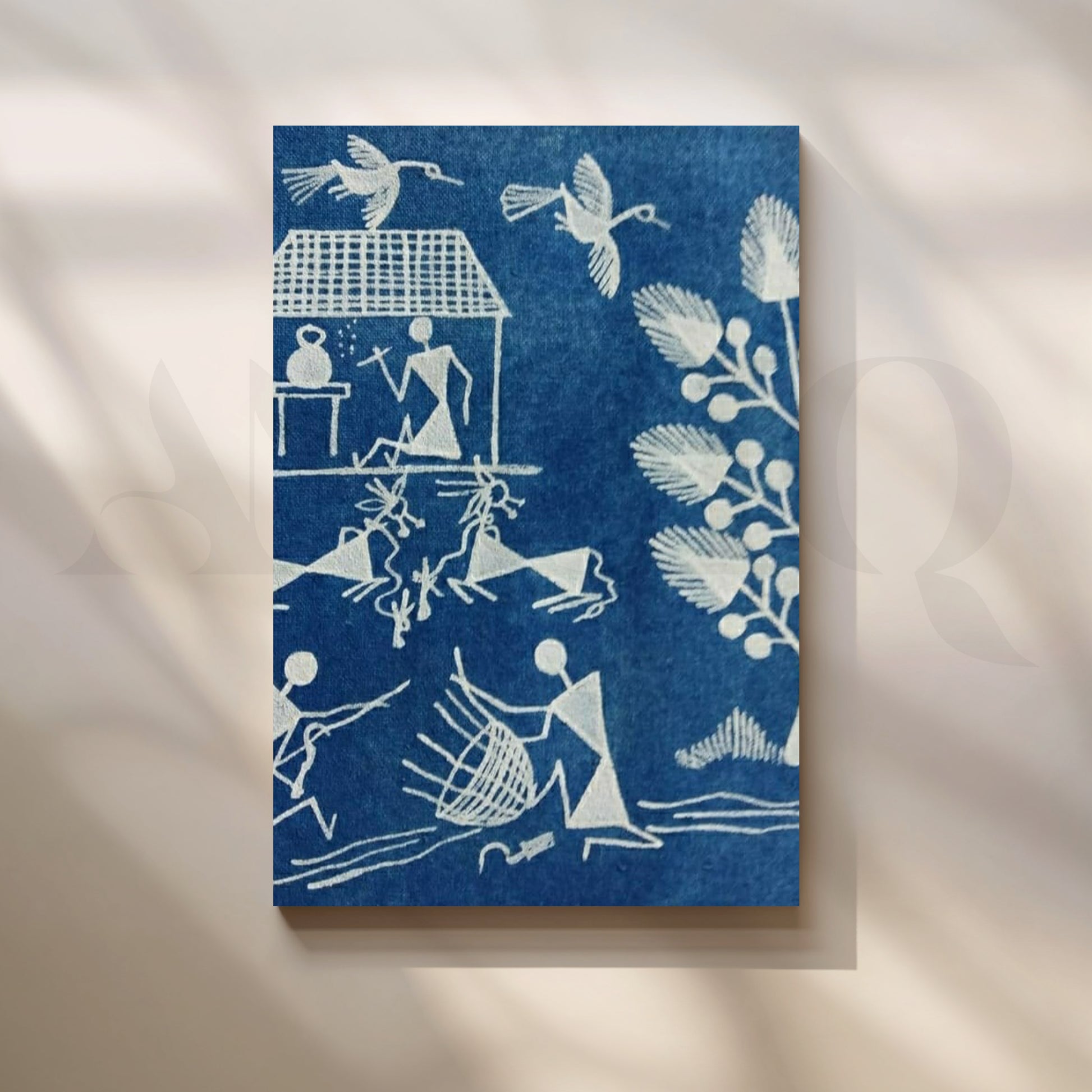 A soothing indigo palette showcases classic Warli forms—birds in flight, a potter at work and fishermen with nets—rendered in chalk-white linework. This calming folk art canvas suits bedrooms and reading nooks, adding serenity, craftsmanship and cultural depth. Keywords: blue wall art, Warli village painting, Indian tribal décor, minimalist folk canvas, bedroom artwork, handmade look, coastal boho style.