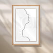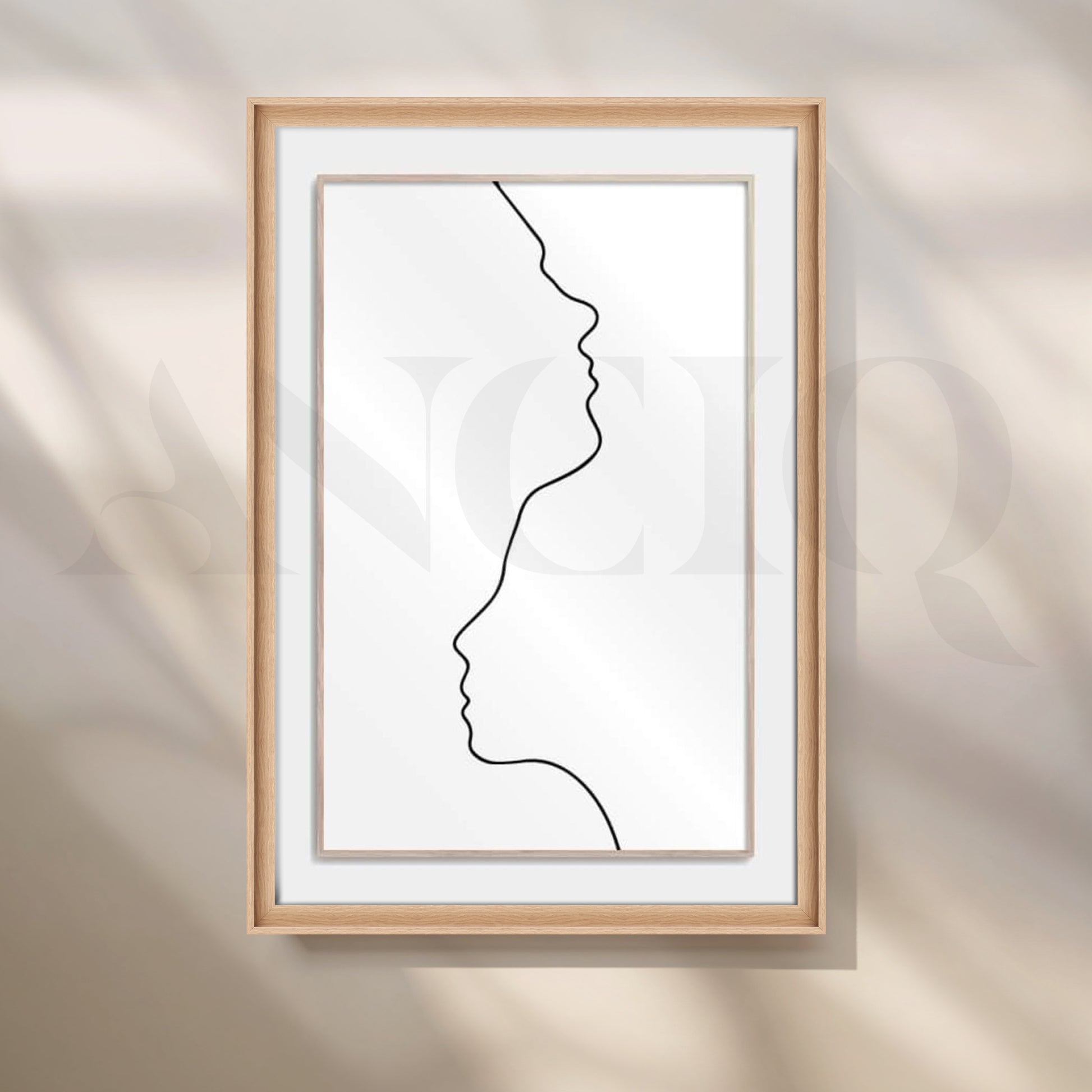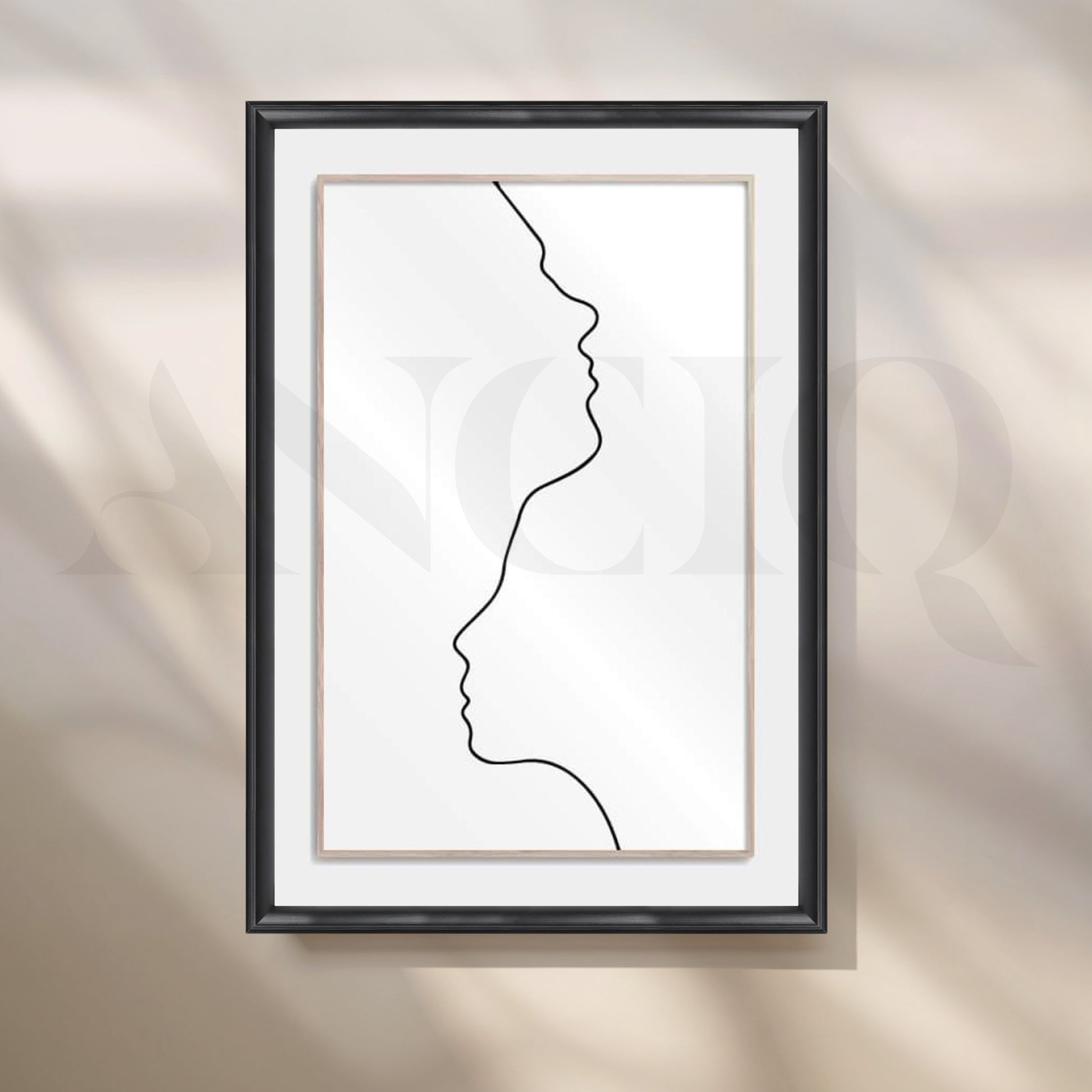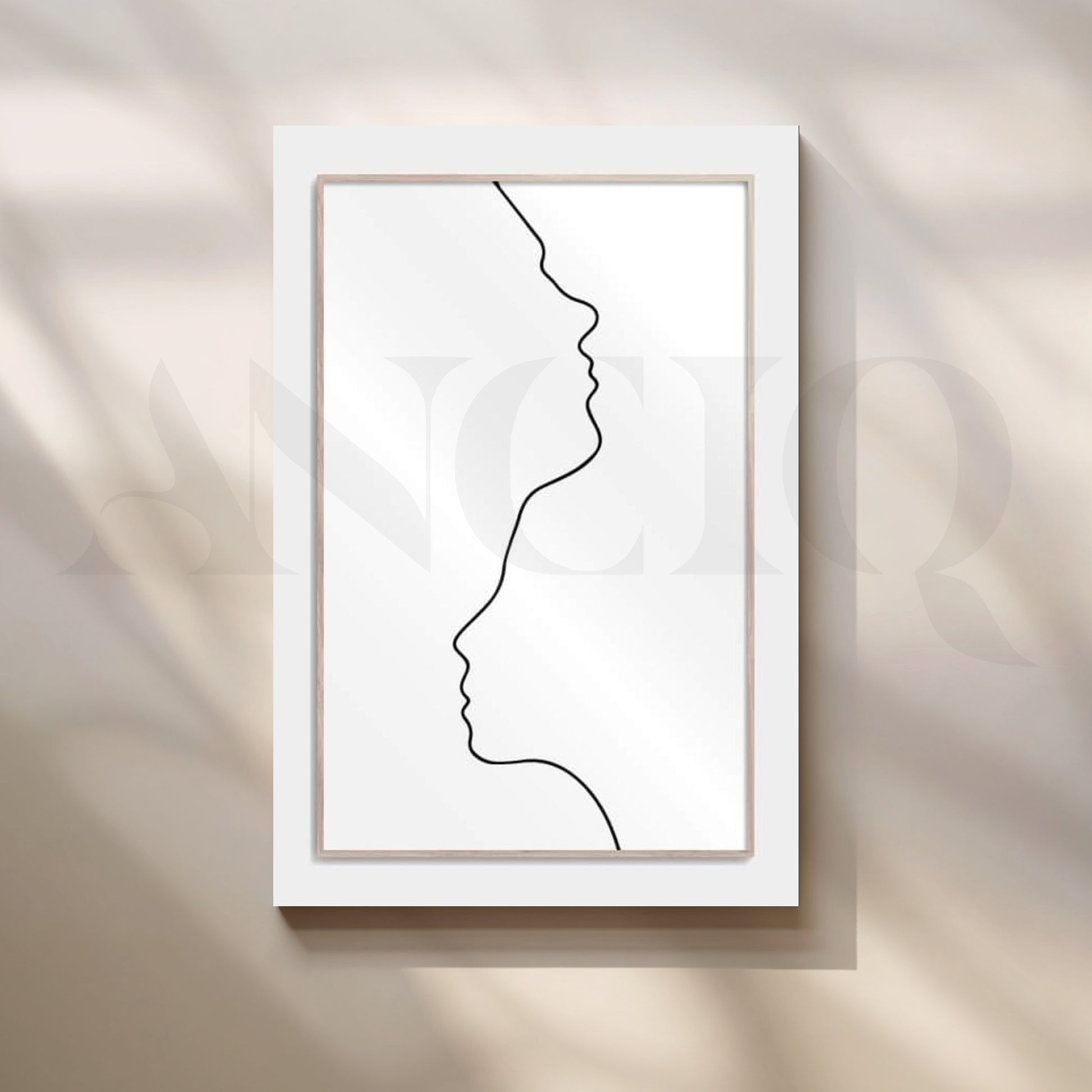 A modern line art canvas portraying two overlapping faces in profile, drawn in black on a crisp white background. This artistic line drawing brings contemporary flair to bedrooms and modern offices with minimalist elegance and artistic intrigue.