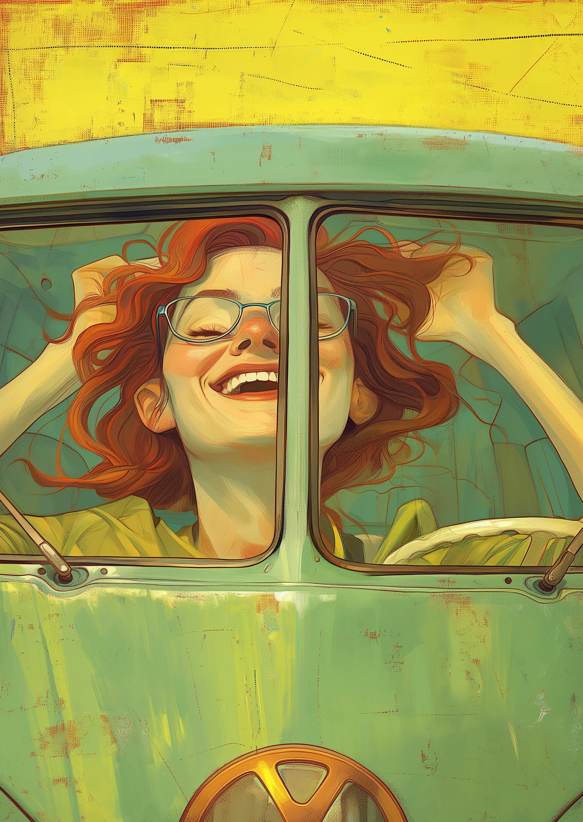 The Joyful Escape Wall Poster captures the blissful energy of carefree adventures, featuring a vibrant red-haired woman smiling radiantly as she leans out of a classic van window. The warm yellow and green tones add a nostalgic charm, making this artwork a perfect symbol of happiness and freedom.