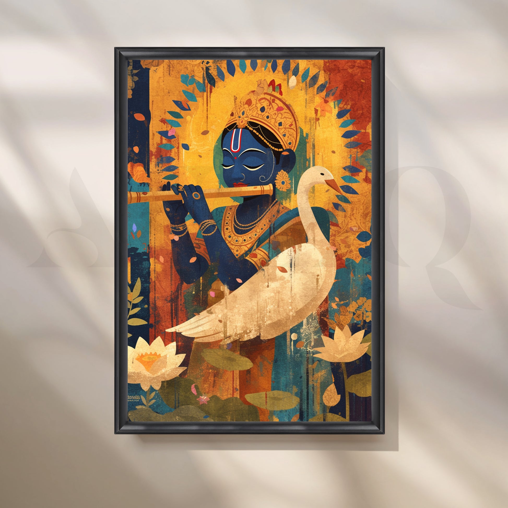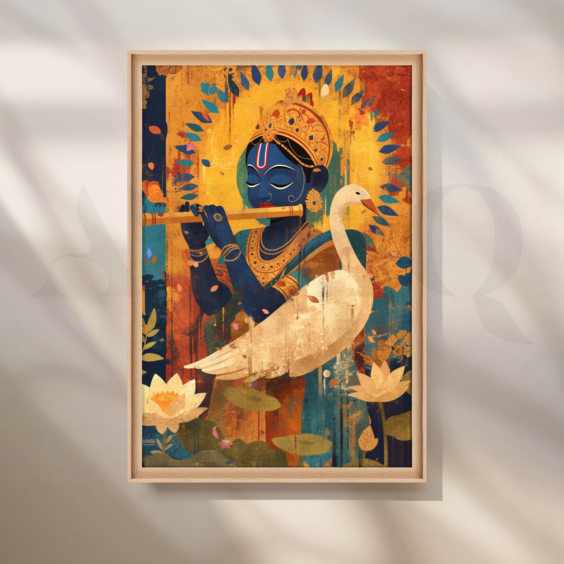 Krishna’s Swan Serenade Canvas Artwork for Pooja Room or Meditation Corner