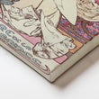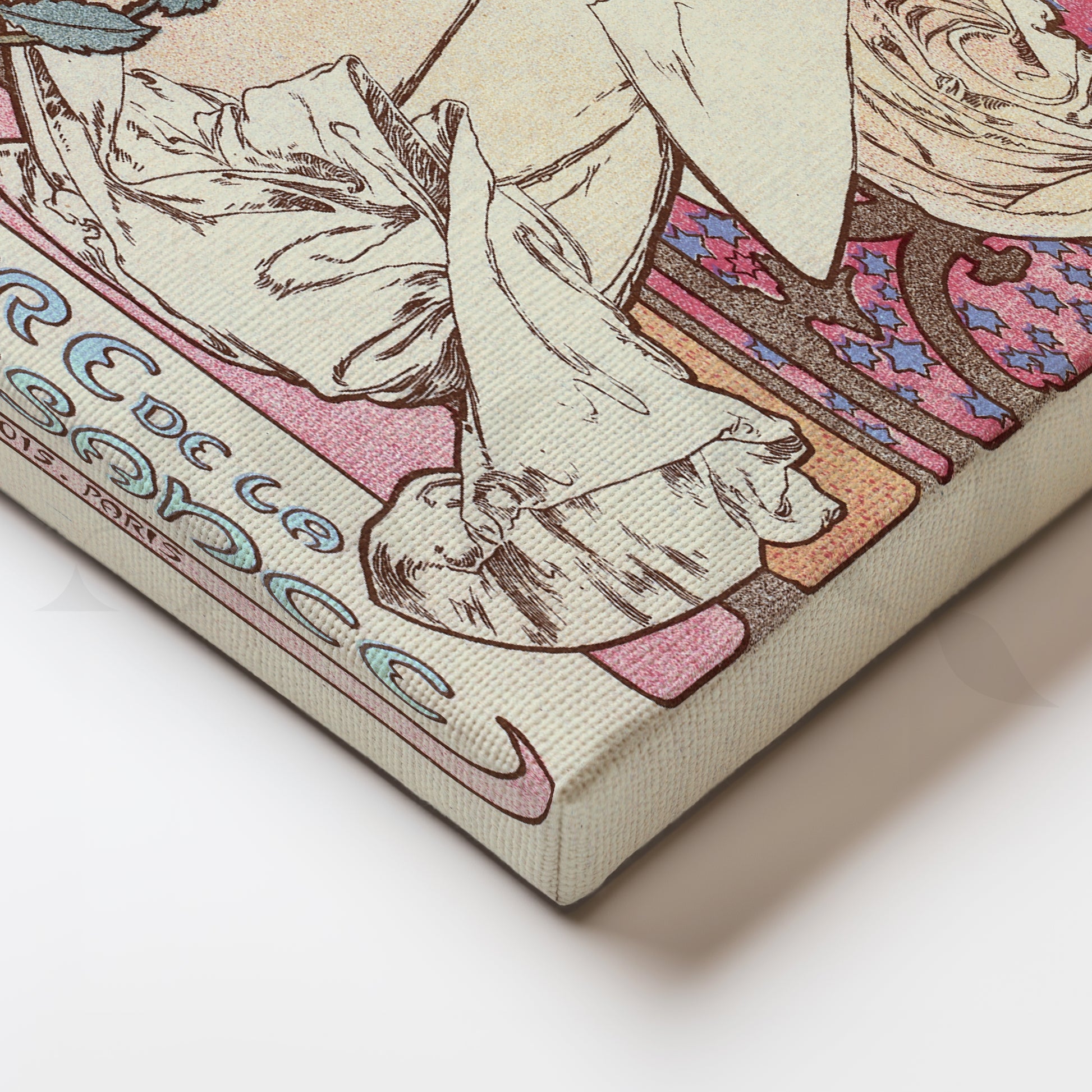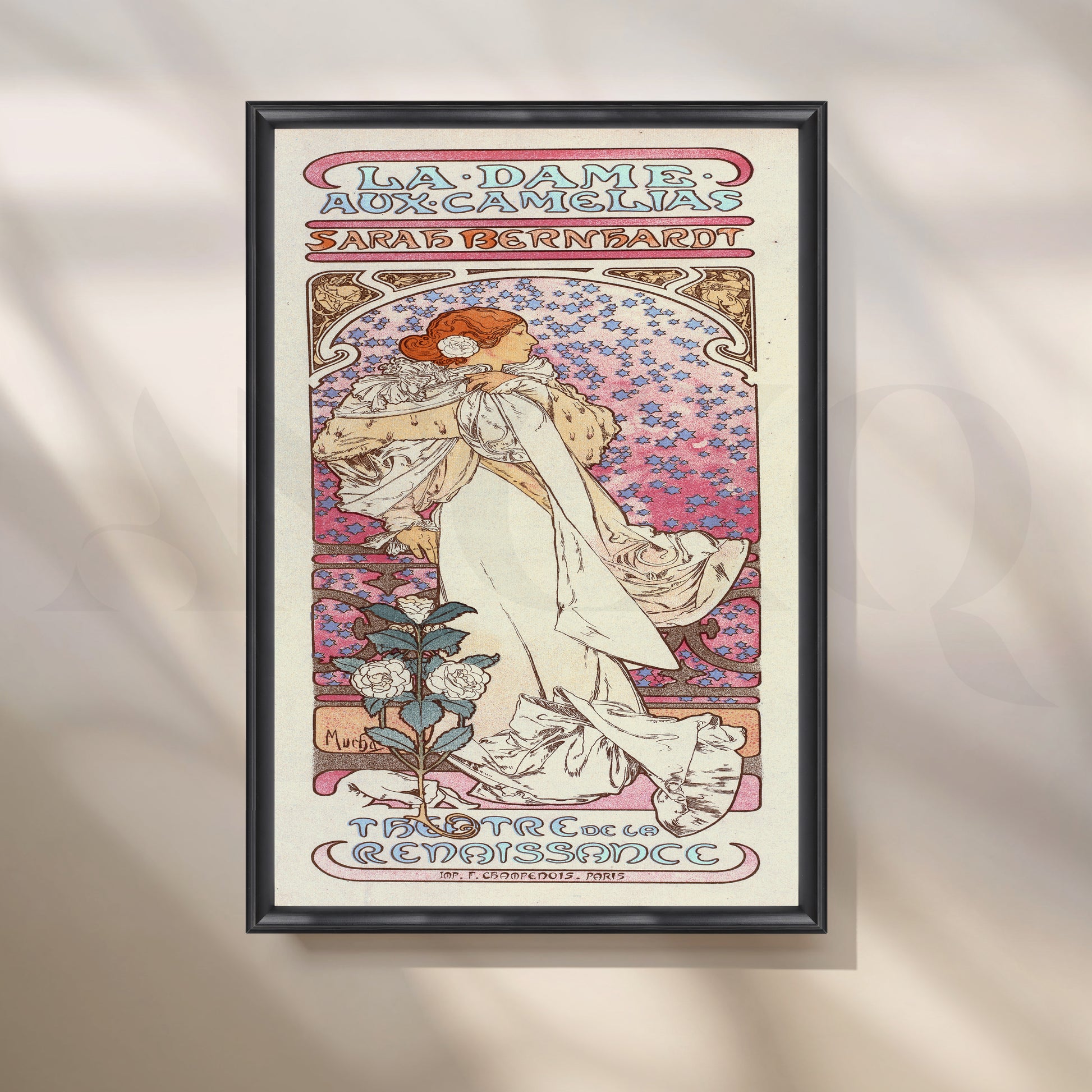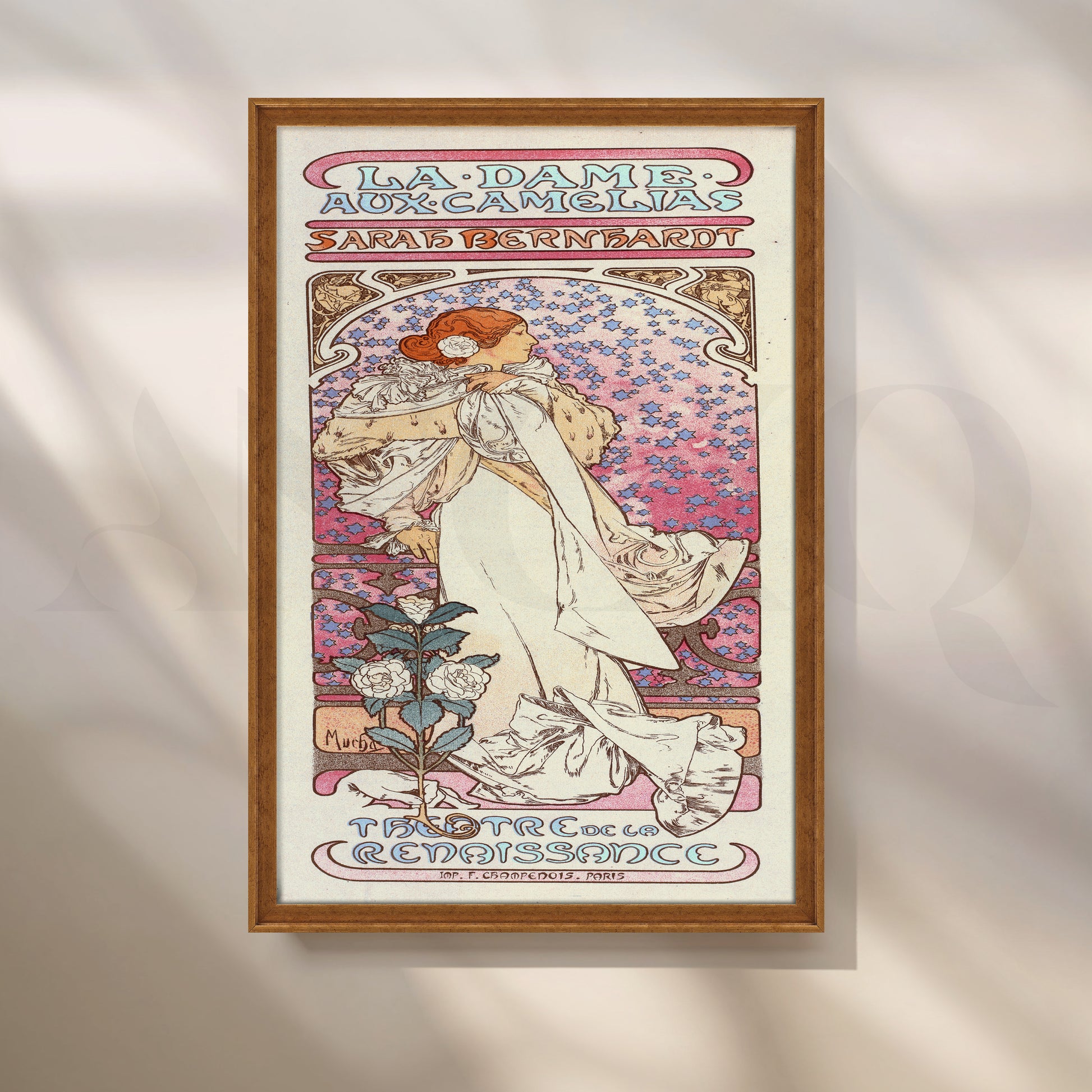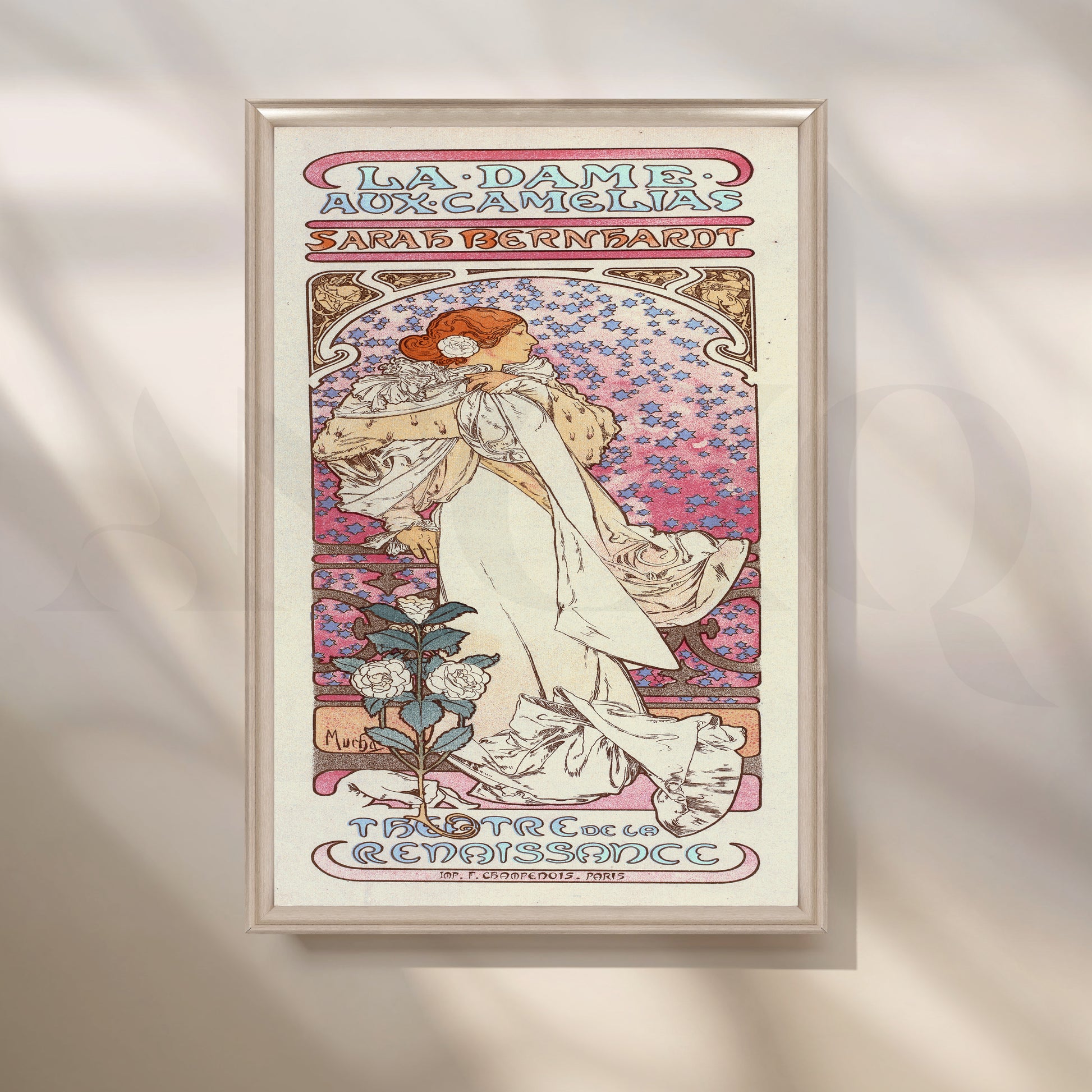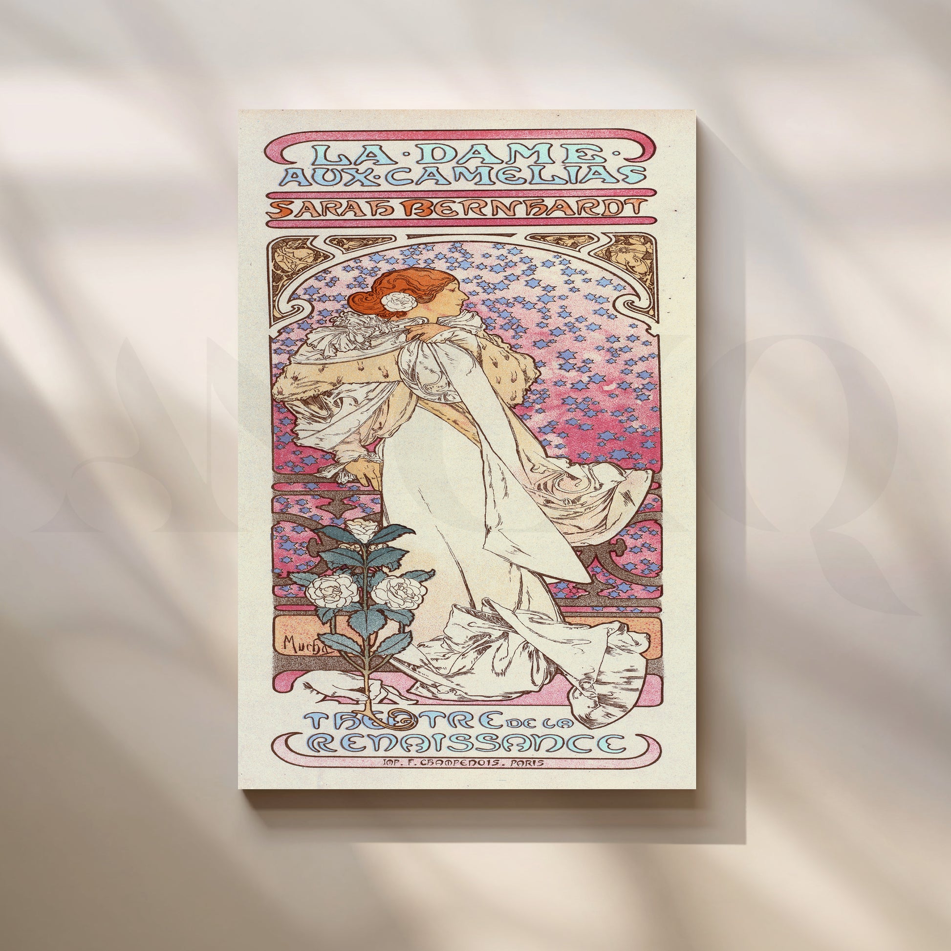 Pastel Art Nouveau poster with Sarah Bernhardt in a flowing ivory gown, soft pink-lilac mosaic backdrop, and delicate camellias—classic Mucha style. This vintage French wall art adds romantic elegance to bedrooms and dressing corners. Keywords: Art Nouveau wall art, Mucha poster canvas, La Dame aux Camélias print, Sarah Bernhardt poster, pastel pink artwork, floral vintage poster, vertical canvas for bedroom décor.