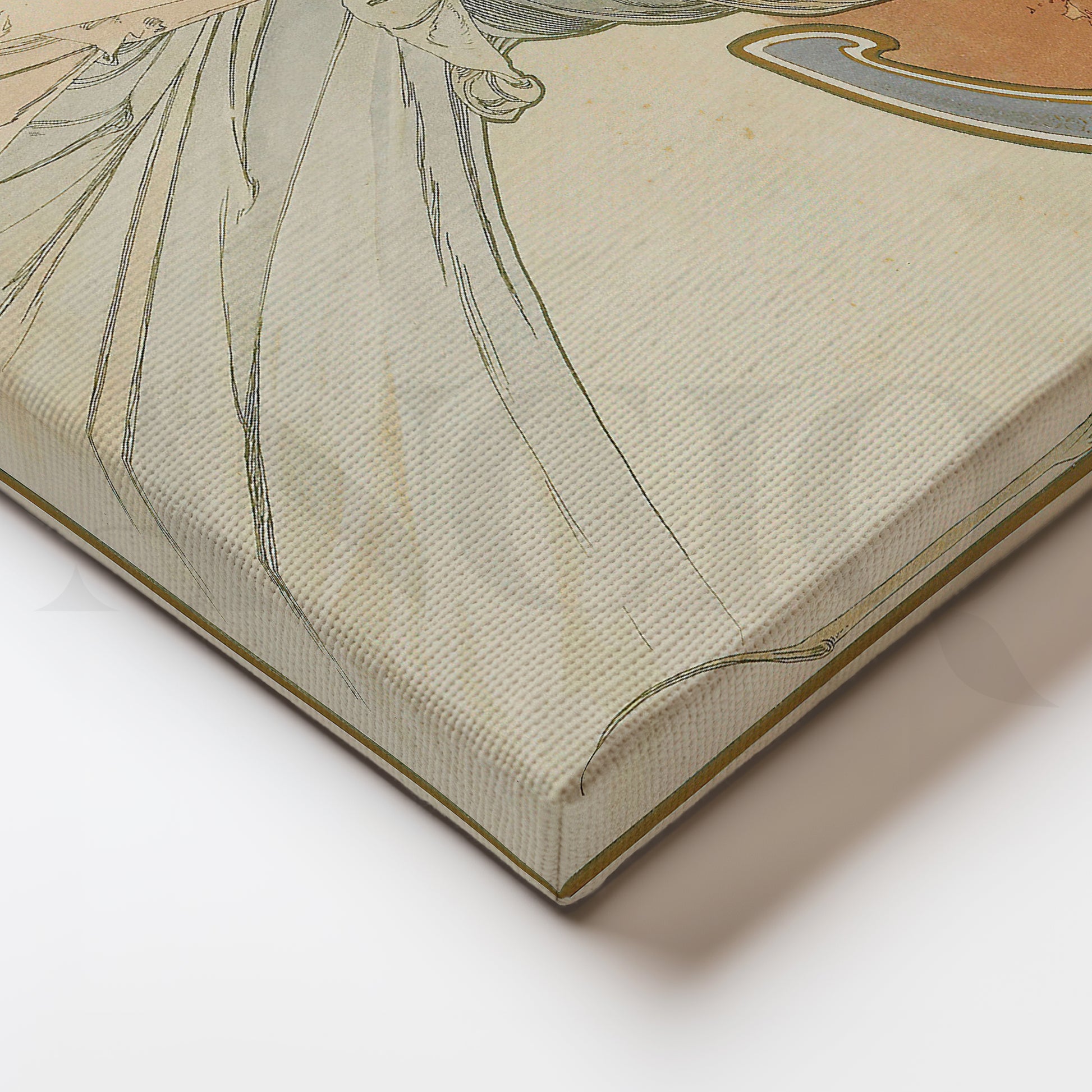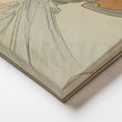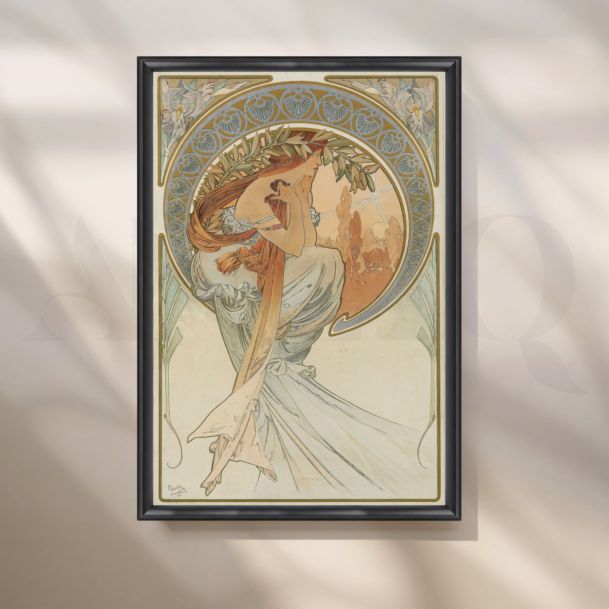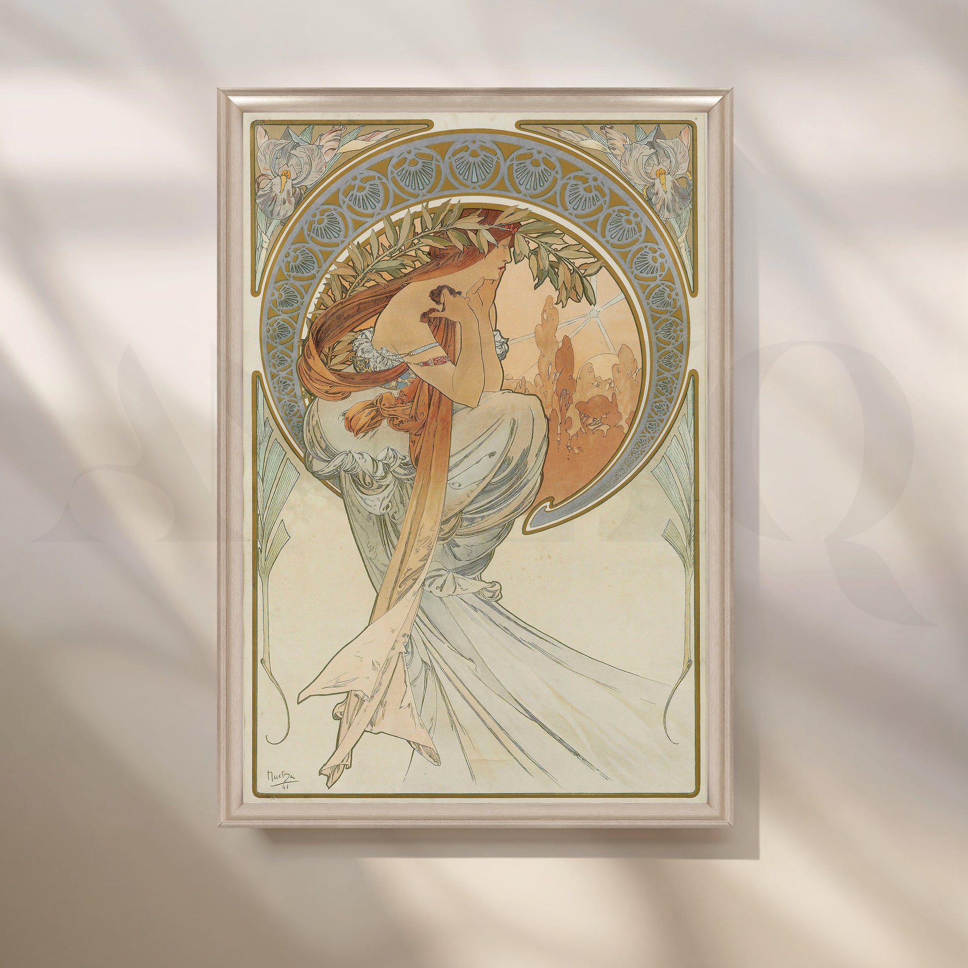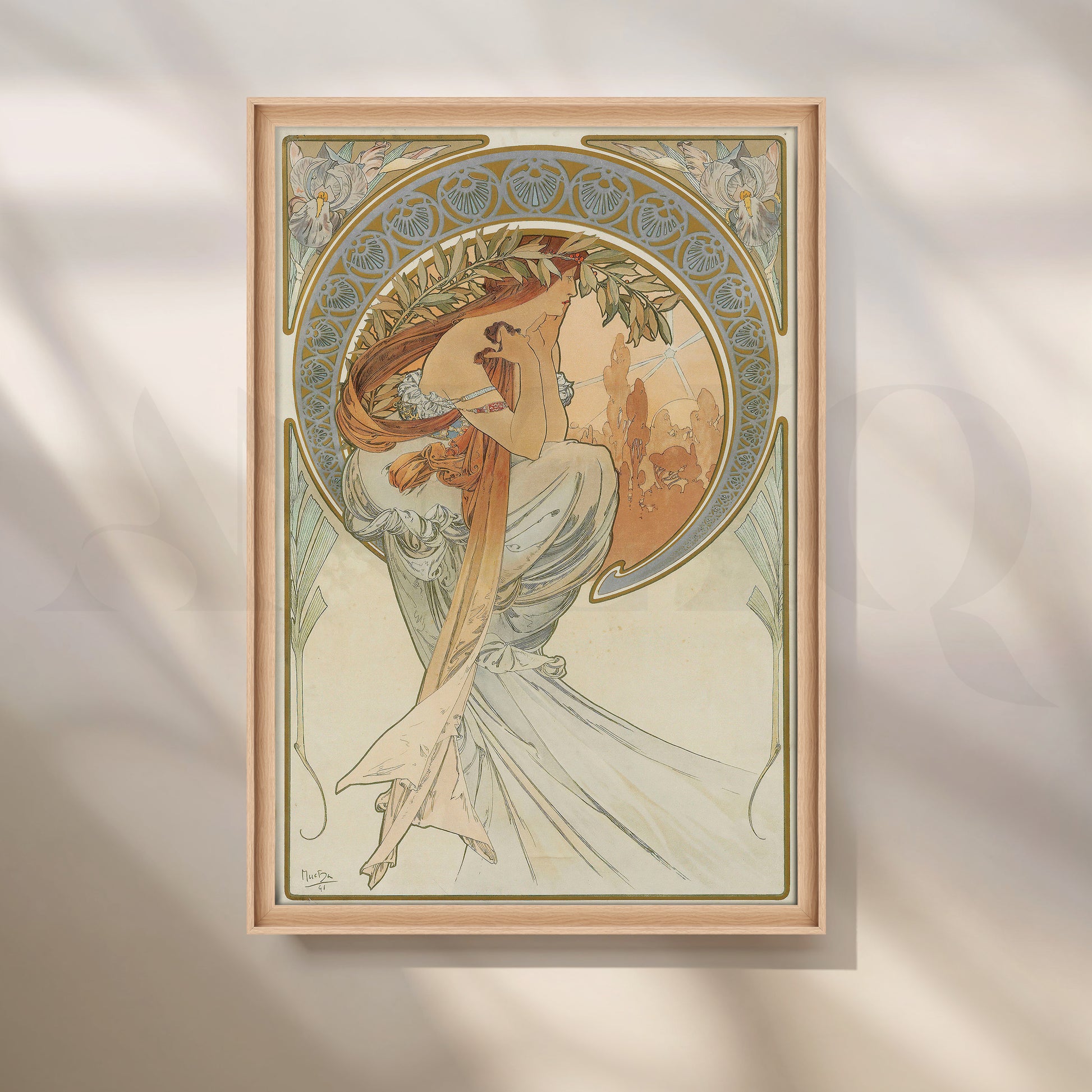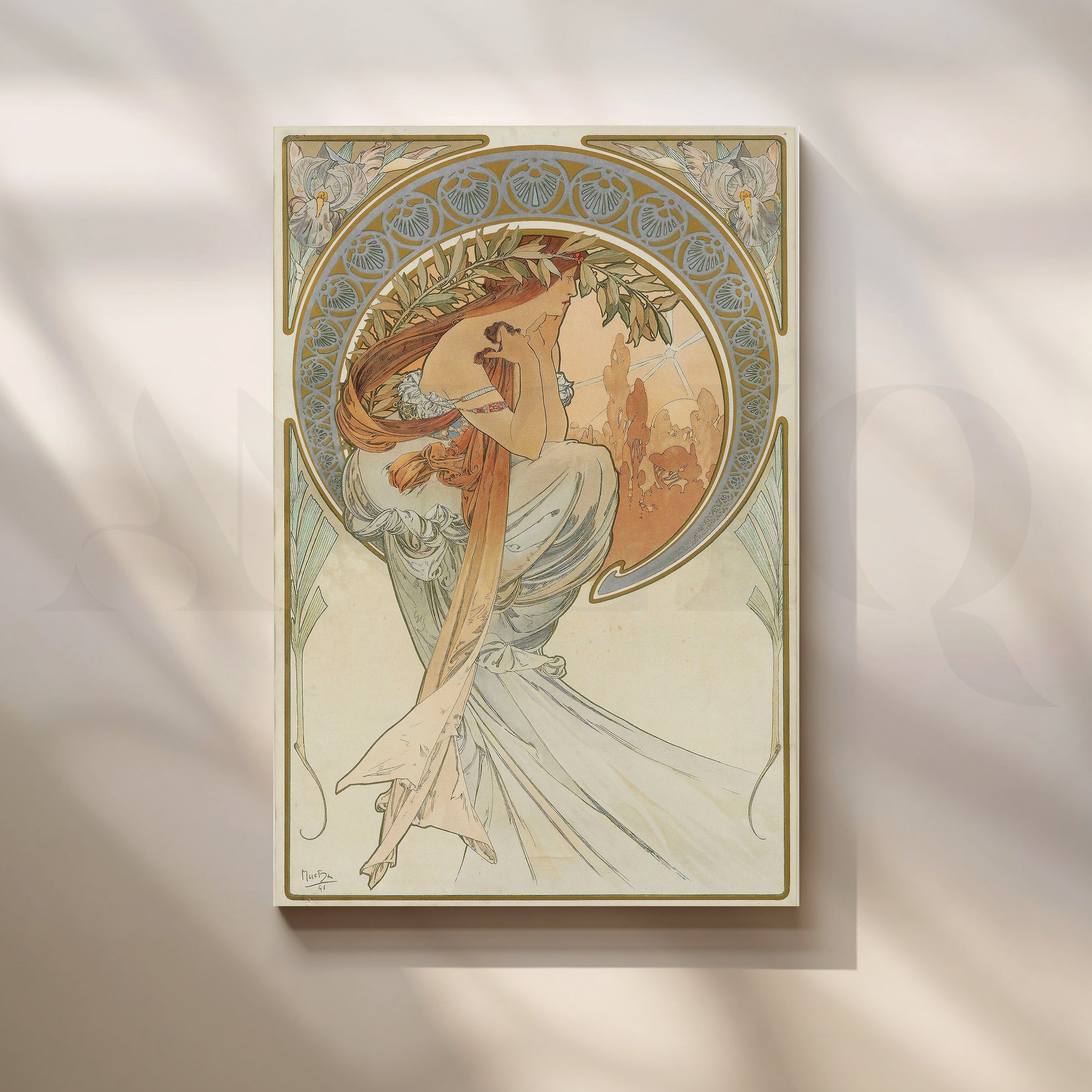 Ethereal Art Nouveau poster featuring a flowing-gowned muse framed by a circular laurel halo—soft peach, cream and sage tones with ornate linework in the Mucha style. Perfect for modern classic interiors. Keywords: Art Nouveau wall art, Mucha poster canvas, vintage French print, feminine bedroom artwork, pastel peach décor, laurel wreath artwork, vertical canvas for living room.