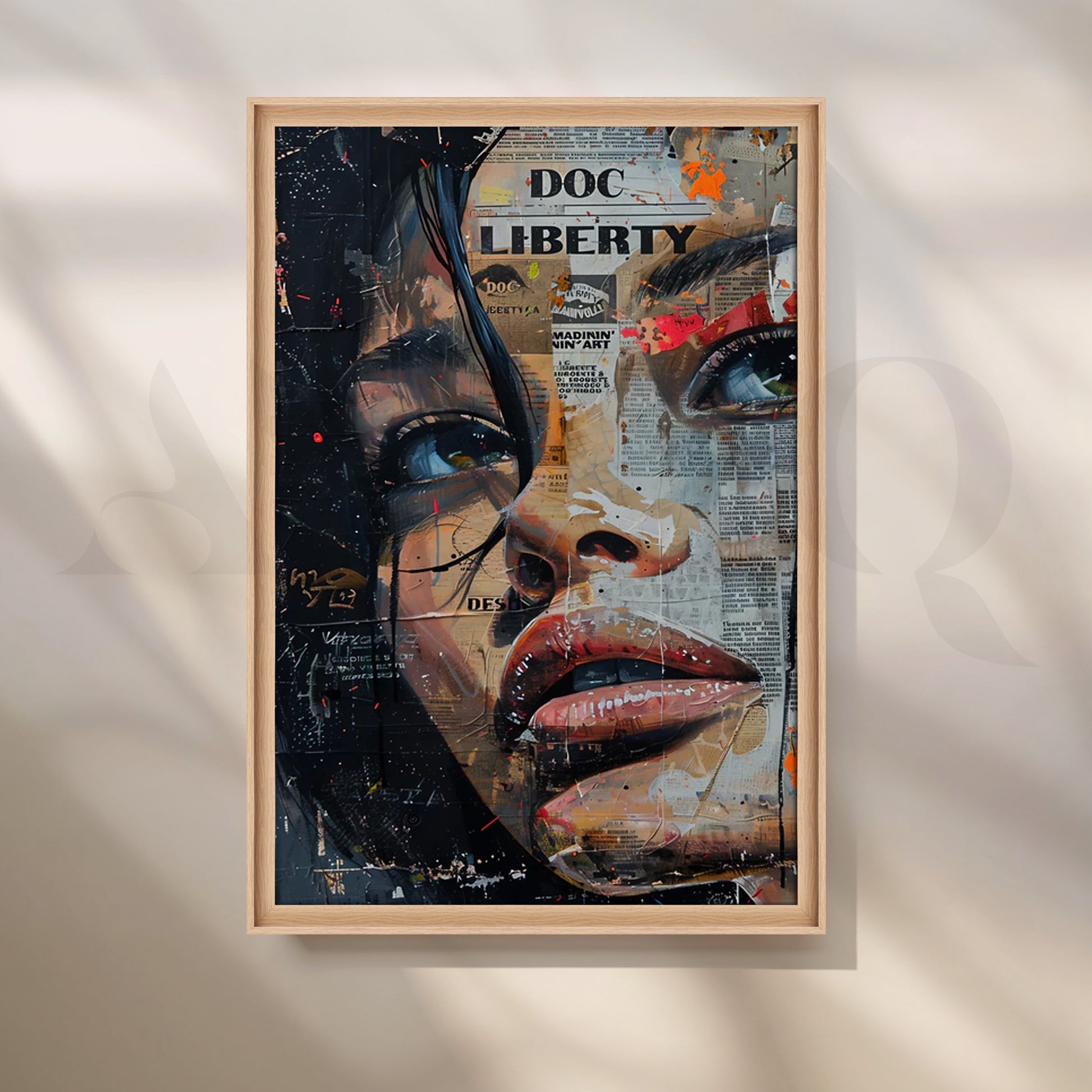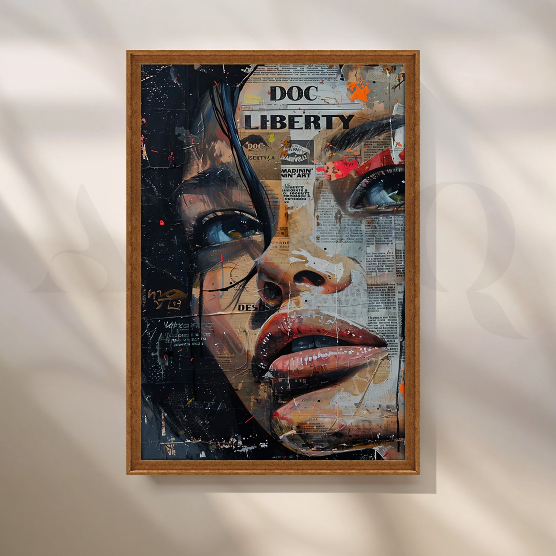 The Liberty Collage Wall Painting fuses realistic portraiture with layers of newspaper textures and urban graffiti elements. This dynamic composition creates a bold narrative, blending modern expression with vintage charm. A striking piece for contemporary interiors.