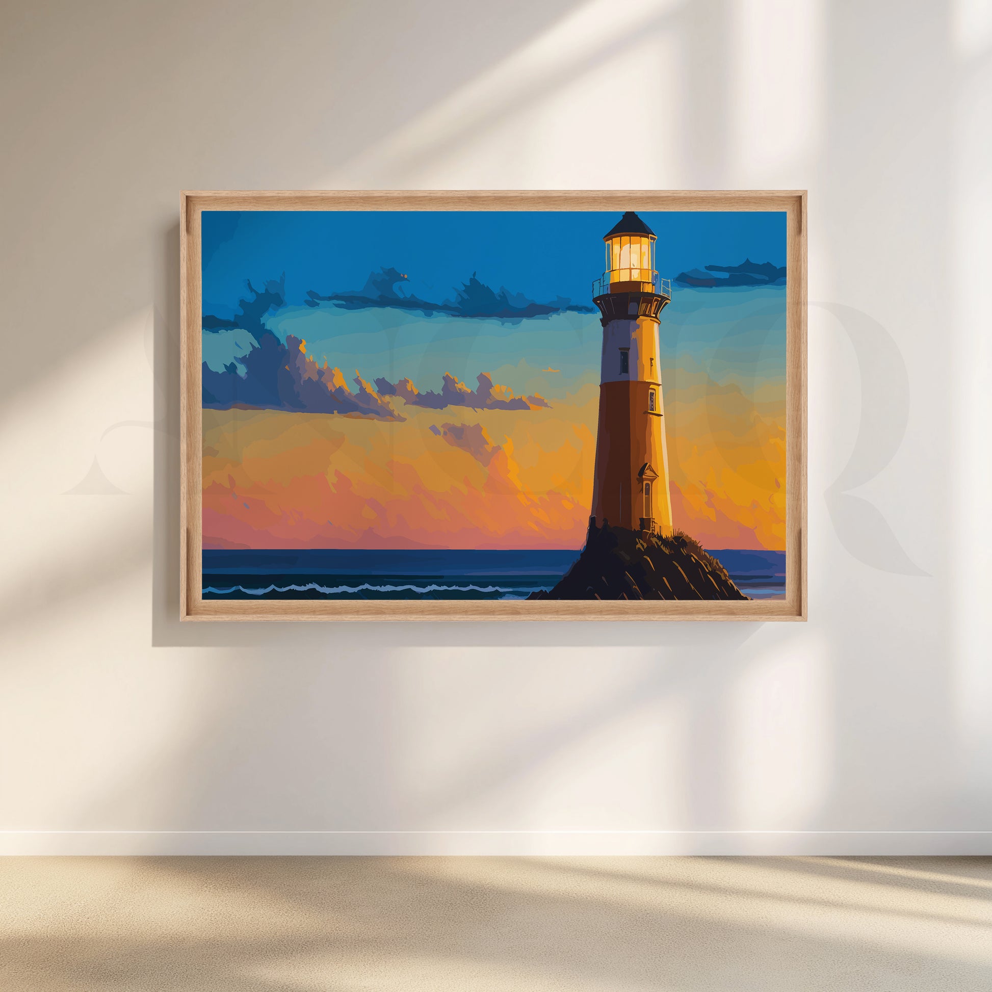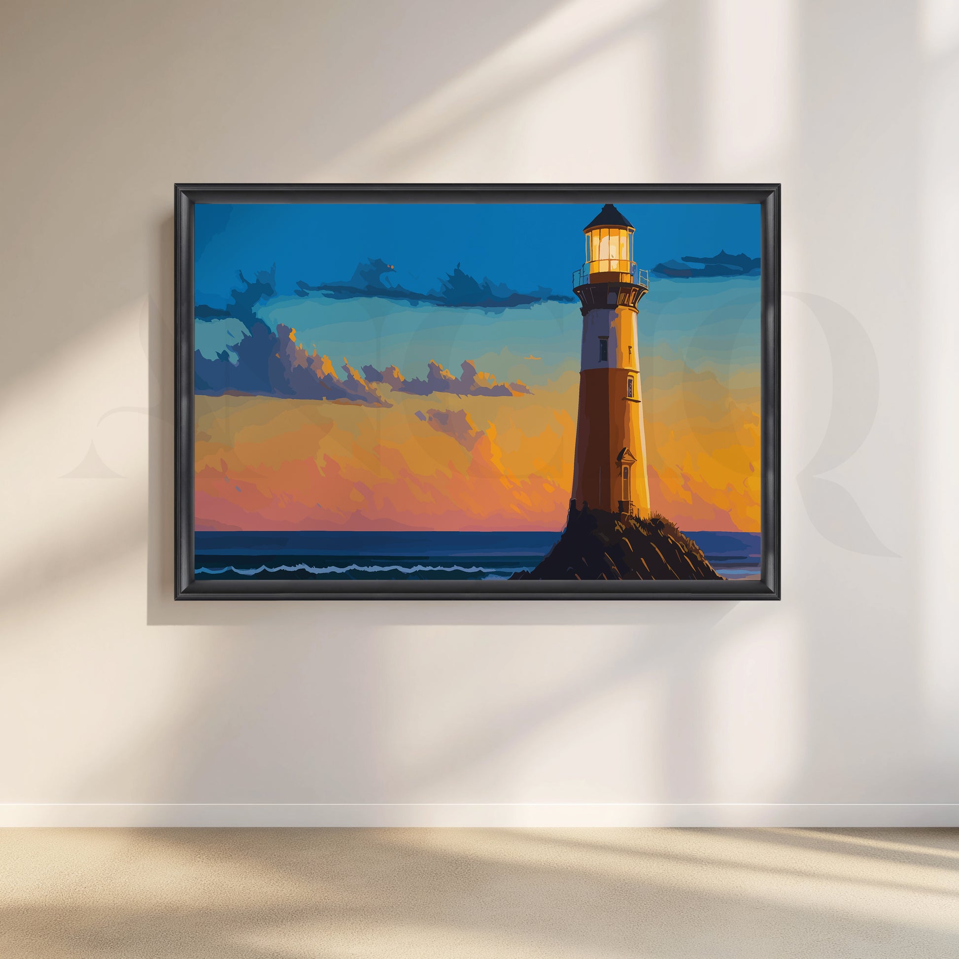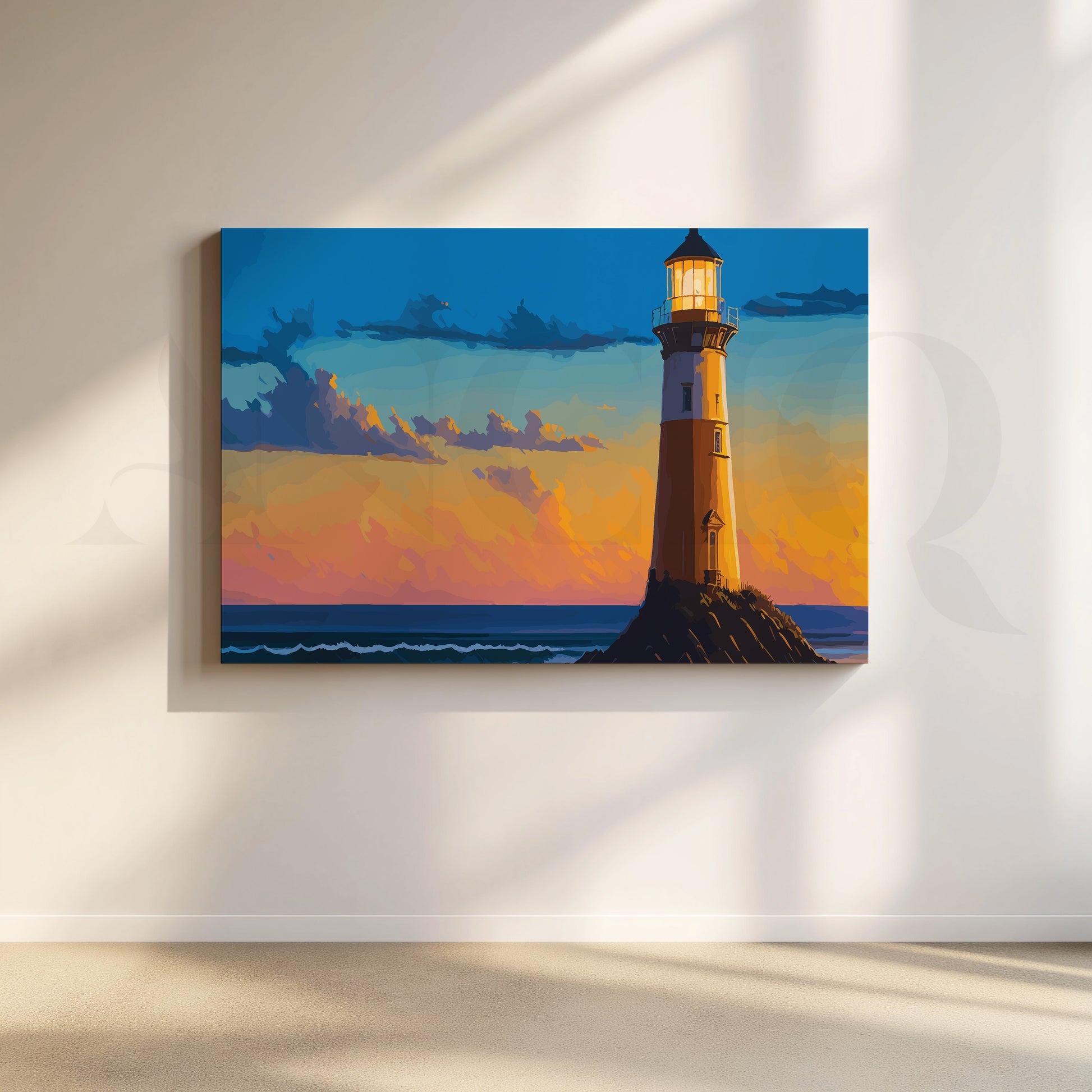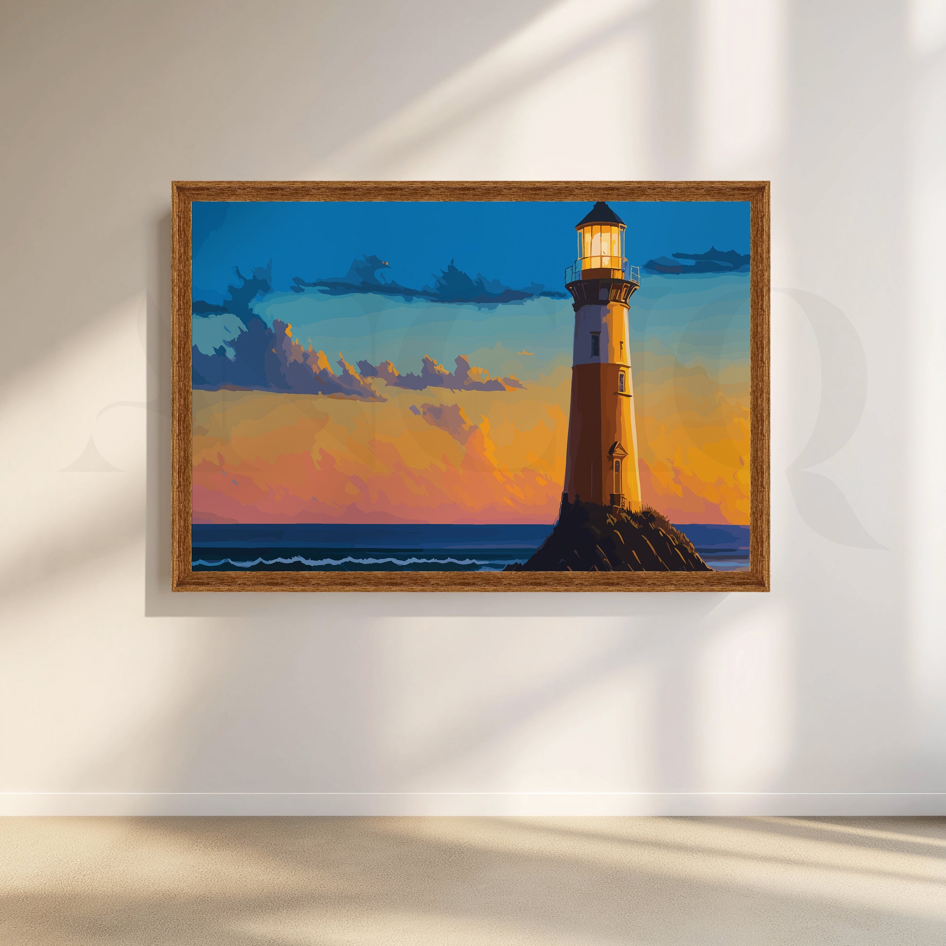 Immerse yourself in the serenity of "Tranquil Twilight." This captivating painting captures the soft hues of a beach at dusk, where a solitary lighthouse stands guard, guiding the way. Each brushstroke evokes a sense of peace, perfect for creating a calming atmosphere in your home.