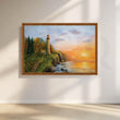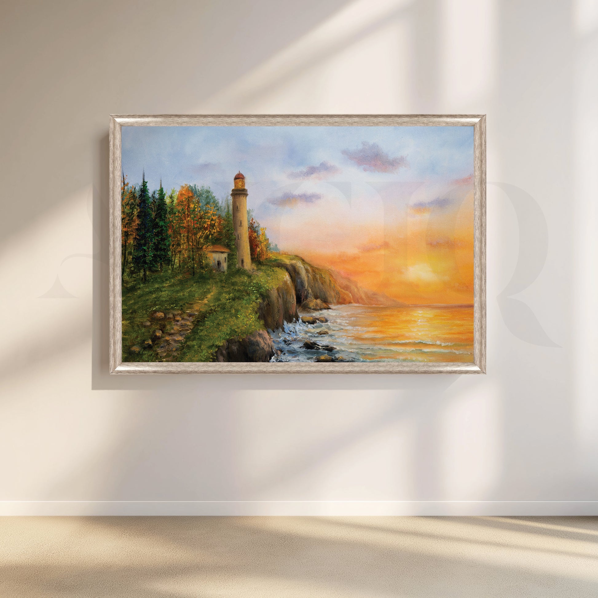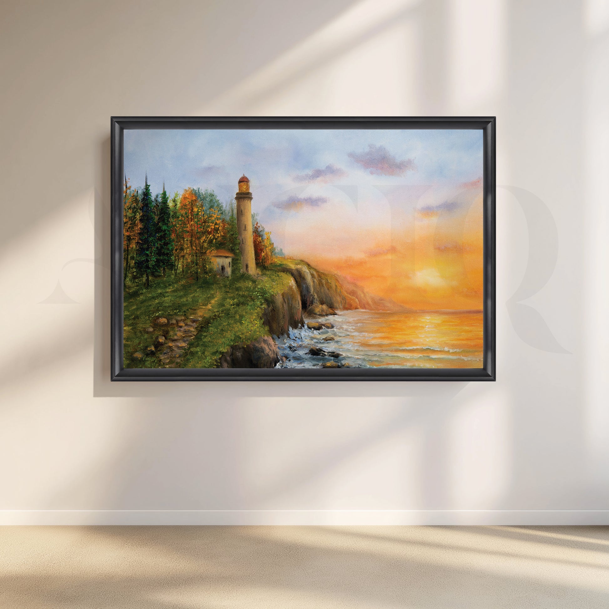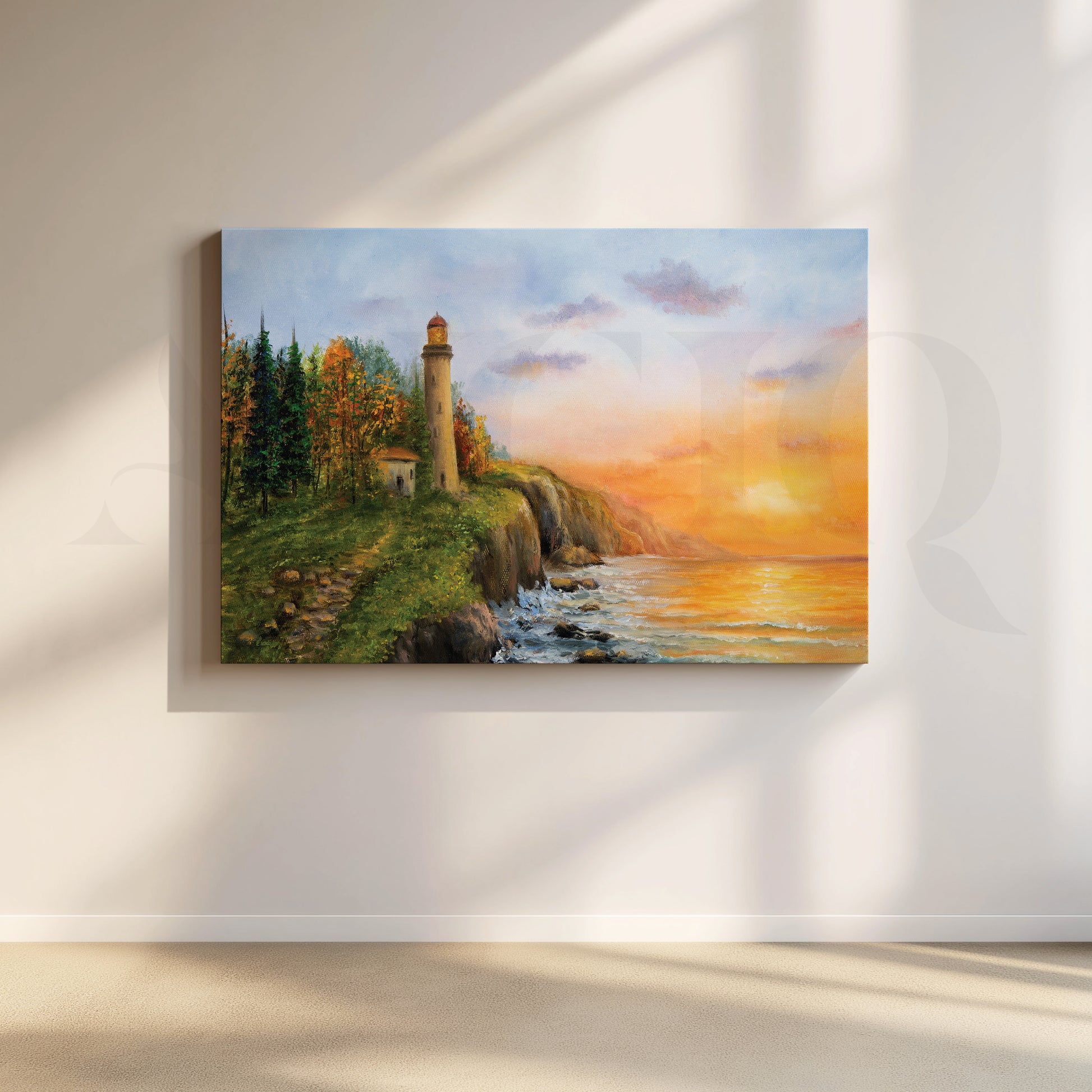 Capture the serenity of a coastal sunset with this captivating beach painting. Warm hues of gold and orange wash over the canvas, mirrored in the calm ocean waves. A lone lighthouse stands sentinel, guiding the way under a sky ablaze with color. This one-of-a-kind piece brings the tranquility of the seashore straight to your walls.