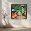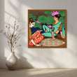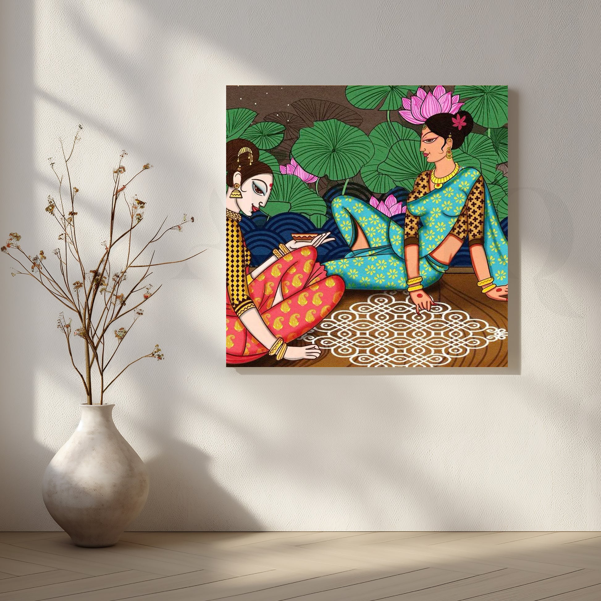 This lotus courtyard women traditional canvas art portrays two Indian women in colourful sarees creating rangoli under blooming lotuses. Detailed patterns and bright hues make this canvas wall art perfect for bedroom, living room or festive décor. A beautiful Indian folk-style painting, it brings warmth, culture and celebration to any contemporary or ethnic space.