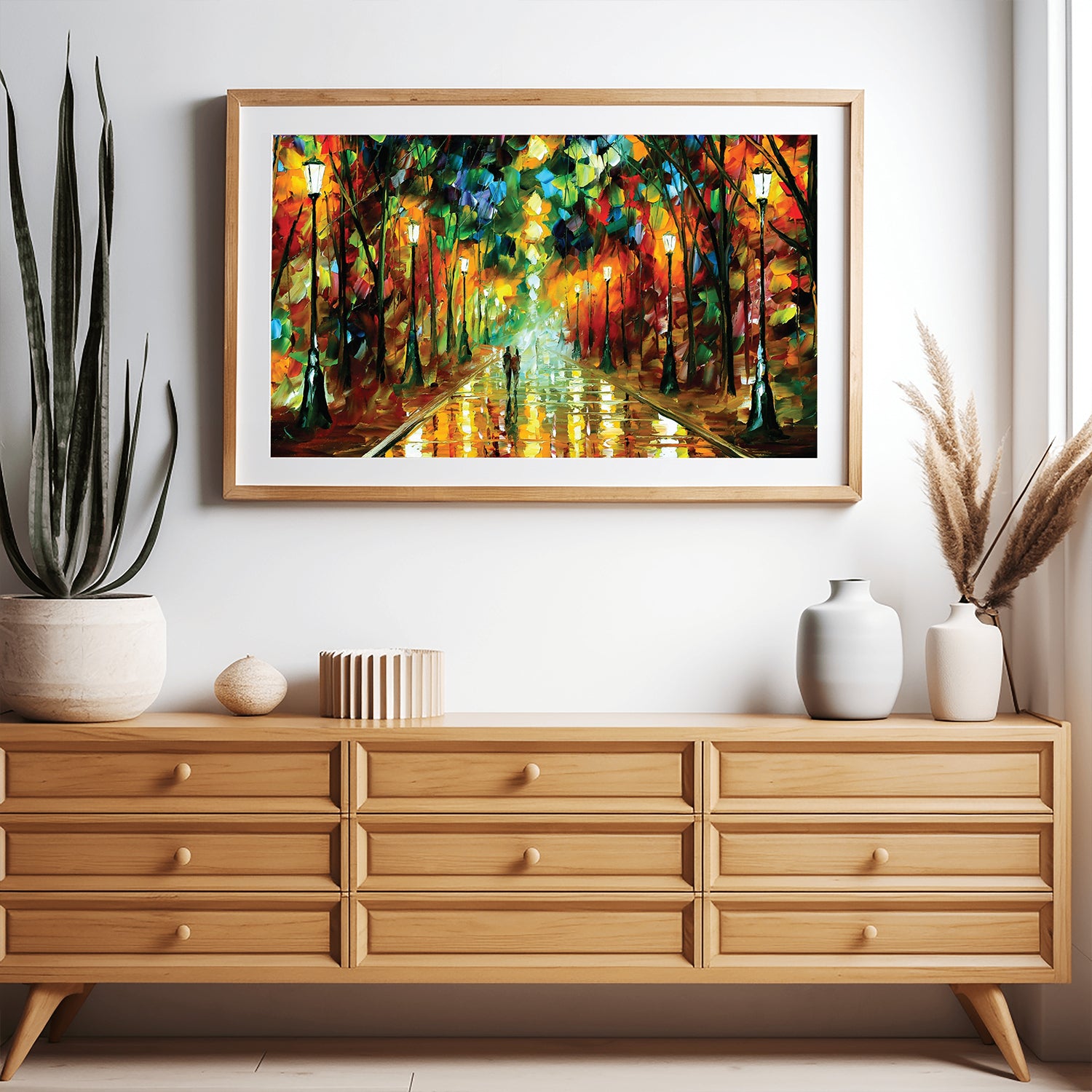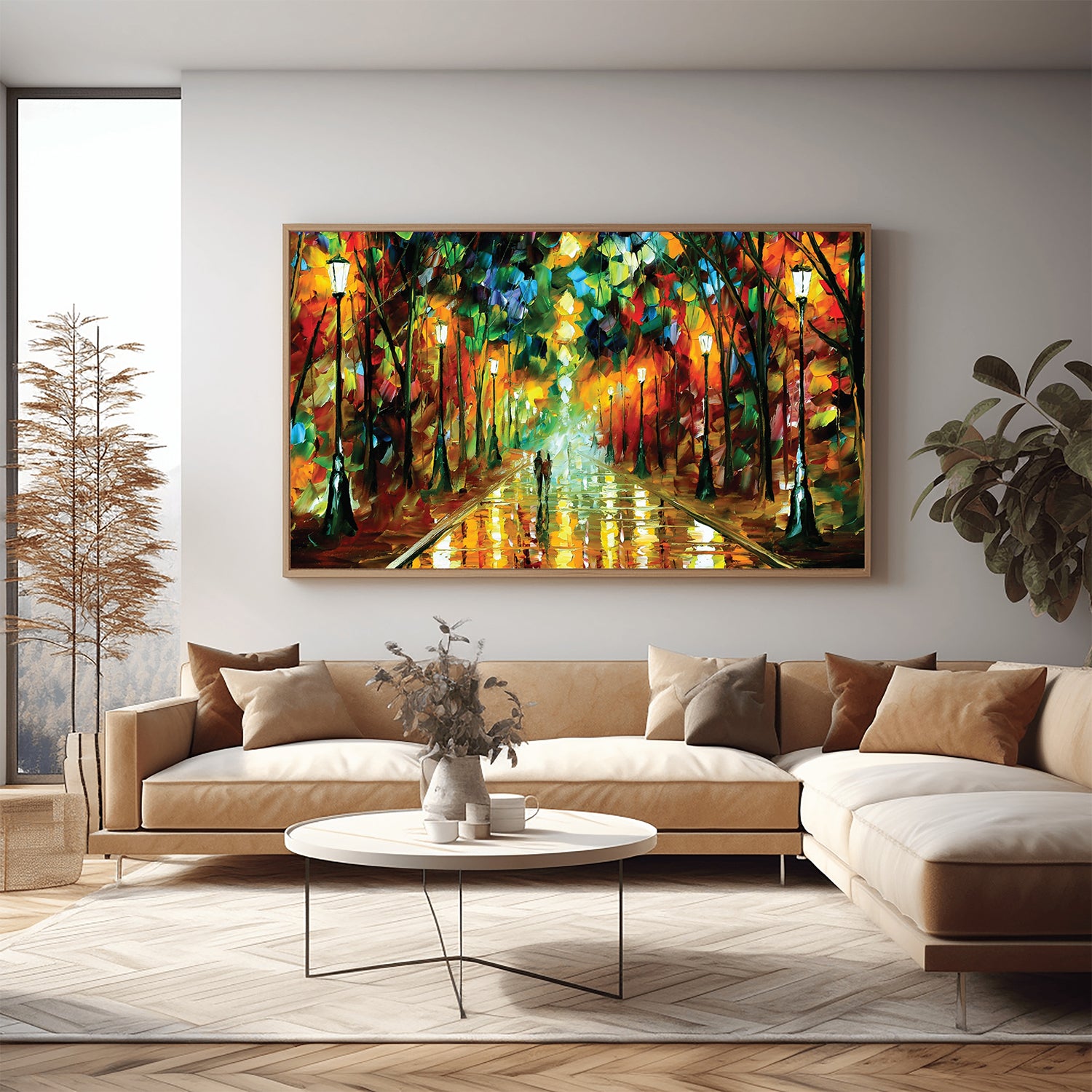The "Love Amidst the Abstract Storm Canvas Wall Painting" is a vibrant abstract piece featuring swirling colors and gestural brushstrokes. It is likely inspired by the work of Leonid Afremov, a Russian impressionist painter known for his use of a palette knife and impasto technique. This painting would be a beautiful addition to any home and is sure to add a touch of energy and conversation to any room.