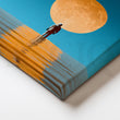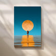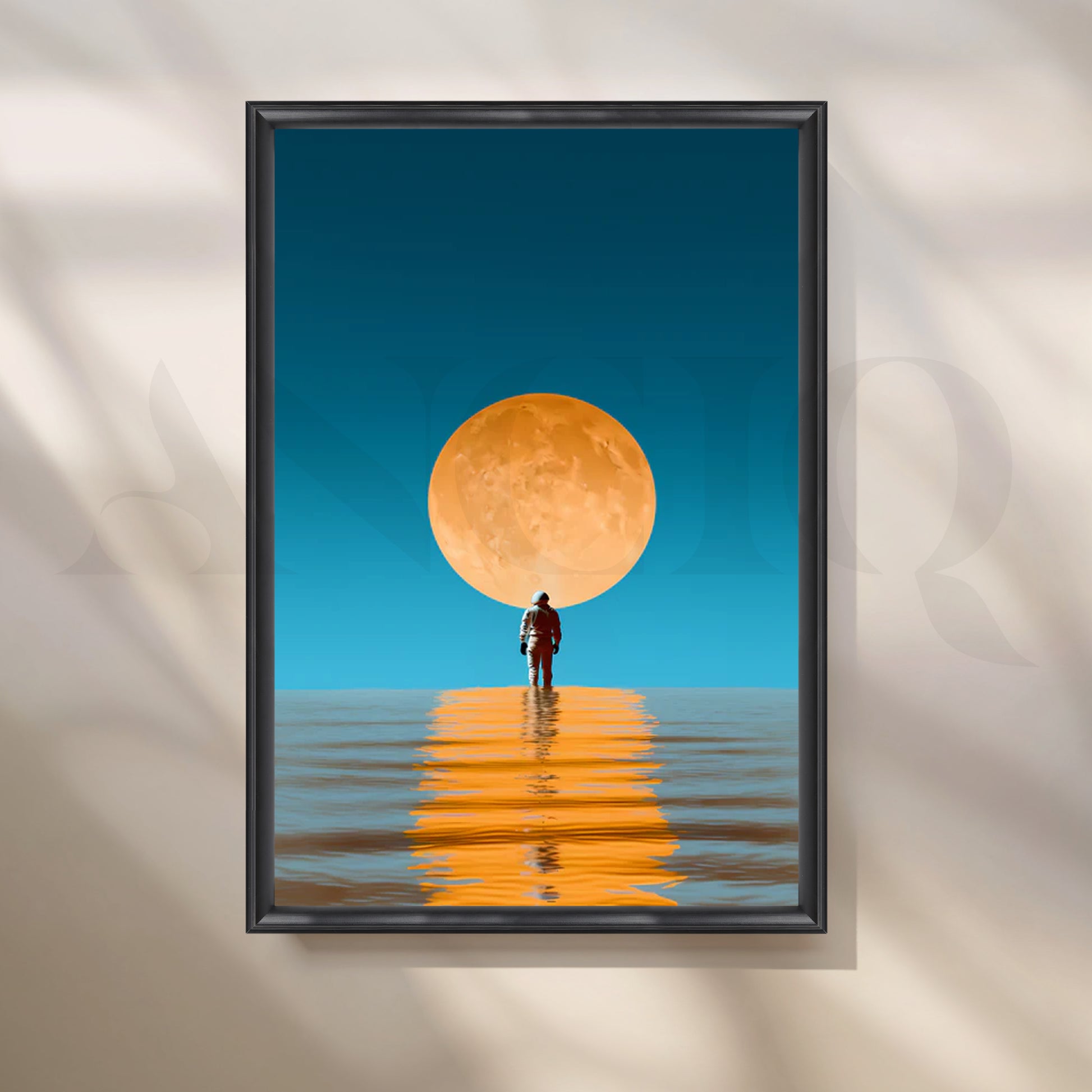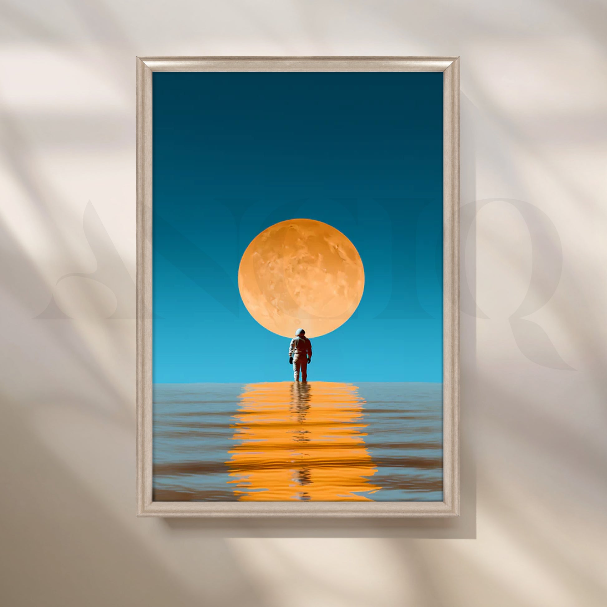 A lone astronaut stands at the water’s edge as an oversized amber moon lifts from a turquoise sky, casting a molten-gold path across glassy waves. Minimal, dreamy, and cinematic, this piece adds calm adventure to modern spaces—perfect for bedrooms, offices, and creative studios. Palette: deep teal, sunset orange, and soft steel blue for striking contrast.