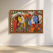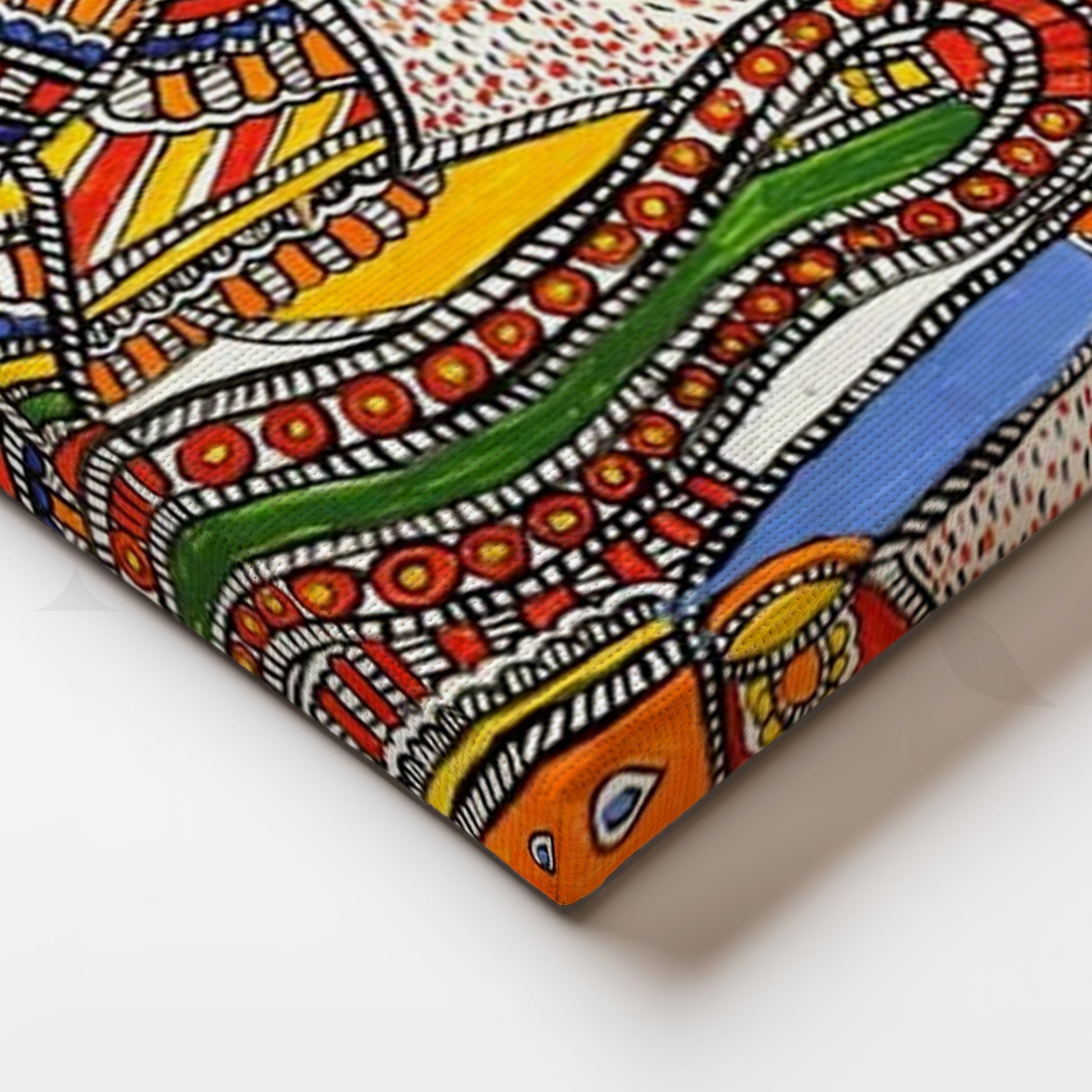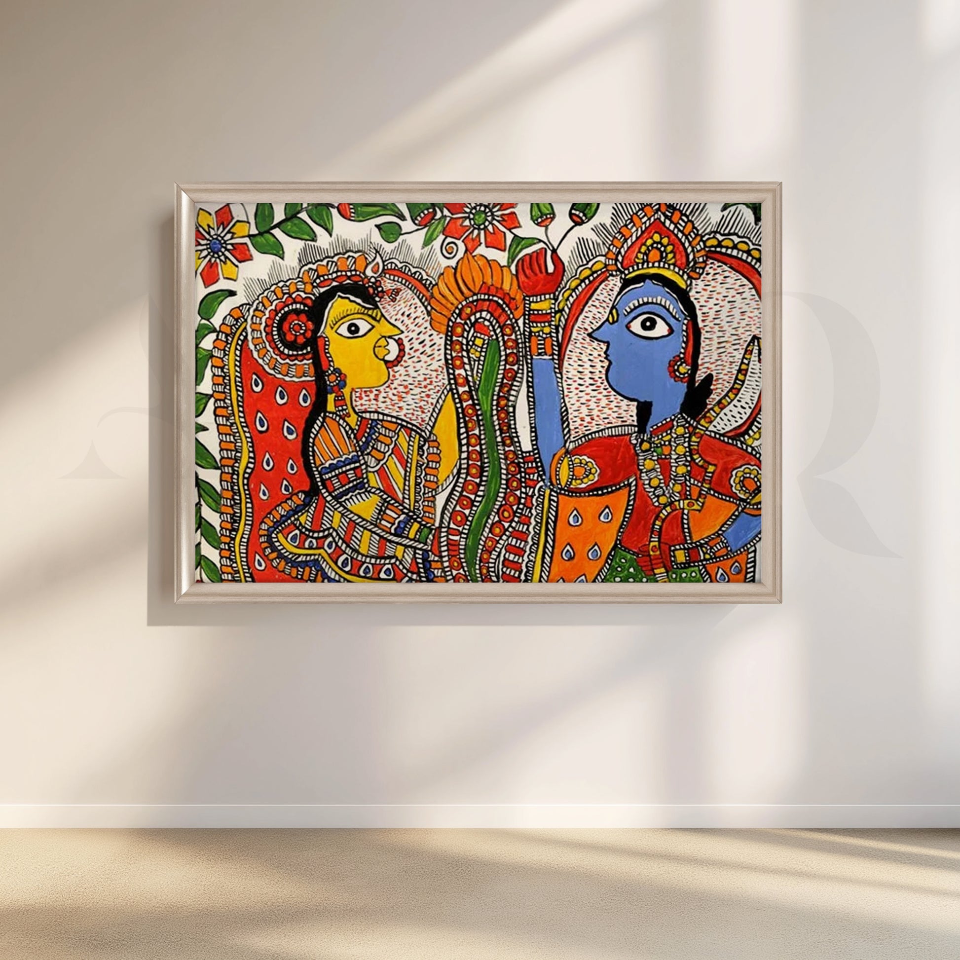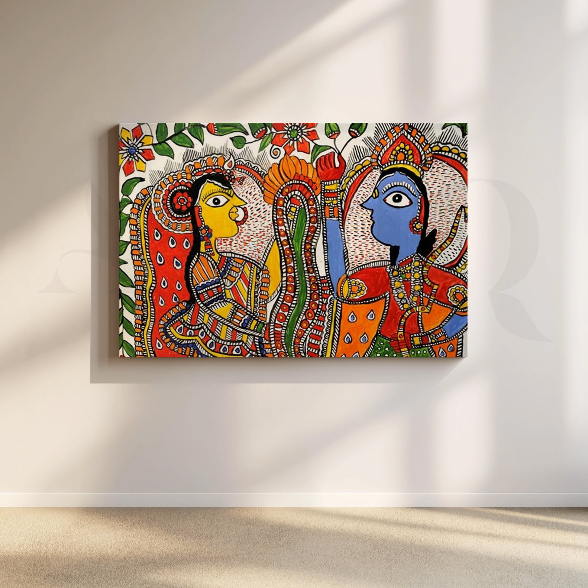 Inspired by Madhubani folk art, this canvas artwork portrays a beautifully detailed divine couple with intricate patterns and bold colors. The traditional motifs and floral borders make it striking Indian wall art for bedrooms, pooja rooms, studios, and ethnic restaurants. Ideal for adding spiritual, handcrafted charm to homes that love mythological and cultural décor.