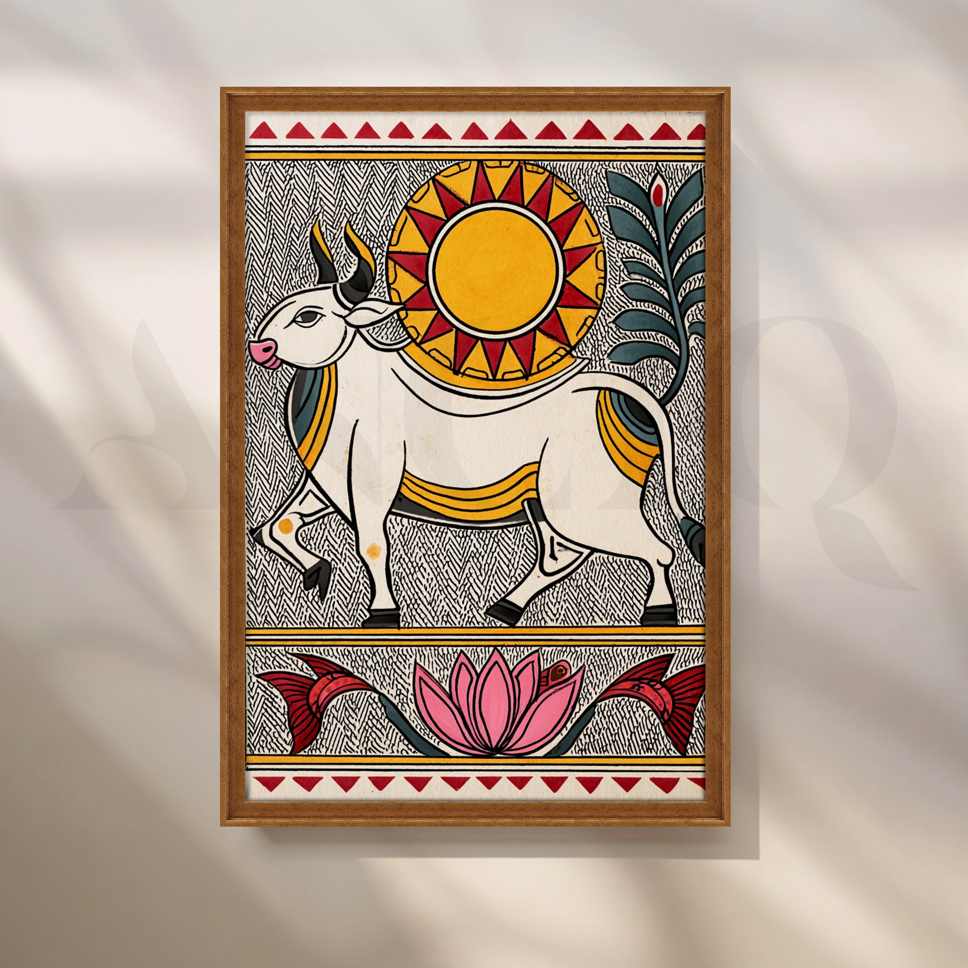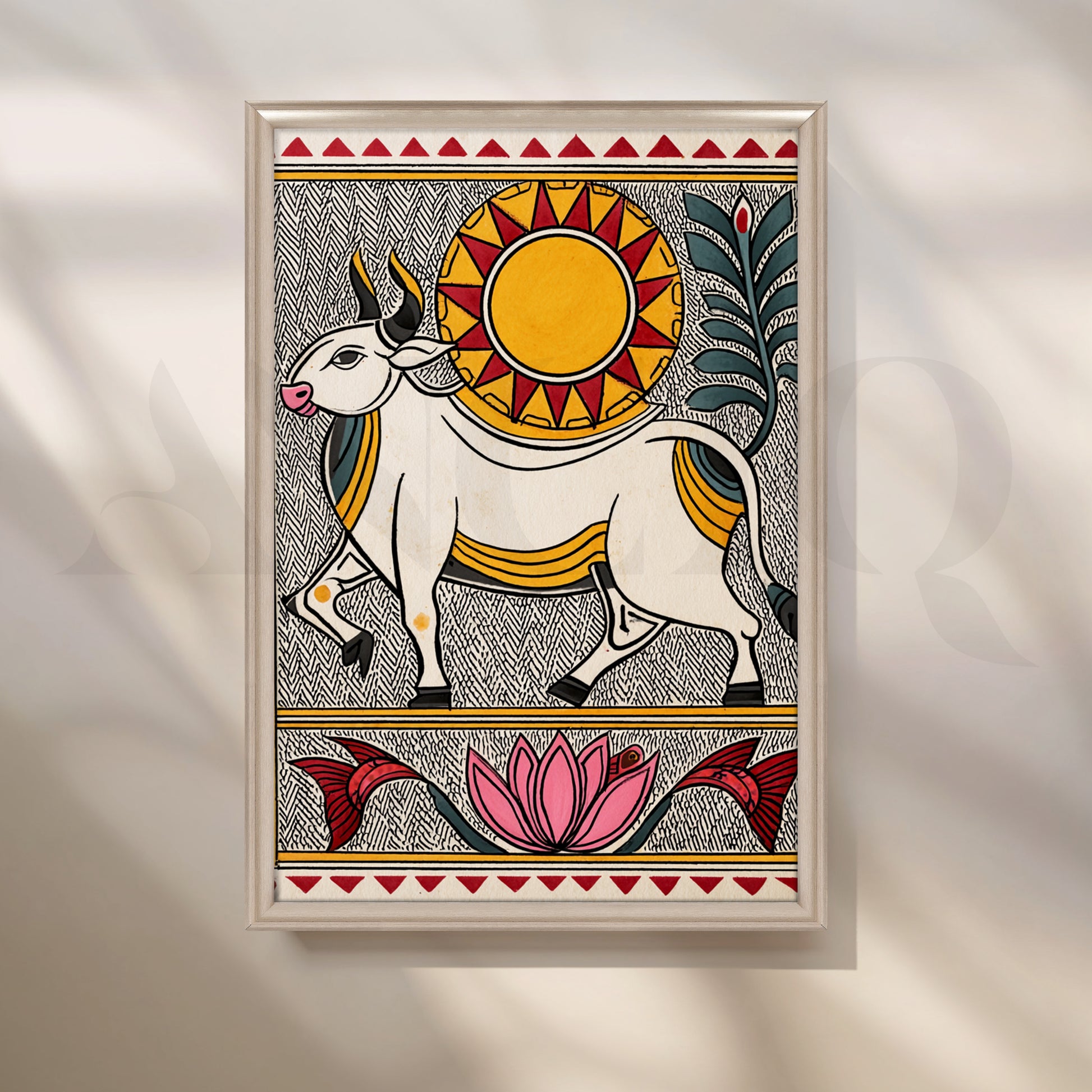 A radiant white bull strides beneath a golden sun and lotus in classic Madhubani linework and primary hues. A symbol of strength and prosperity, this framed-look canvas brings auspicious charm to prayer spaces, foyers and hallways. Keywords: Madhubani art, Nandi bull painting, auspicious wall decor, Indian traditional folk art, temple room artwork, cultural canvas print, handcrafted pattern design.