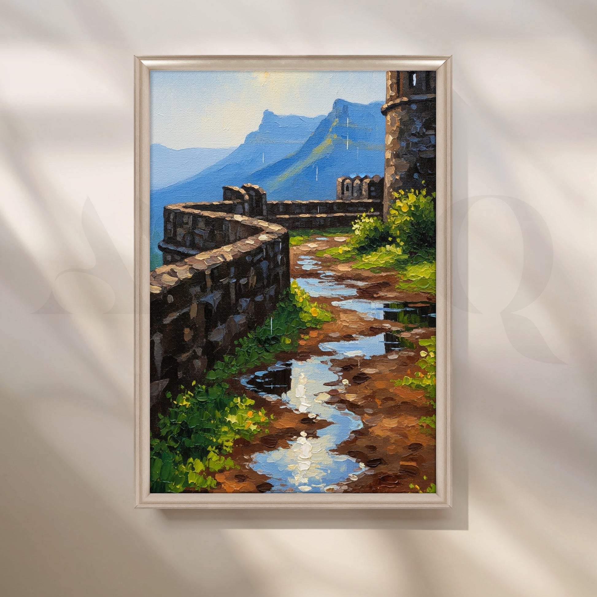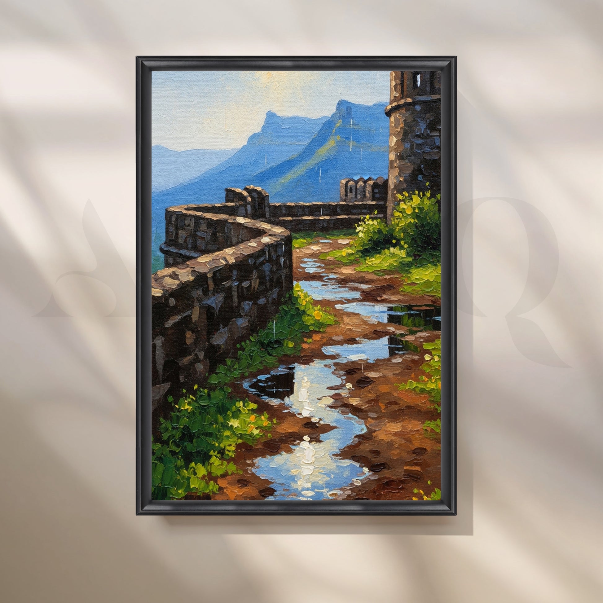 This breathtaking canvas painting captures an ancient fort pathway after rainfall, surrounded by misty mountains. Perfect for adding calm and adventure to your living room or office, it evokes India’s heritage and natural beauty in one frame.