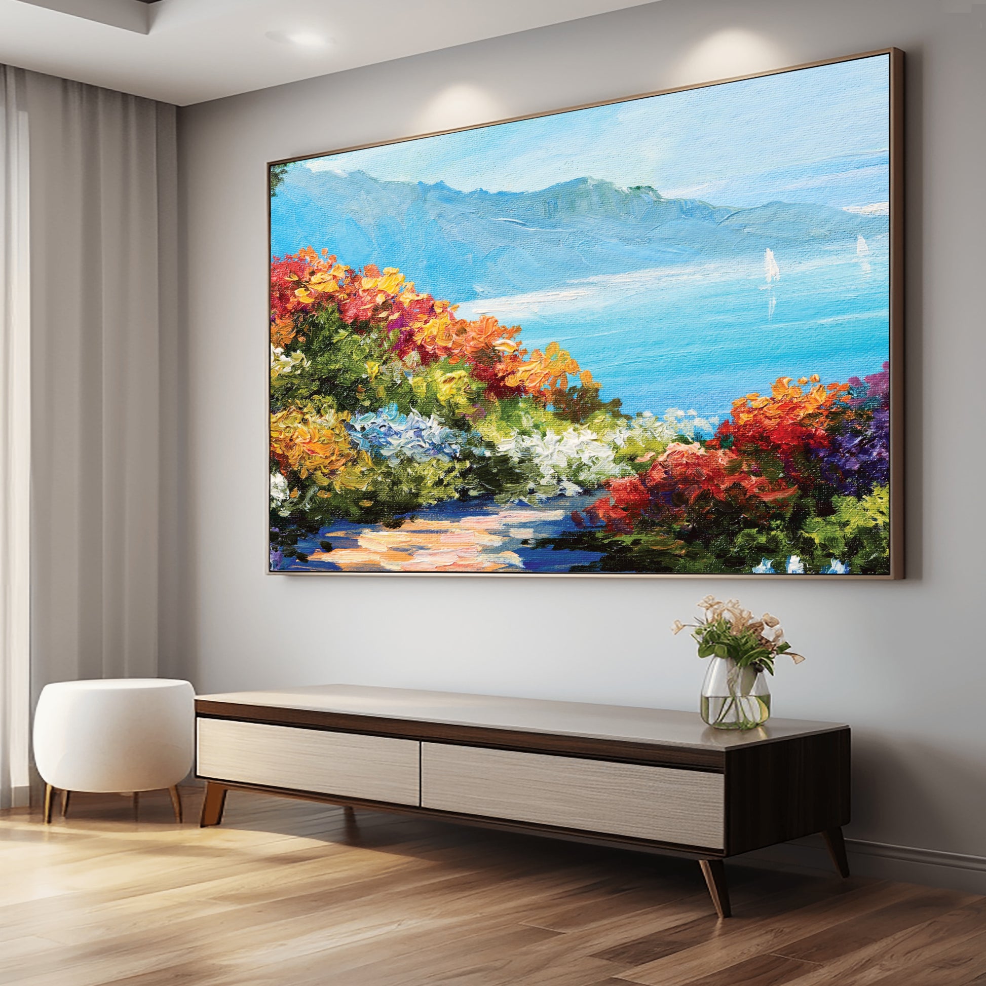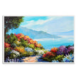 This vibrant summer seascape captures a winding path through a field of colorful flowers leading down to the ocean. The high-quality canvas painting is a unique and elegant piece. It would be a great addition to any home or office.