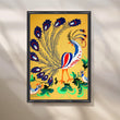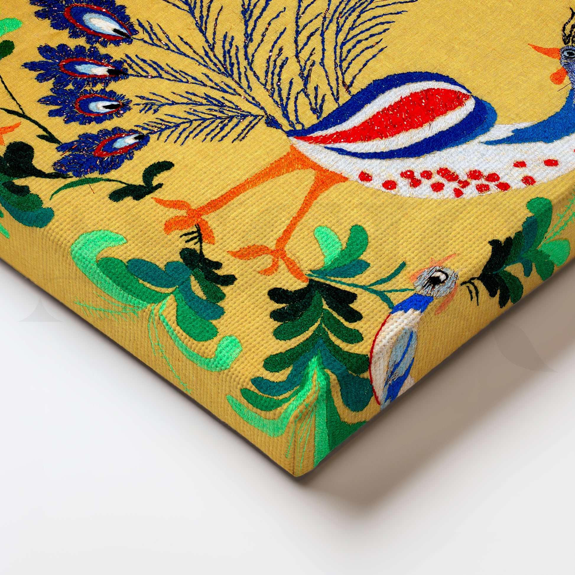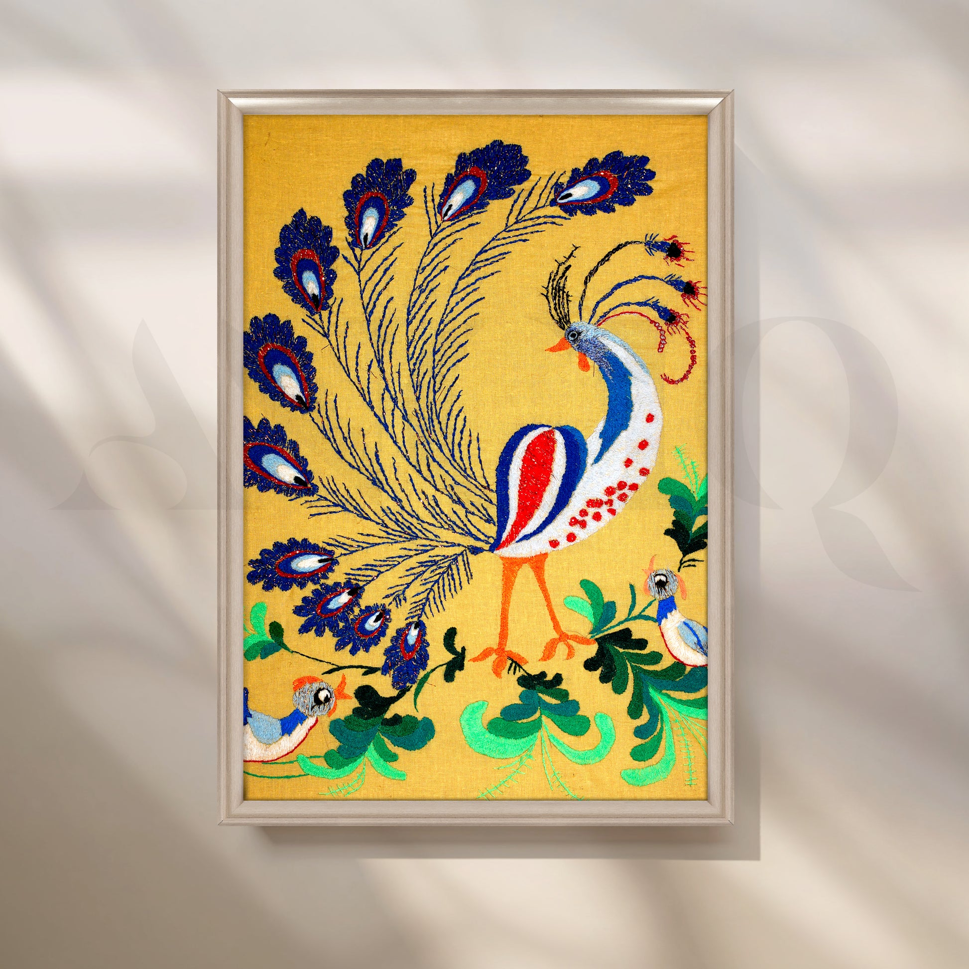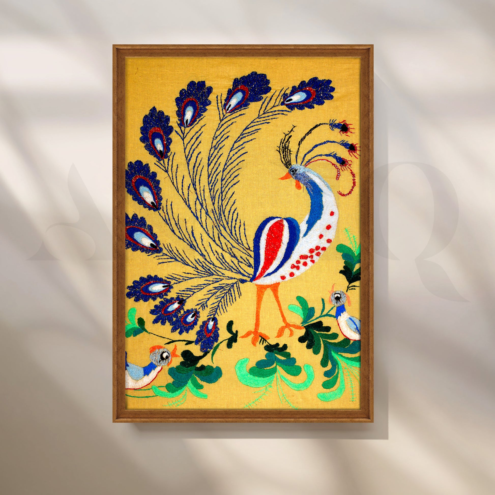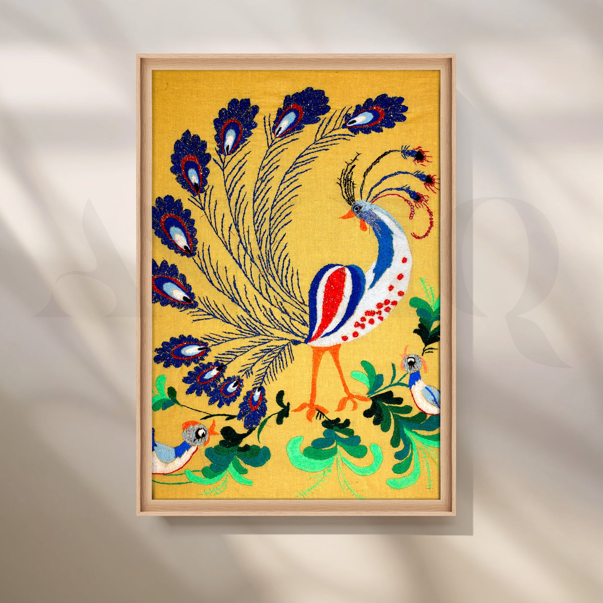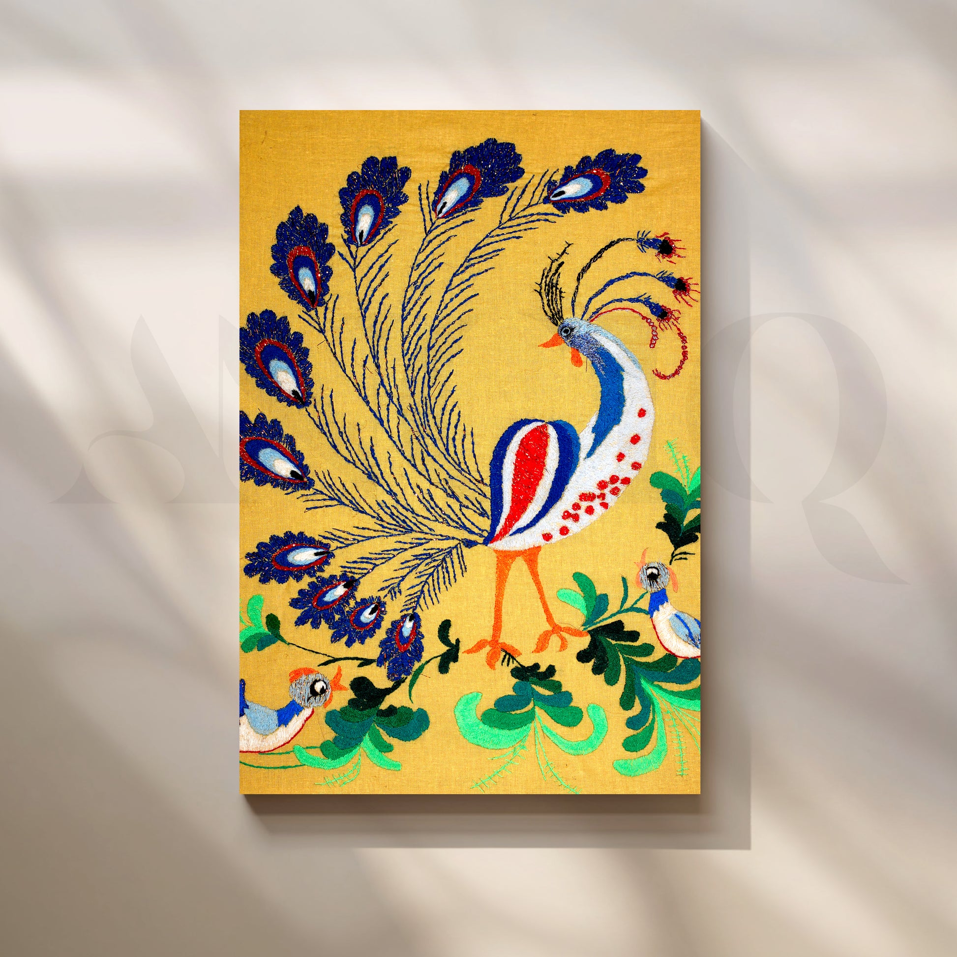 Anciq ‘Majestic Peacock’ Canvas Artwork celebrates Indian embroidery art, featuring a regal peacock in blue, red, and white against a yellow backdrop. Perfect for bedrooms or artistic corners. Keywords: peacock wall painting, embroidered art print, folk canvas, vibrant home decor, traditional peacock artwork.