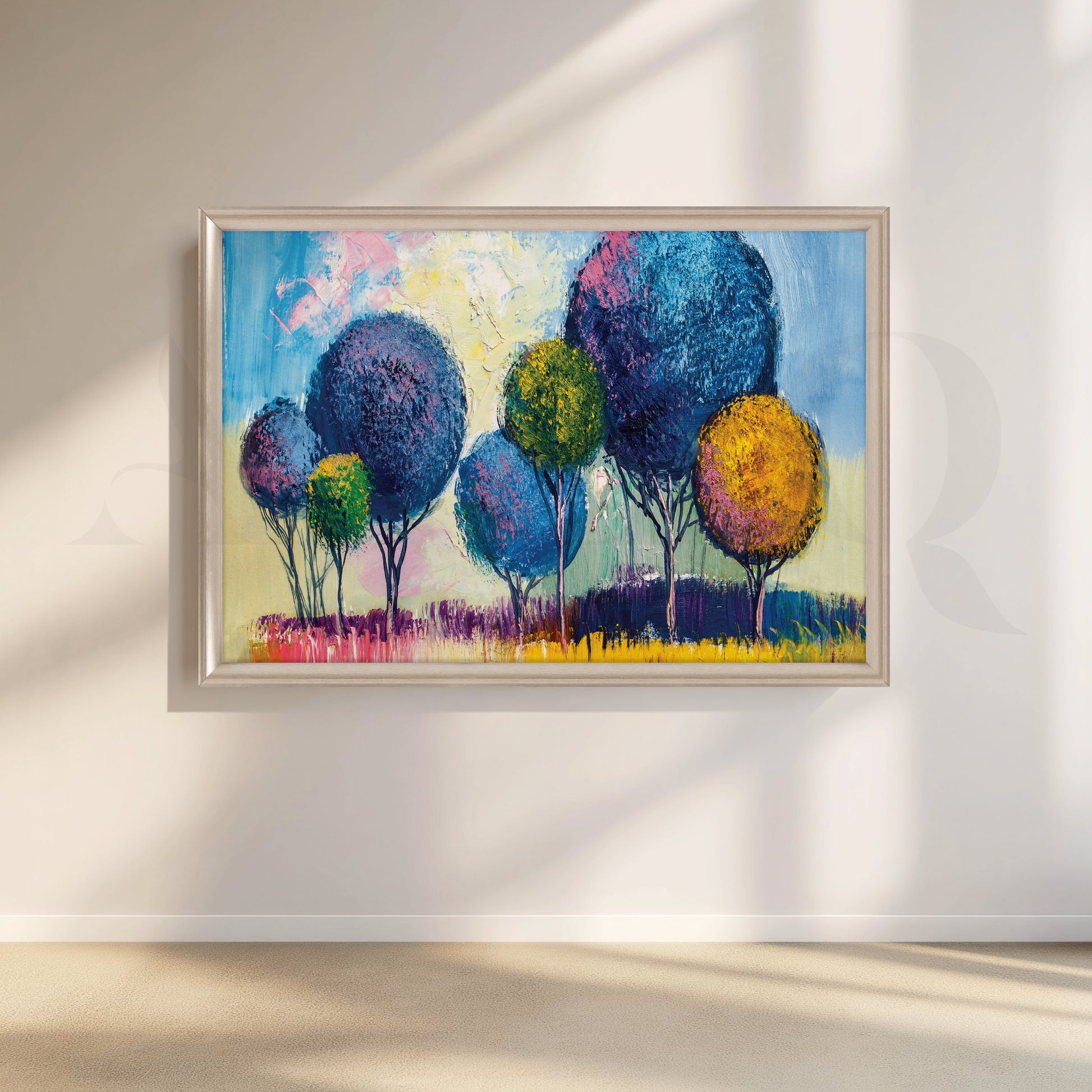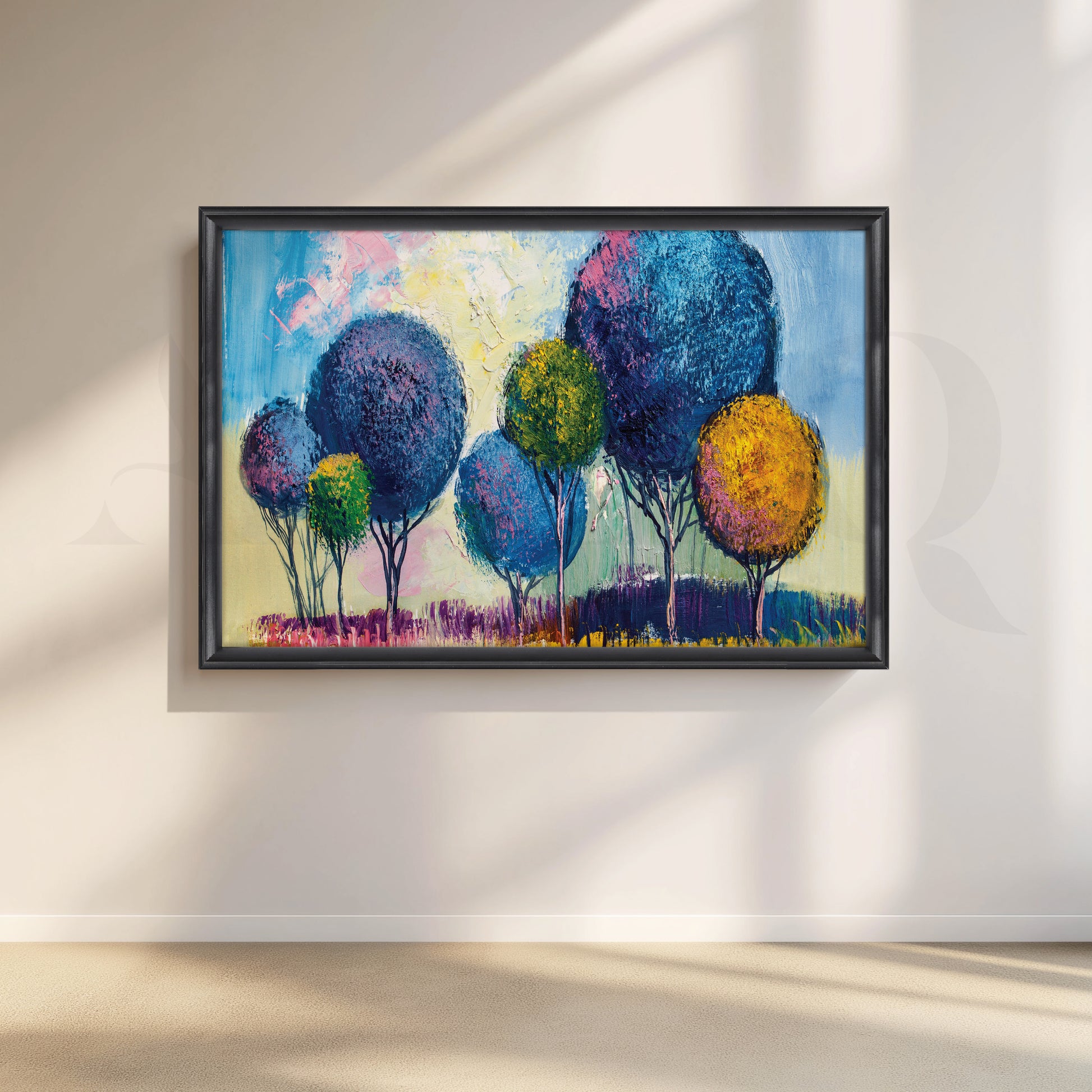 The "Majestic Serenity Canvas Wall Painting" is a beautiful piece of art that features a colorful forest landscape. The painting is made of high-quality materials and is sure to last for years to come. The vibrant colors and whimsical style of this painting would make a great addition to any room.