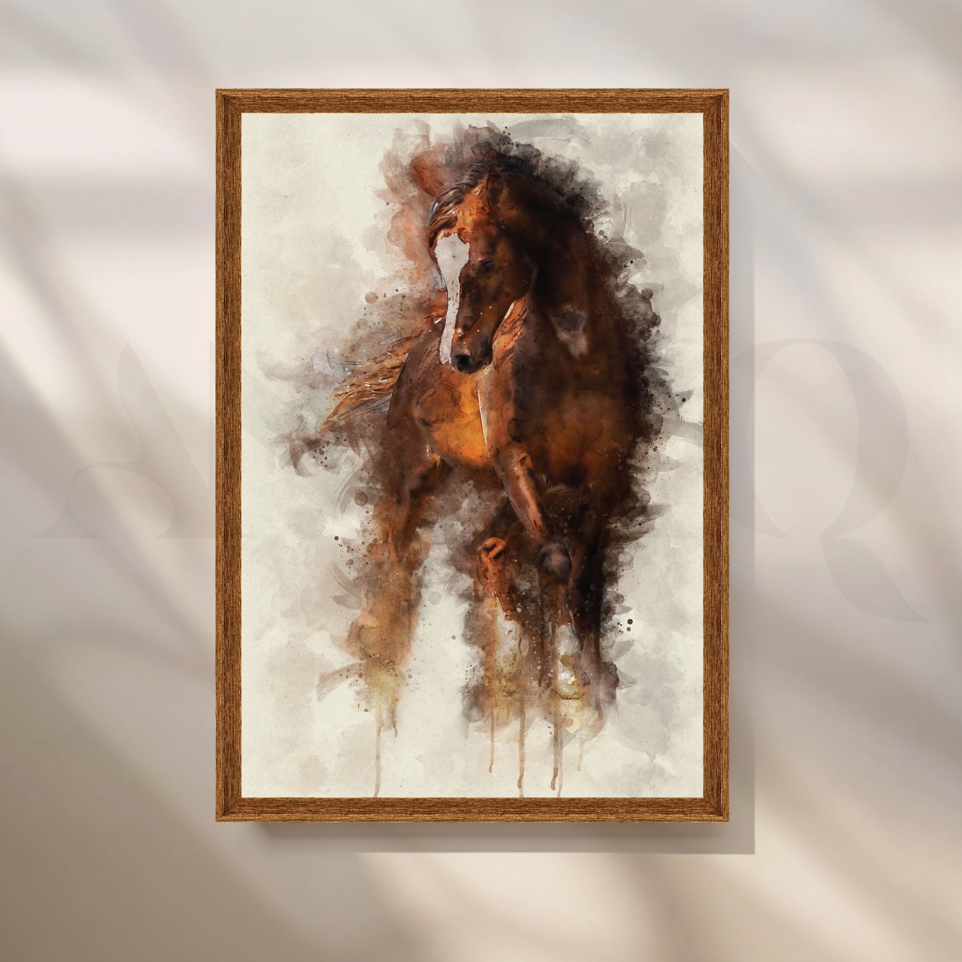 This painting is an outstanding and interesting work of art. The horse is painted in a contemporary abstract style emphasizing strong shapes and colors. The shape of the blue horse is clearly visible, but the details are presented through the use of brush strokes and geometric patterns. The horse manages to glow on a white background, and the overall composition is what harmonious and well balanced.