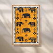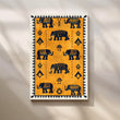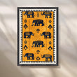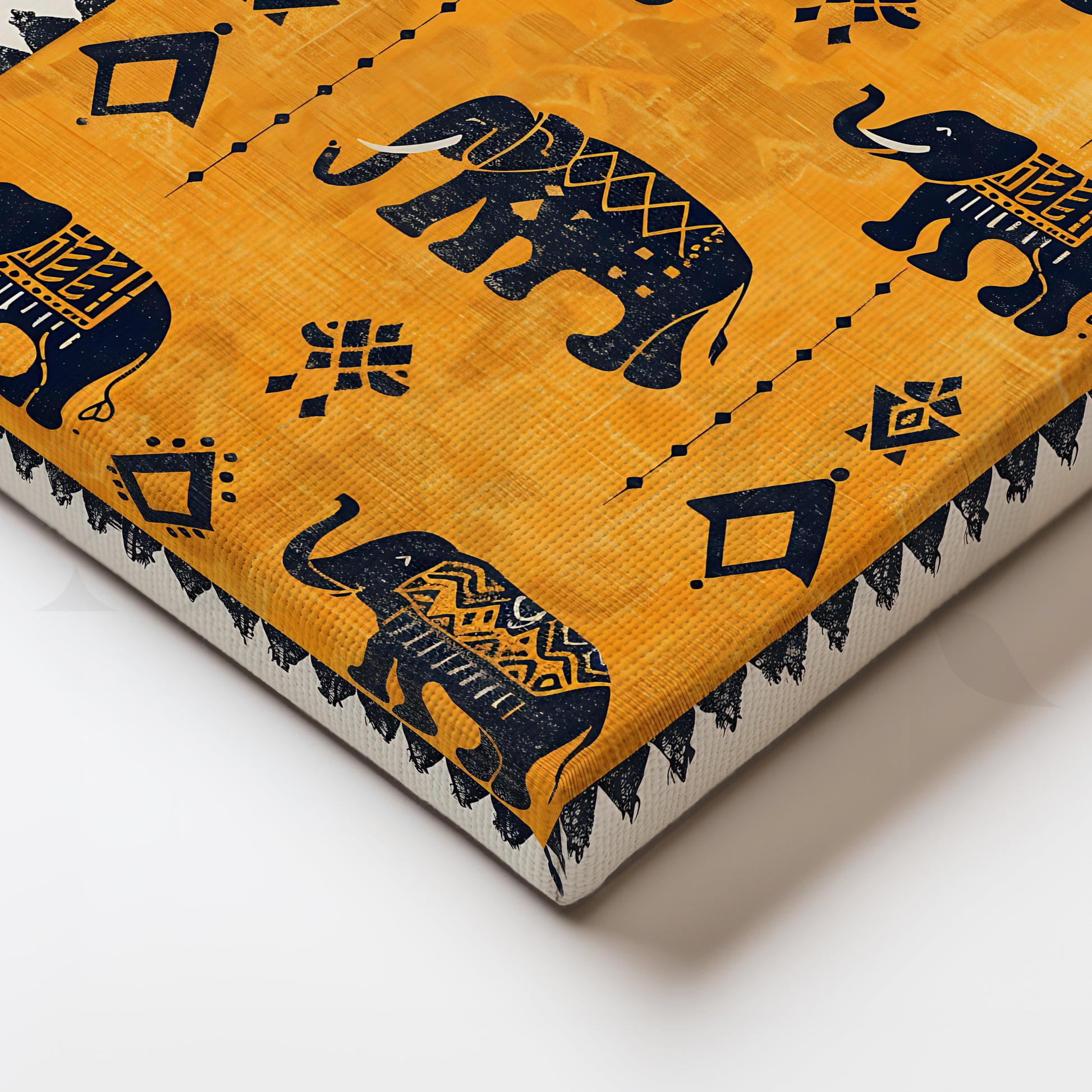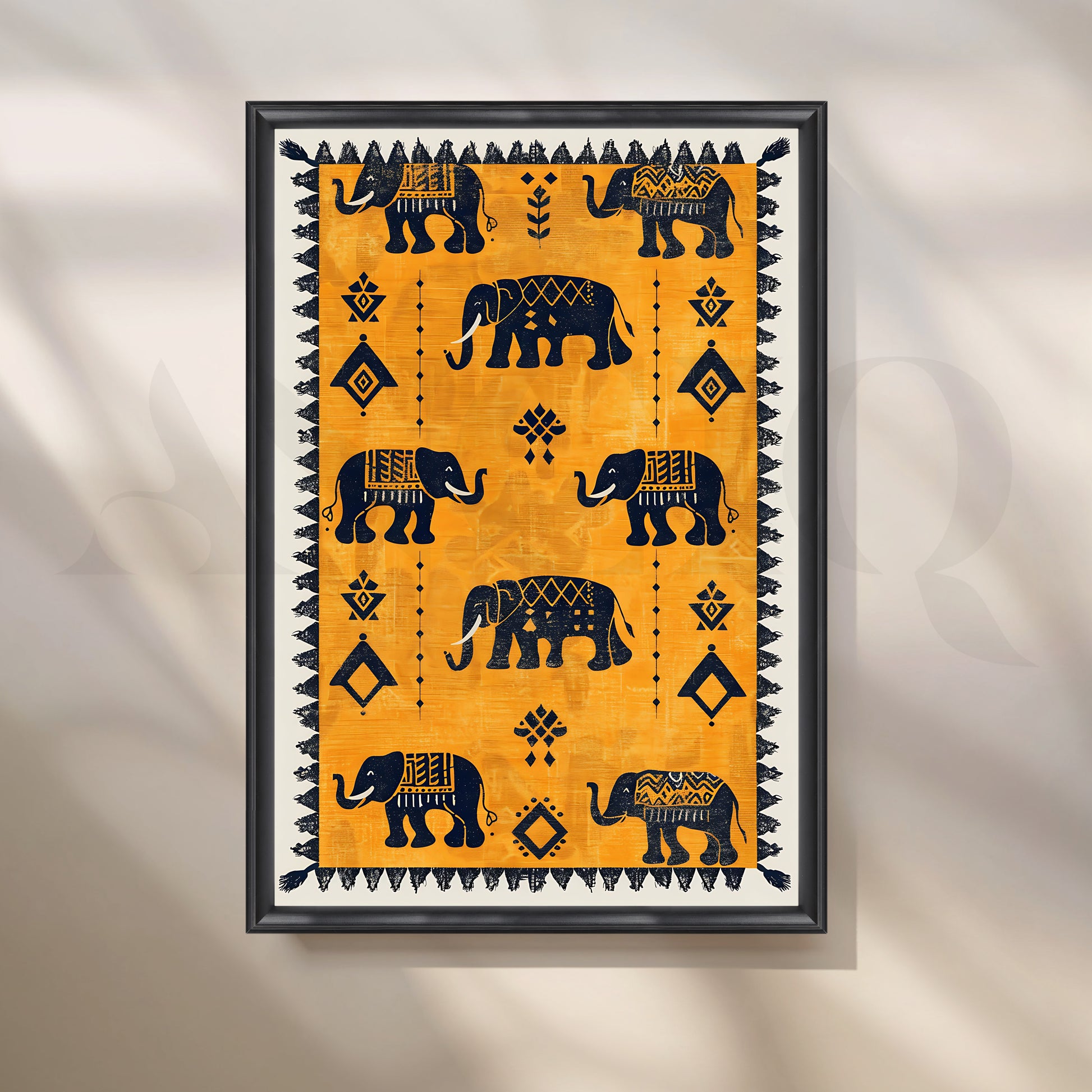 Featuring hand-painted elephants in deep navy on a warm ochre background, this Anciq artwork reflects ethnic elegance and cultural grace. Perfect for bedrooms or traditional-themed interiors. Keywords: elephant wall art, tribal Indian painting, ochre ethnic canvas, boho bedroom decor, cultural motif wall art.