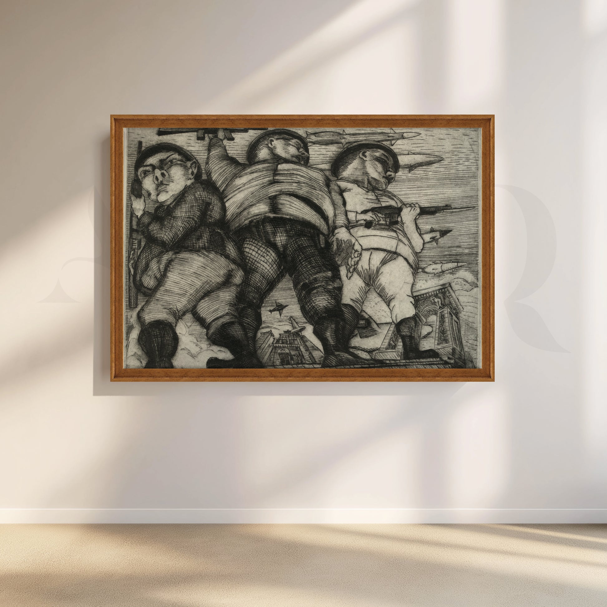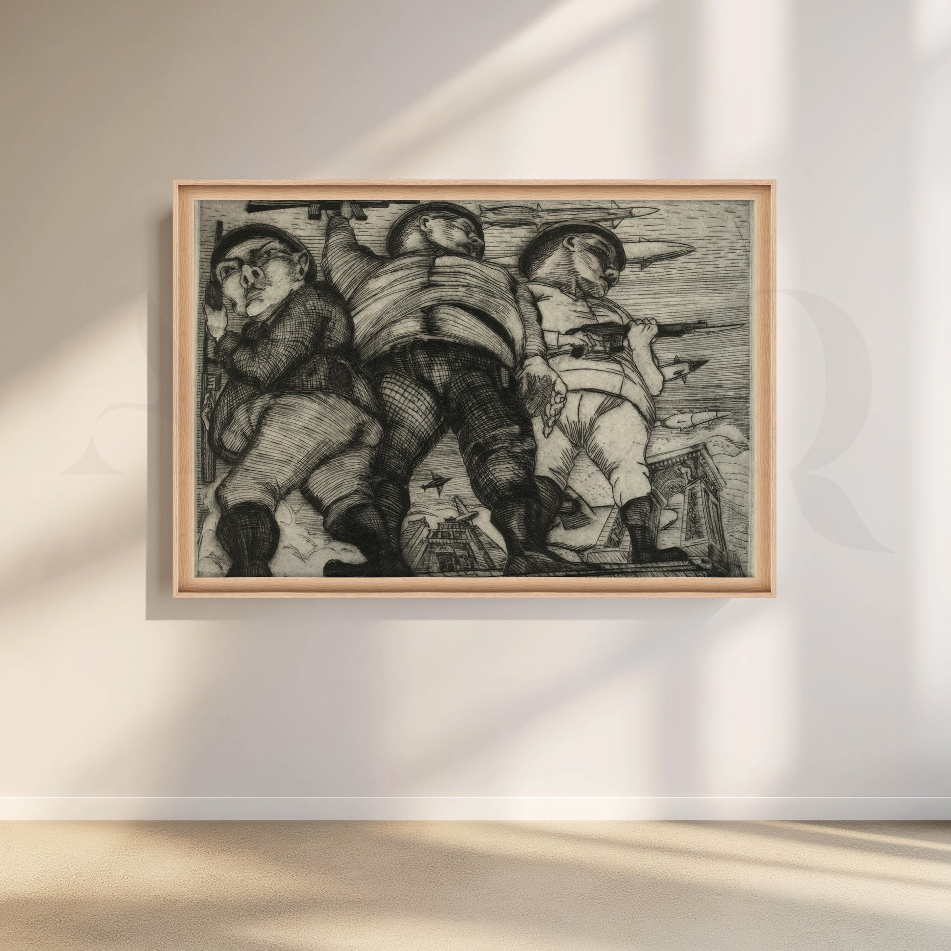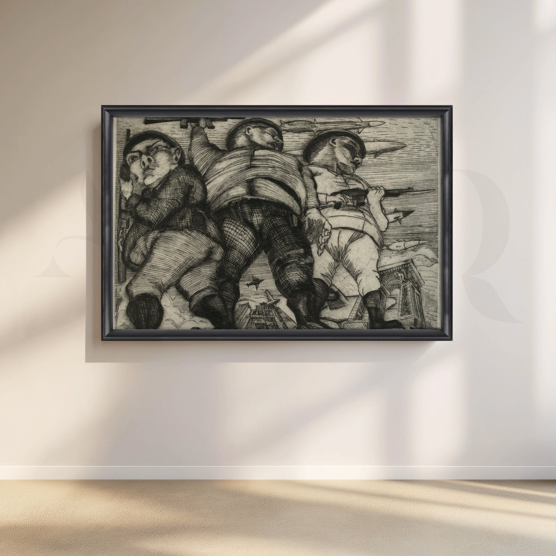 Anciq ‘March of the Soldiers’ Canvas Artwork captures three grotesquely exaggerated soldiers in motion—etched with warplanes overhead and destruction below. This black-and-white war critique is ideal for brutalist living rooms, political study spaces, or art lovers who appreciate intense, provocative visual storytelling.