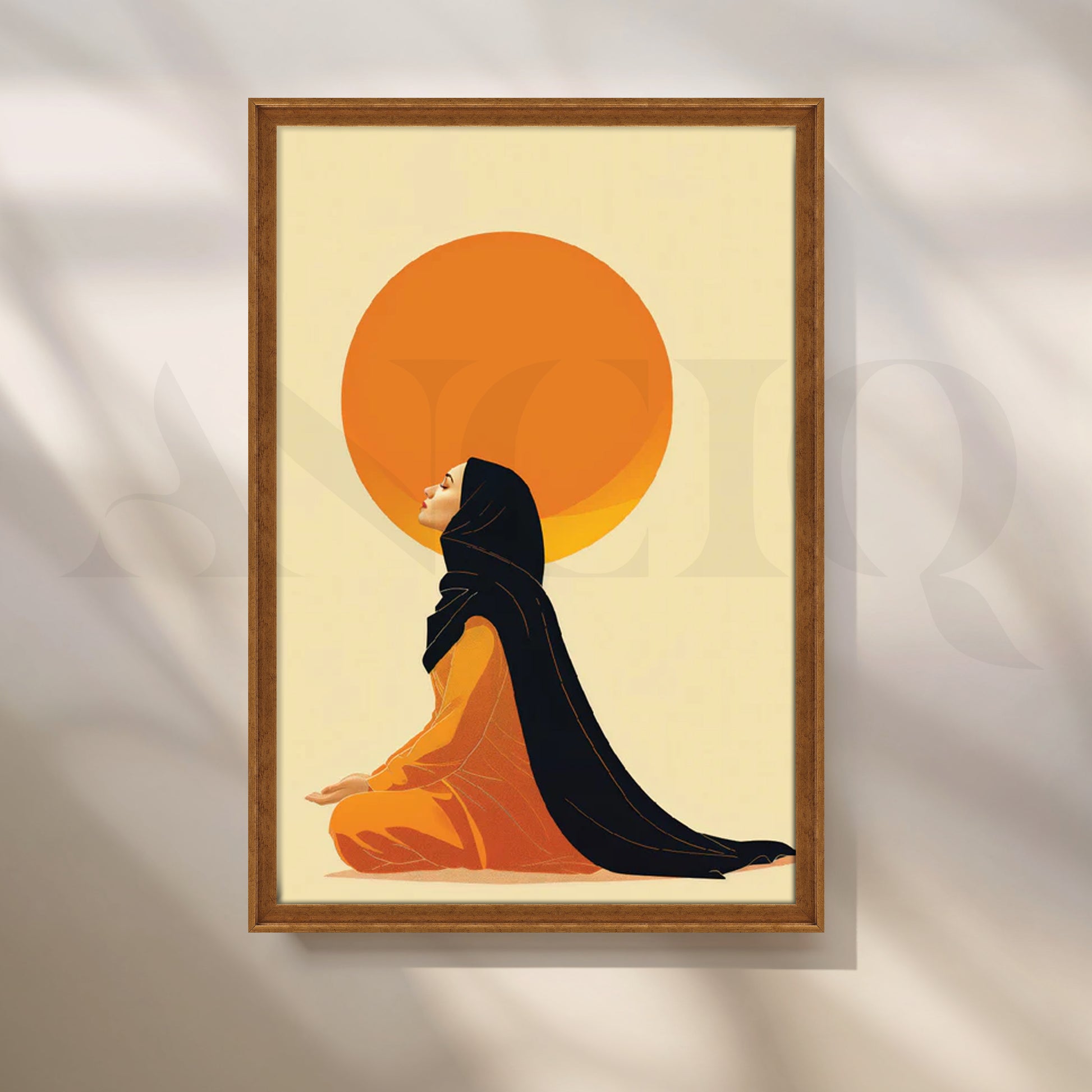 “Sunlit Serenity” captures a peaceful moment of a woman in a flowing black hijab seated in profile beneath a glowing amber sun on a soft cream backdrop. The minimalist composition, warm orange and gold tones, and clean lines create calming, modern wall art that complements neutral, boho, or contemporary spaces. Perfect as spiritual wall décor for a meditation room, prayer corner, living room, or tranquil bedroom, this minimalist canvas painting brings mindfulness and warmth—ideal keywords: modern canvas art, Islamic wall art, abstract sun art, large living room art, boho bedroom décor, neutral home décor.