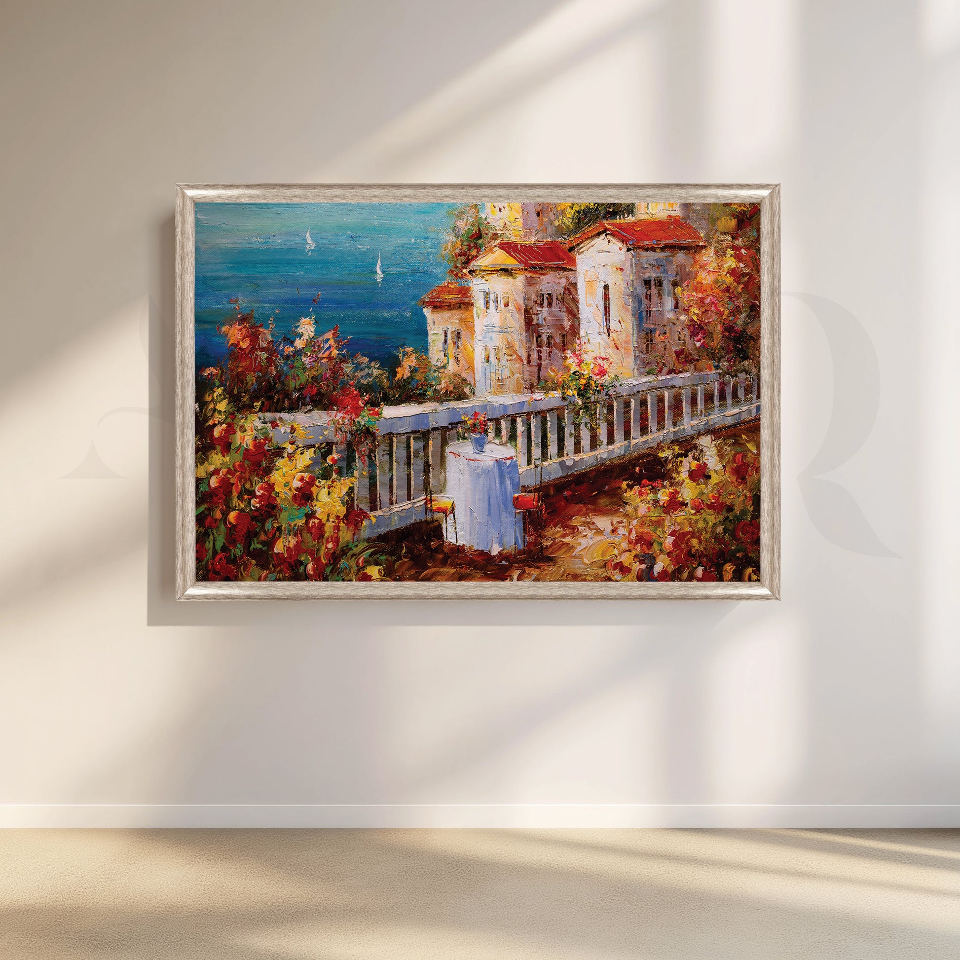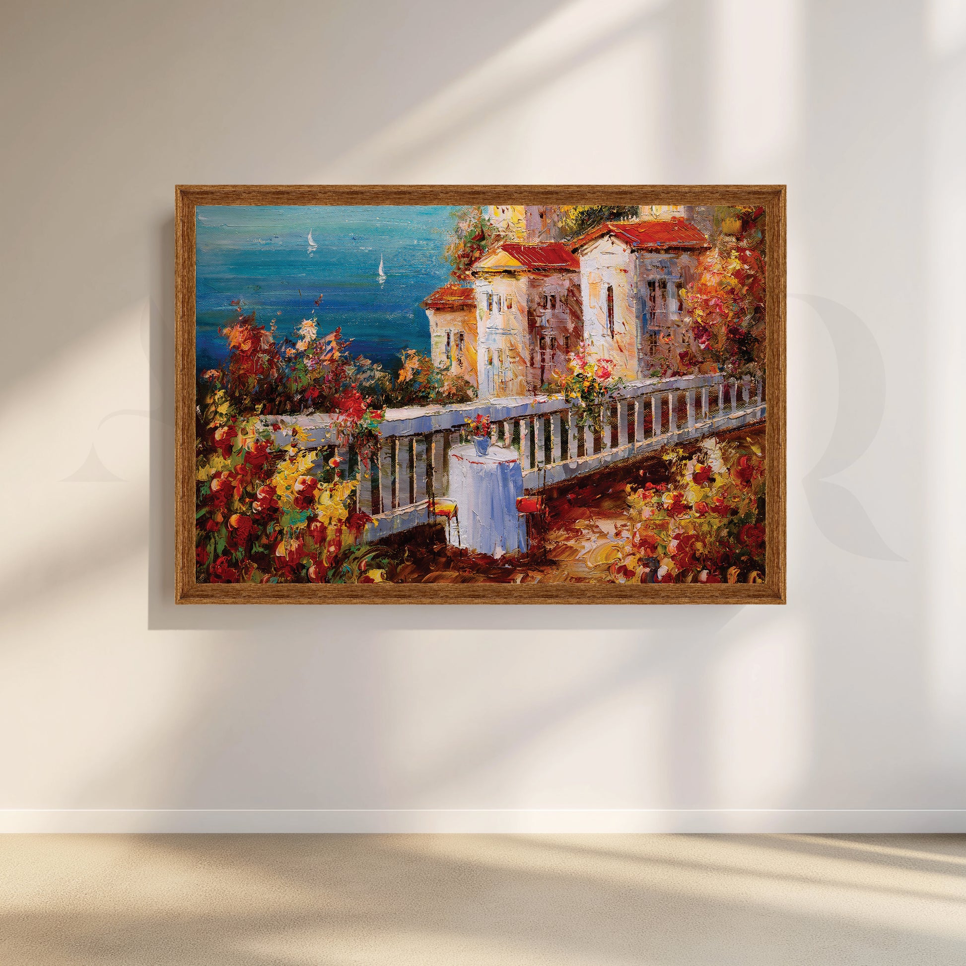 The "Mediterranean Escape Canvas Wall Painting" is a vibrant depiction of a harbor scene, likely inspired by the Mediterranean coast. The painting captures the essence of the Mediterranean with its warm colors and idyllic setting. The use of blues and greens creates a sense of tranquility, while the pops of yellow and orange add a touch of vibrancy. The brushstrokes are loose and expressive, giving the painting a sense of movement and energy. This piece of art would be a beautiful addition to any home.
