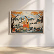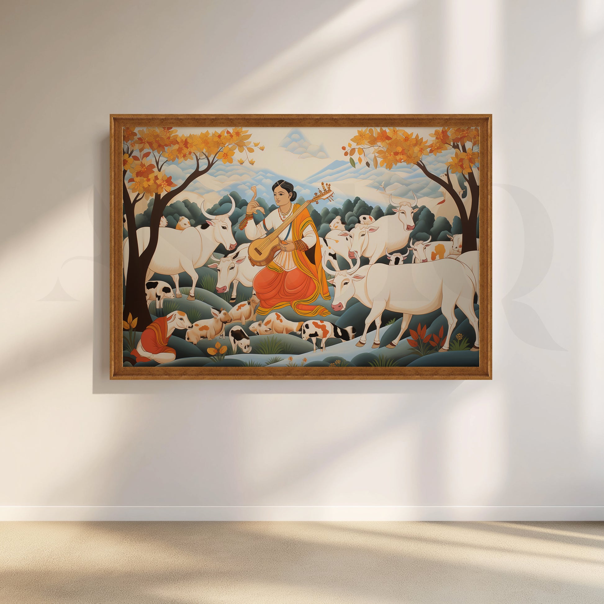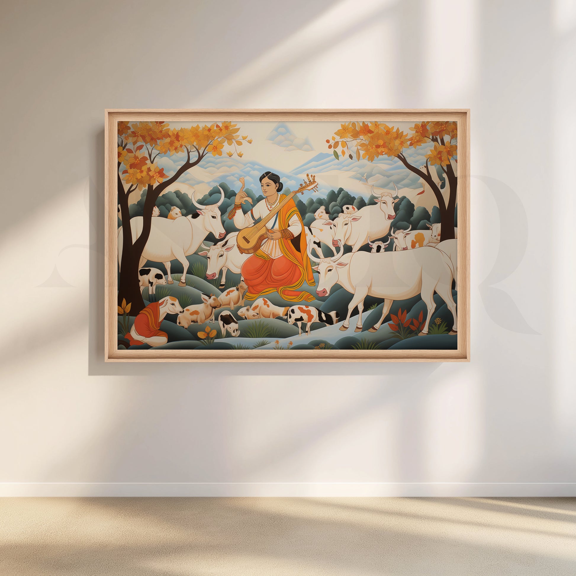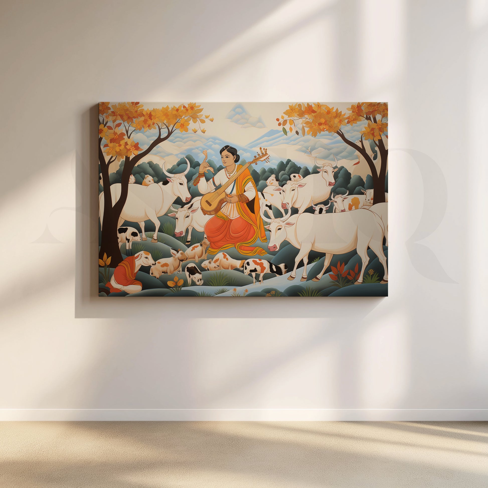 Let music and nature flow through your home with Anciq’s “Melody Among the Herd” canvas artwork. A radiant musician in flowing orange robes plays a stringed instrument amidst tranquil hills, flanked by gentle white cows and playful calves under golden trees. The scene evokes folk tales of pastoral harmony and devotion, blending soft blues, creams and autumnal tones for a soothing yet vibrant effect.