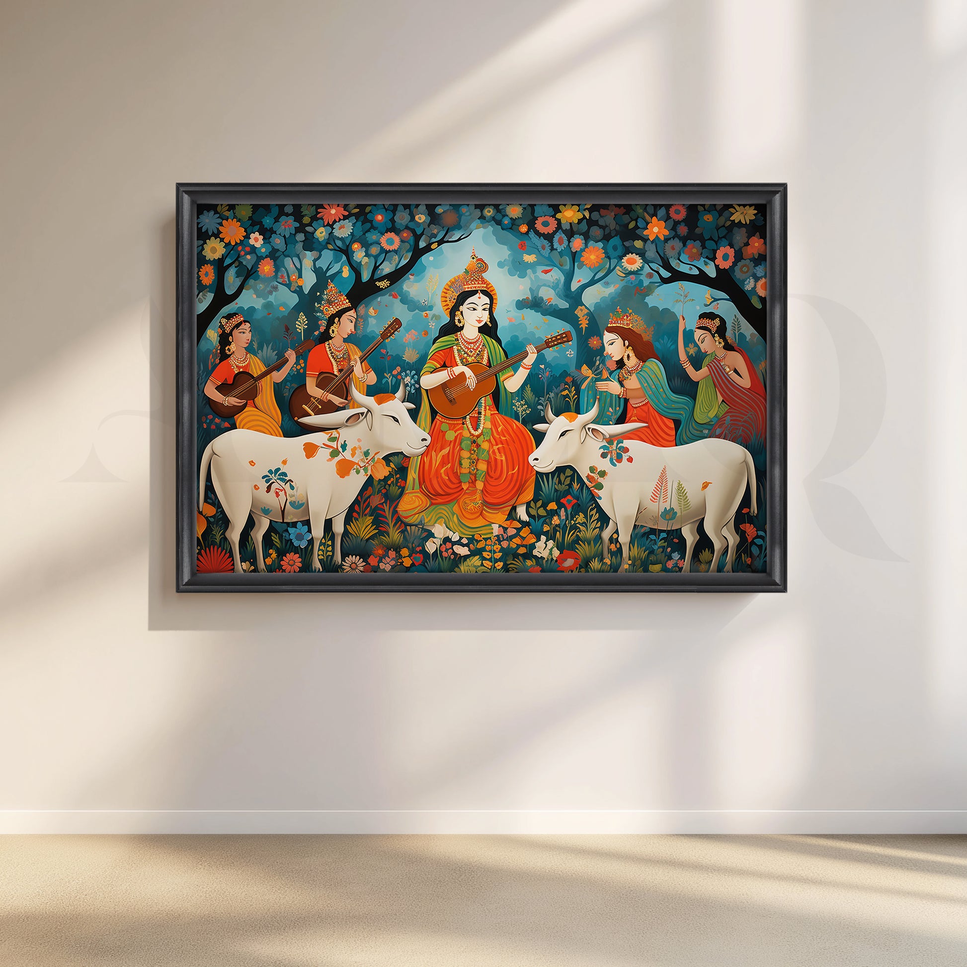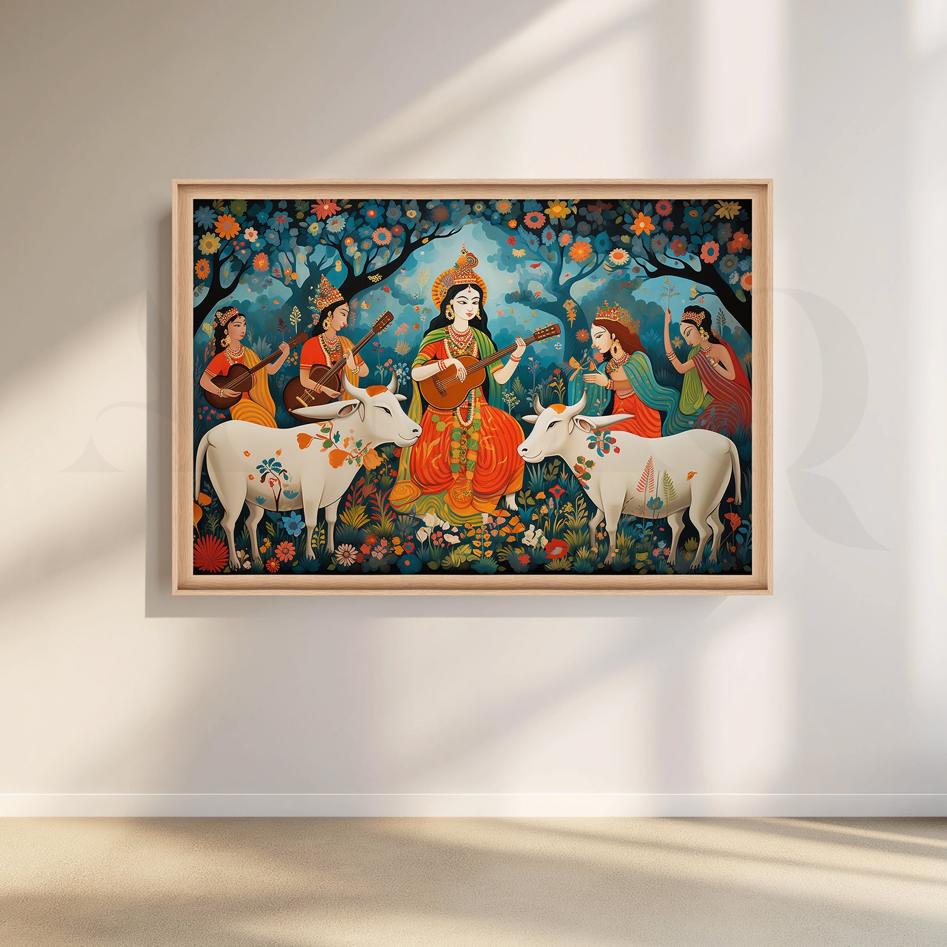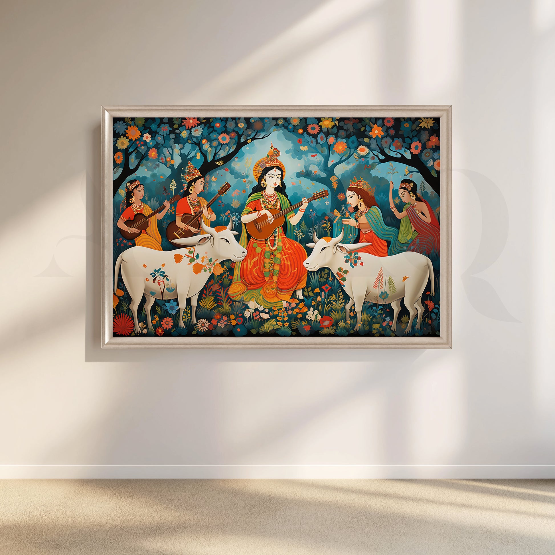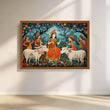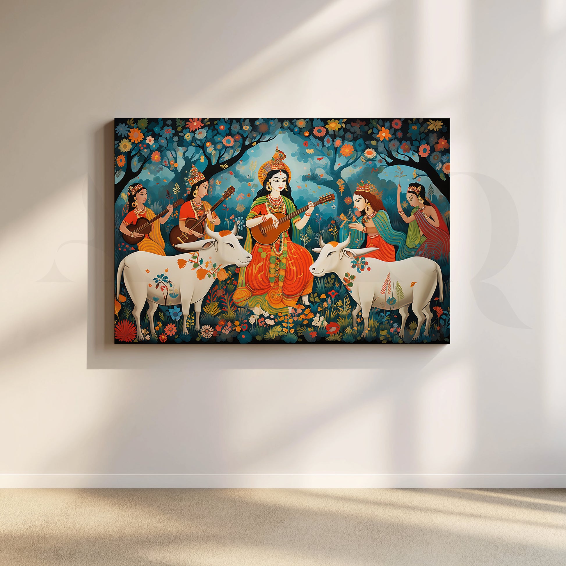Anciq ‘Melody in the Forest’ Canvas Artwork for Kids’ Room features divine musicians and decorated cows in a magical, floral woodland. The vibrant blues, reds, and whites create a joyful aura for creative spaces, kids' rooms, or yoga studios. Ideal for those seeking “Krishna musical wall art,” “folk style forest painting,” or “colorful canvas for children’s decor.”