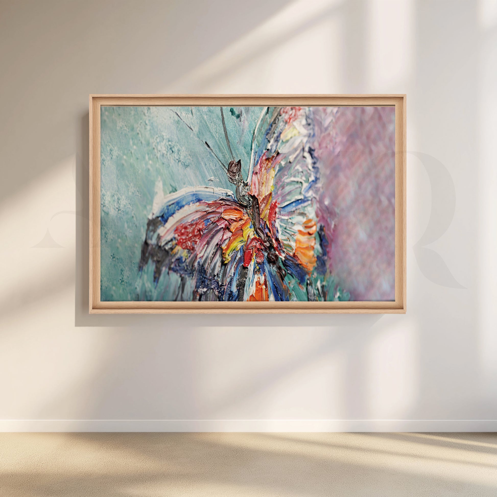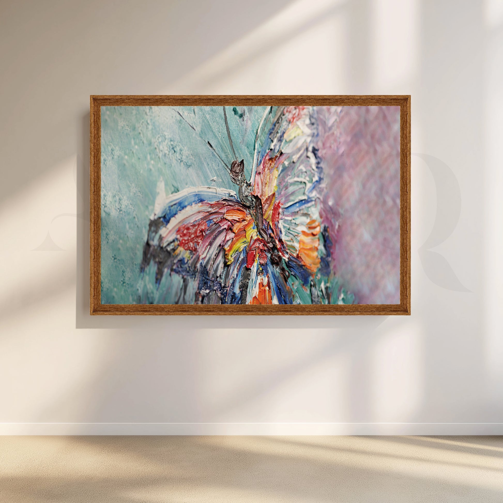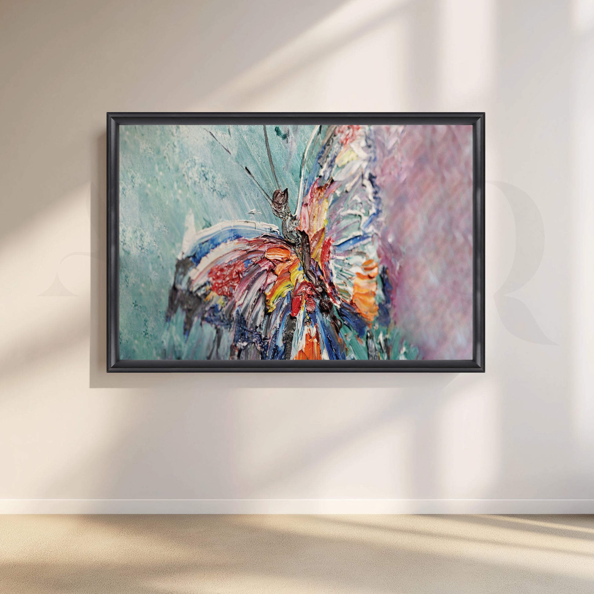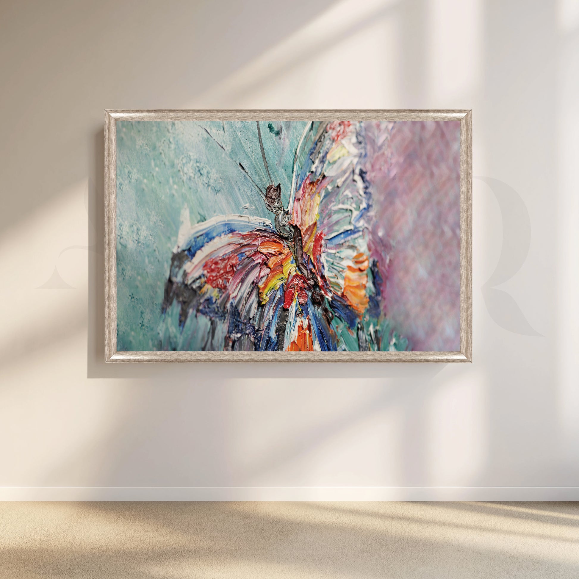 Breathe in the serenity. This captivating painting captures a lone butterfly in flight, its wings a burst of color against a calming expanse of blue. A stunning focal point for any room, this piece evokes a sense of peace and freedom.