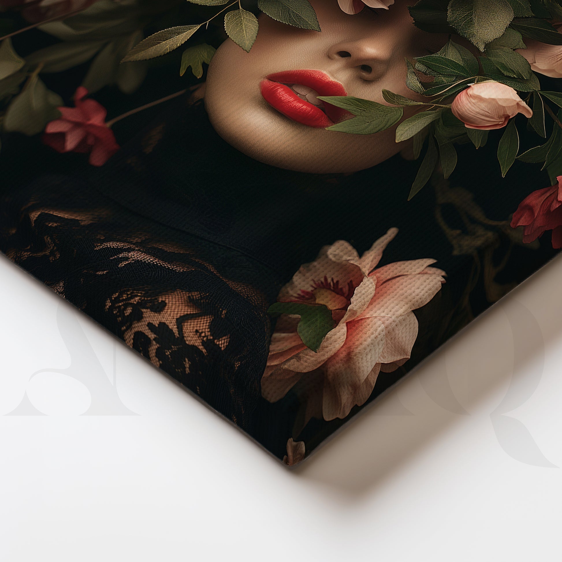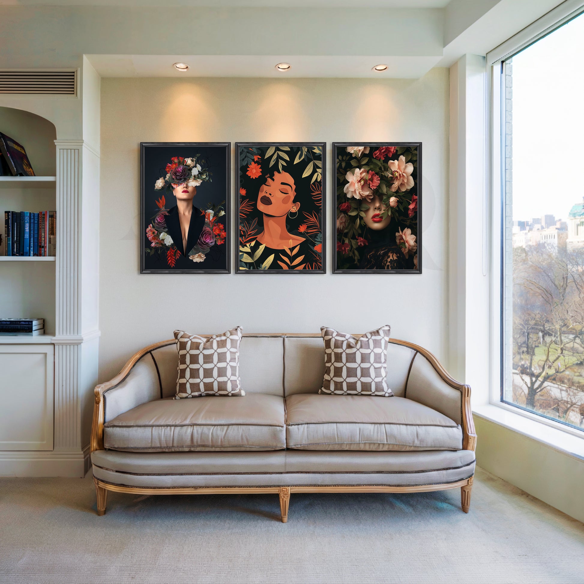 Anciq ‘Midnight Floral Muses’ Gallery Wall pairs graceful female portraits with lush blooms on deep charcoal backgrounds, creating a romantic, high-fashion vibe. Perfect for living rooms, bedrooms, vanity corners, boutiques, or studio spaces, this 3-piece set adds drama and elegance. Ideal for floral portrait wall art and modern, moody interiors.