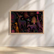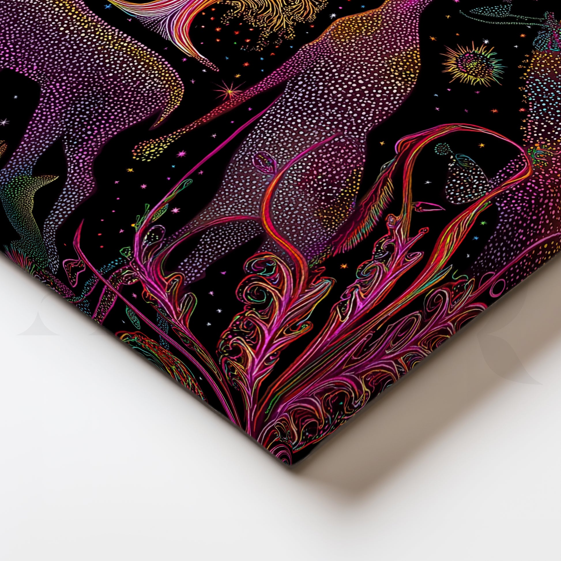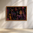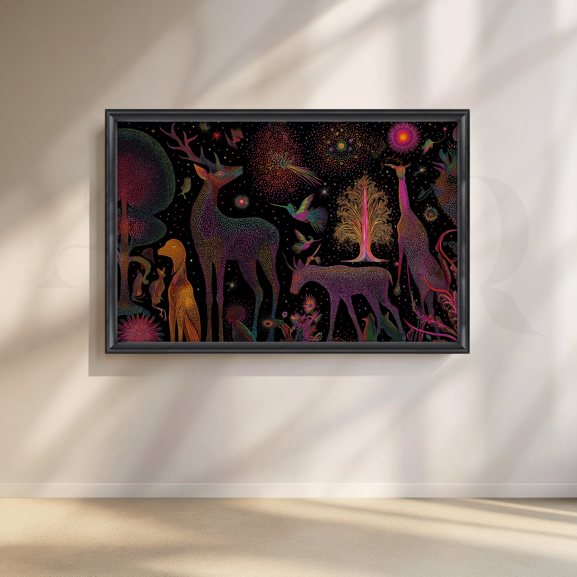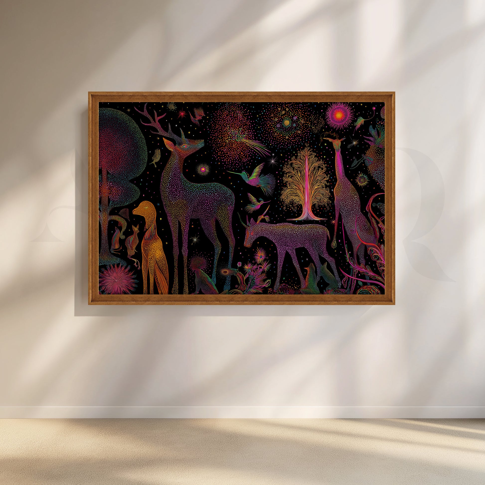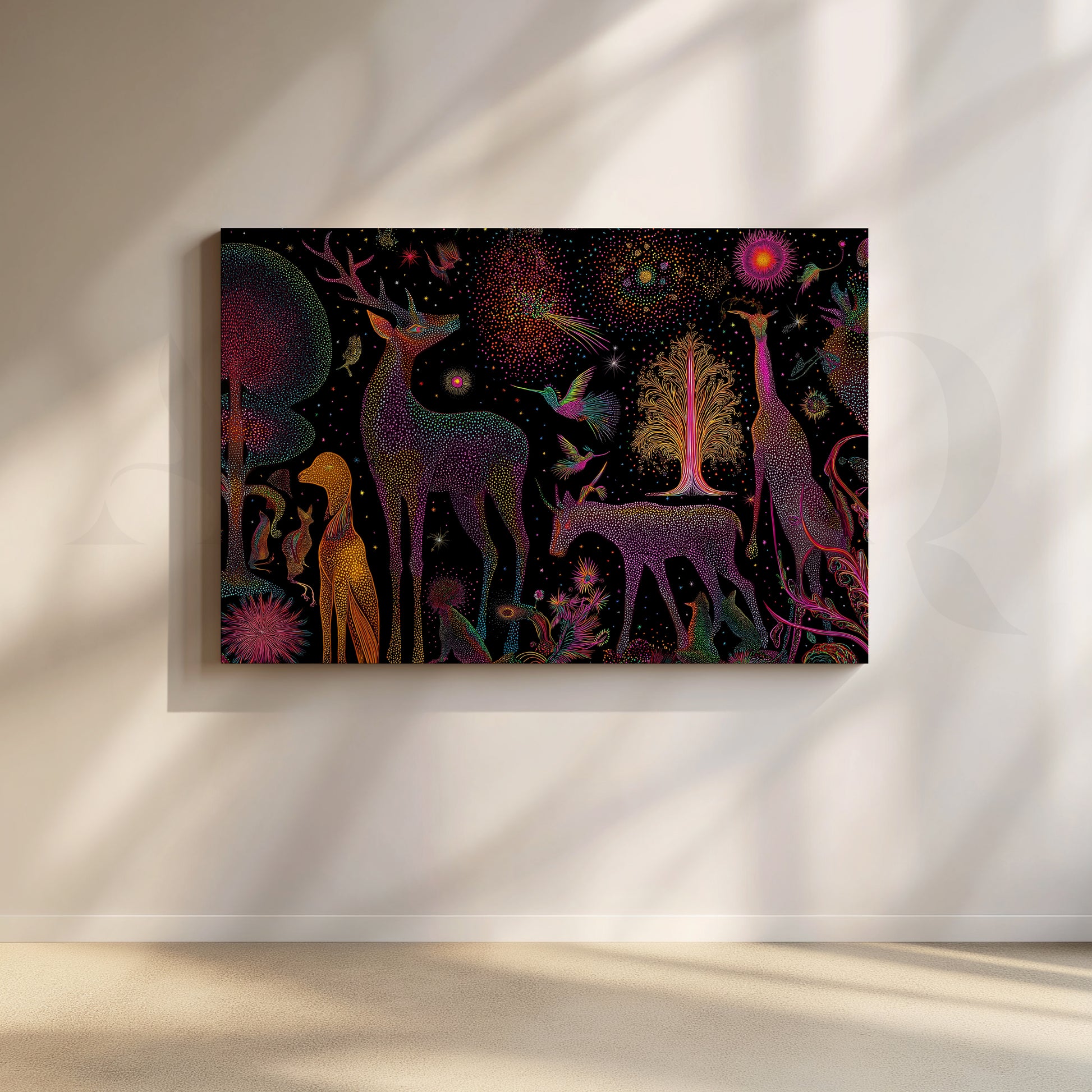 Inspired by Gond art, this nocturne features deer, peacocks, birds and blooming flora rendered in shimmering pointillist dots over a deep black sky. The mystical palette elevates statement walls and cozy nooks alike. Keywords: Gond painting, Indian tribal art, forest animal wall art, black canvas print, bohemian bedroom decor, nature inspired artwork, vibrant dot painting.