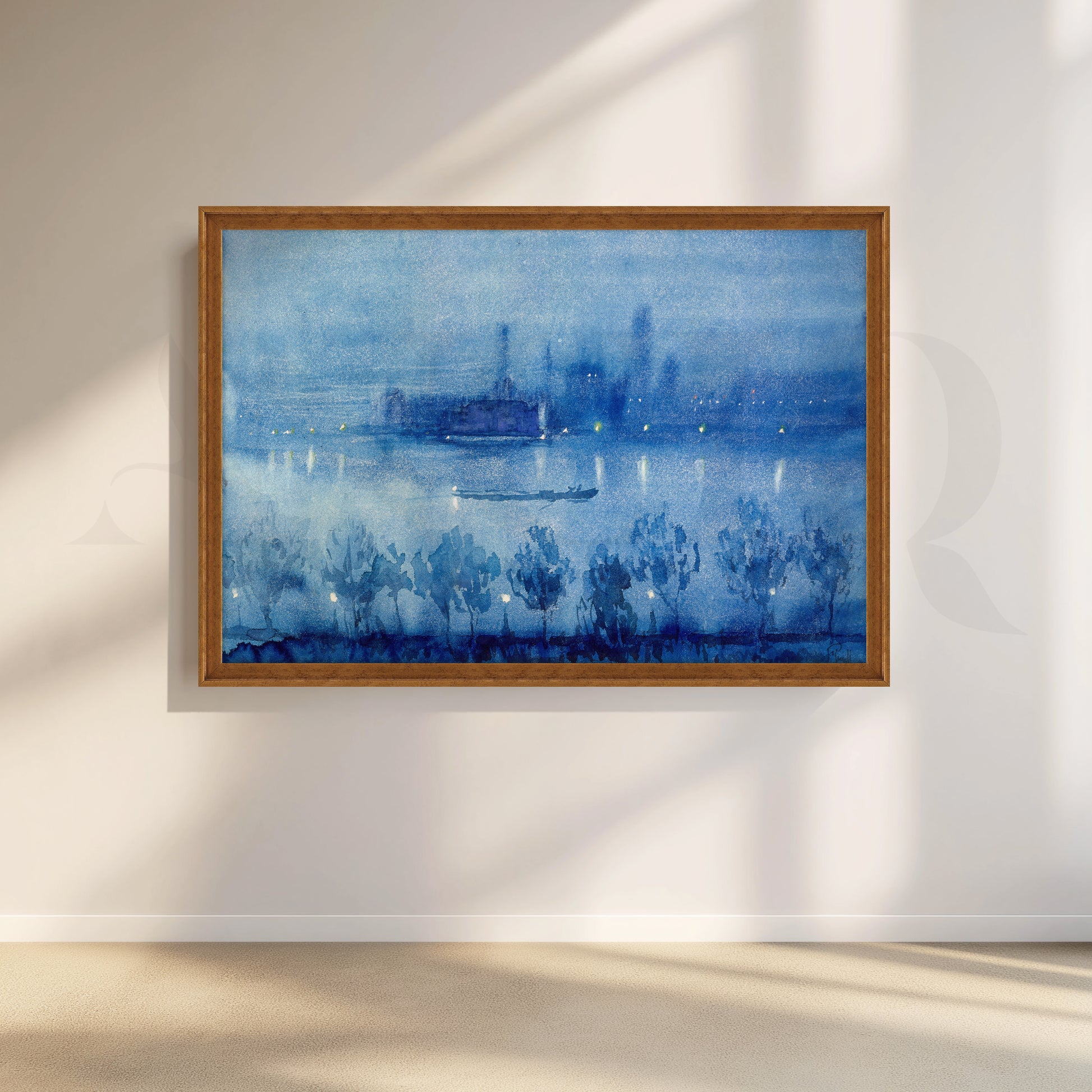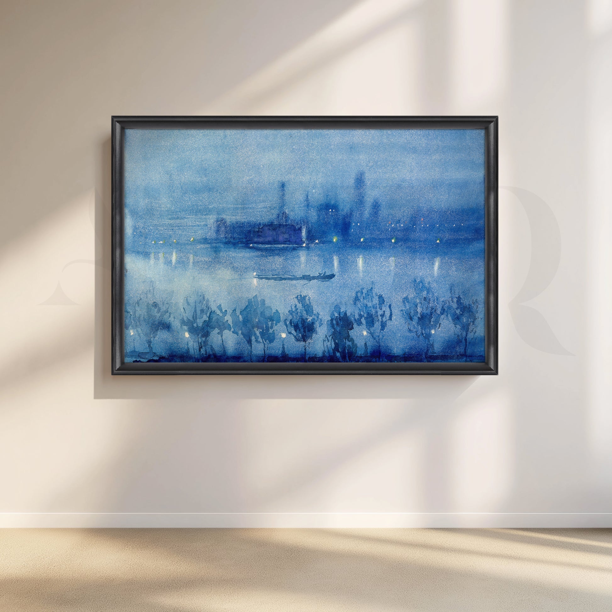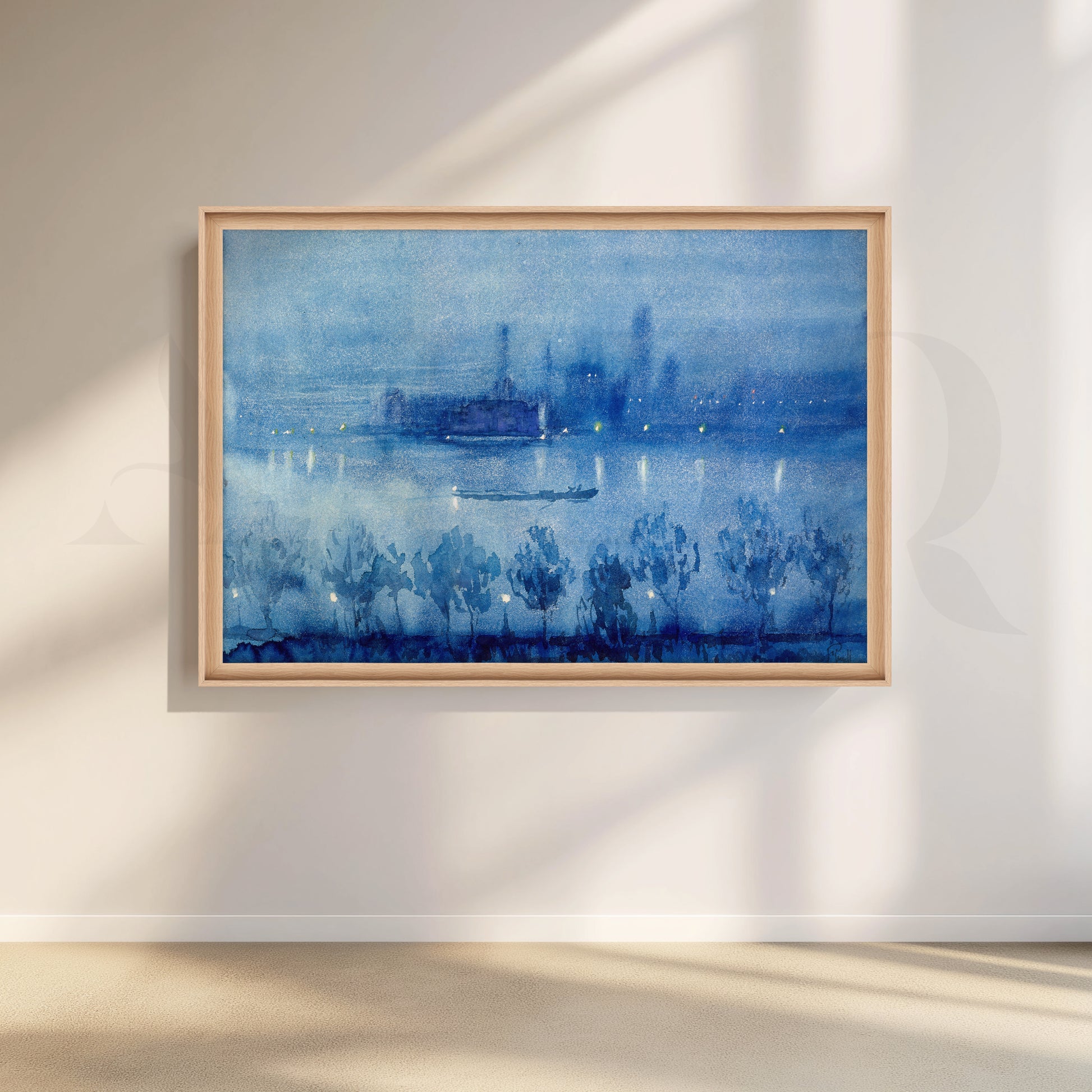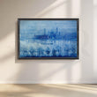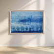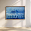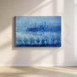A panoramic blue-toned waterscape shimmers with distant city lights and soft reflections. This tranquil, modern canvas suits large living-room walls and above-sofa placements, bringing calm coastal-city ambience to your home. Keywords: blue abstract landscape, panoramic canvas art, waterfront wall décor, large living room art, modern minimalist painting.