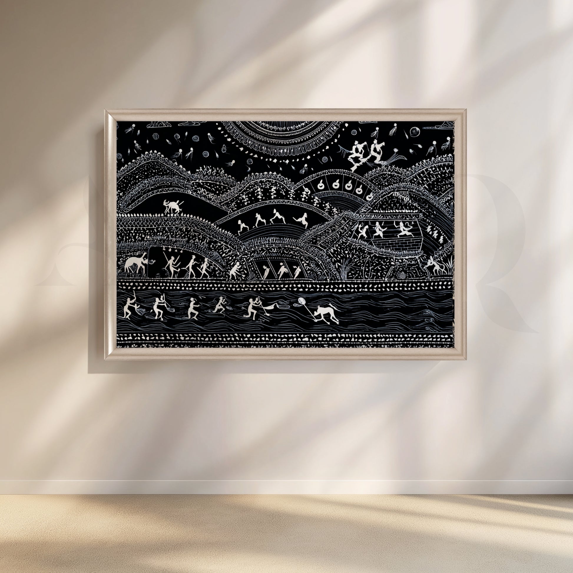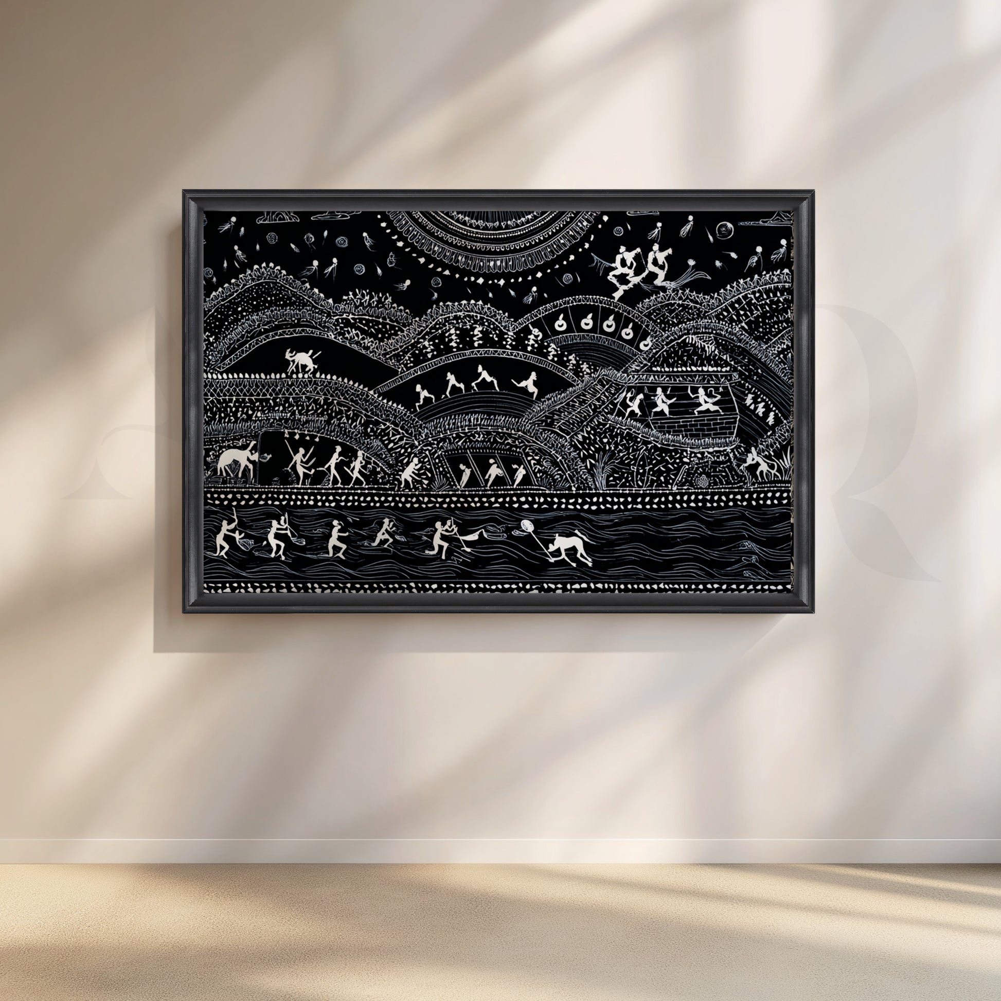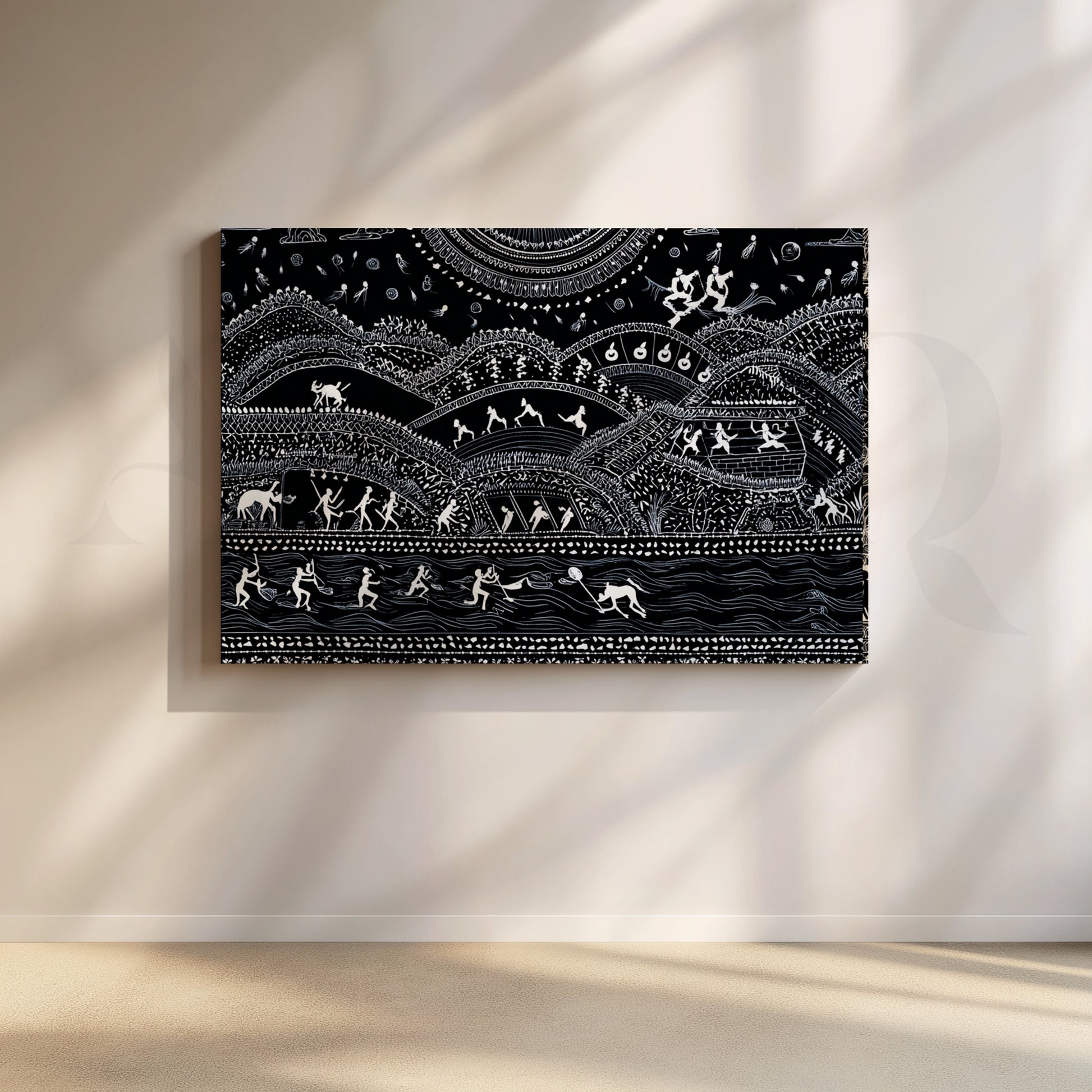 Celebrate Indian tribal art with this striking black-and-white Warli canvas. Layered hills, rhythmic dancers, hunters, and swimmers flow toward a patterned river, creating a storytelling landscape that energizes a modern living room, den, or office. Hand-drawn motifs, fine dots and lines, and high contrast make a bold statement above a sofa or console. Perfect for lovers of ethnic wall art, folk paintings, and monochrome décor. Keywords: Warli painting canvas, tribal art wall décor, Indian folk art, black and white wall art, living room statement piece, cultural artwork, modern ethnic décor.