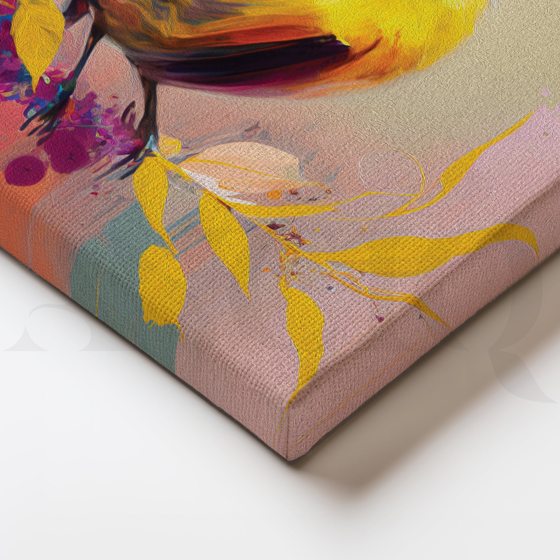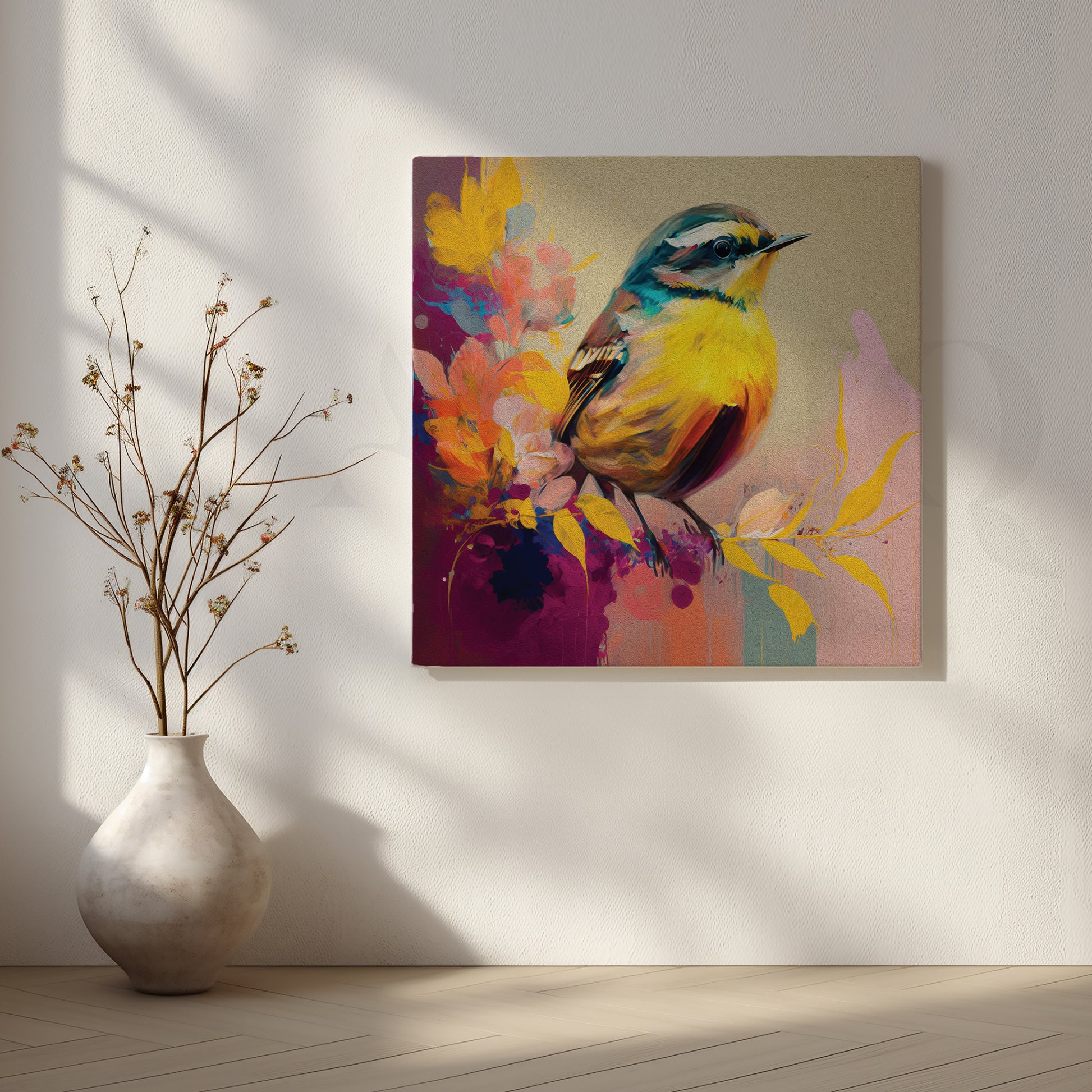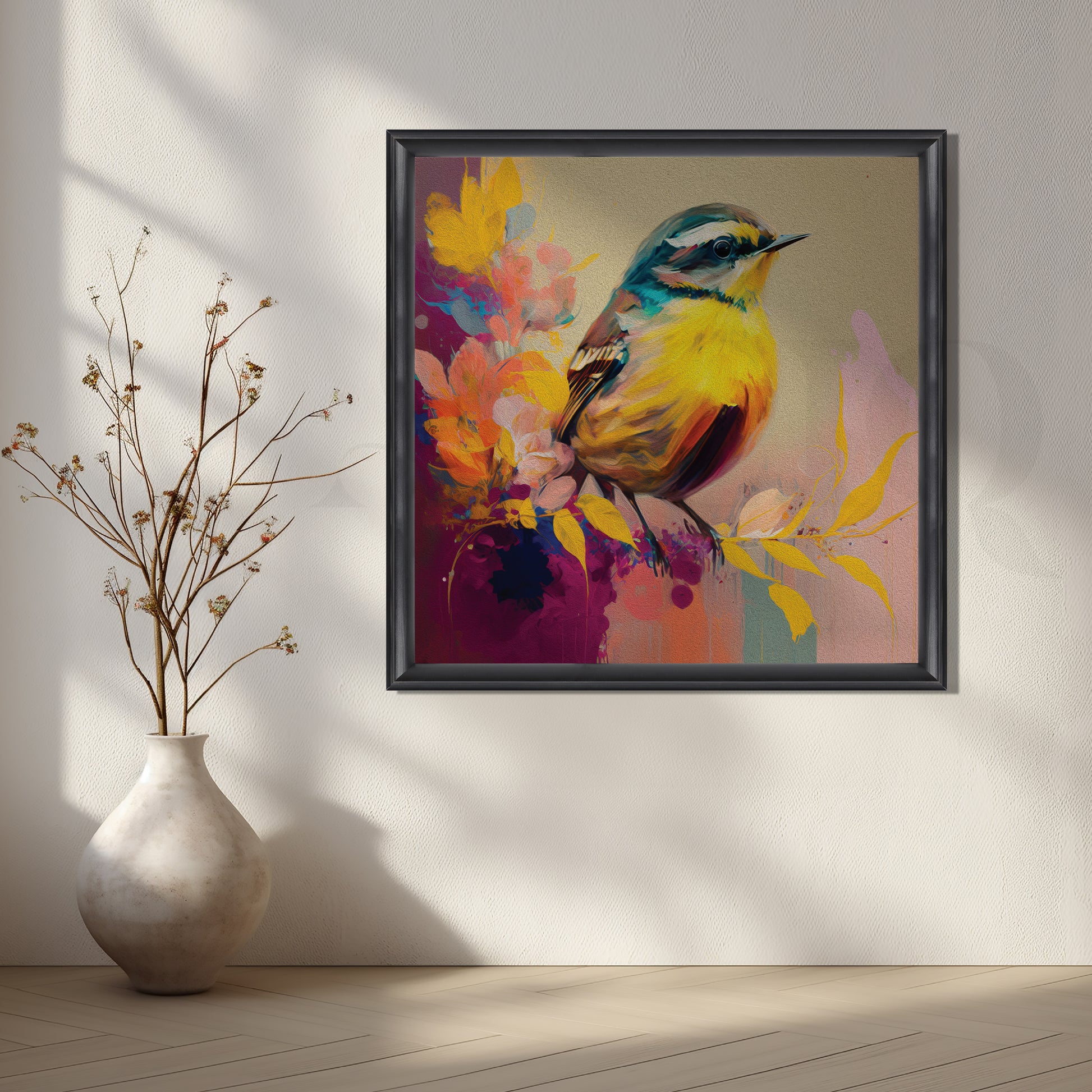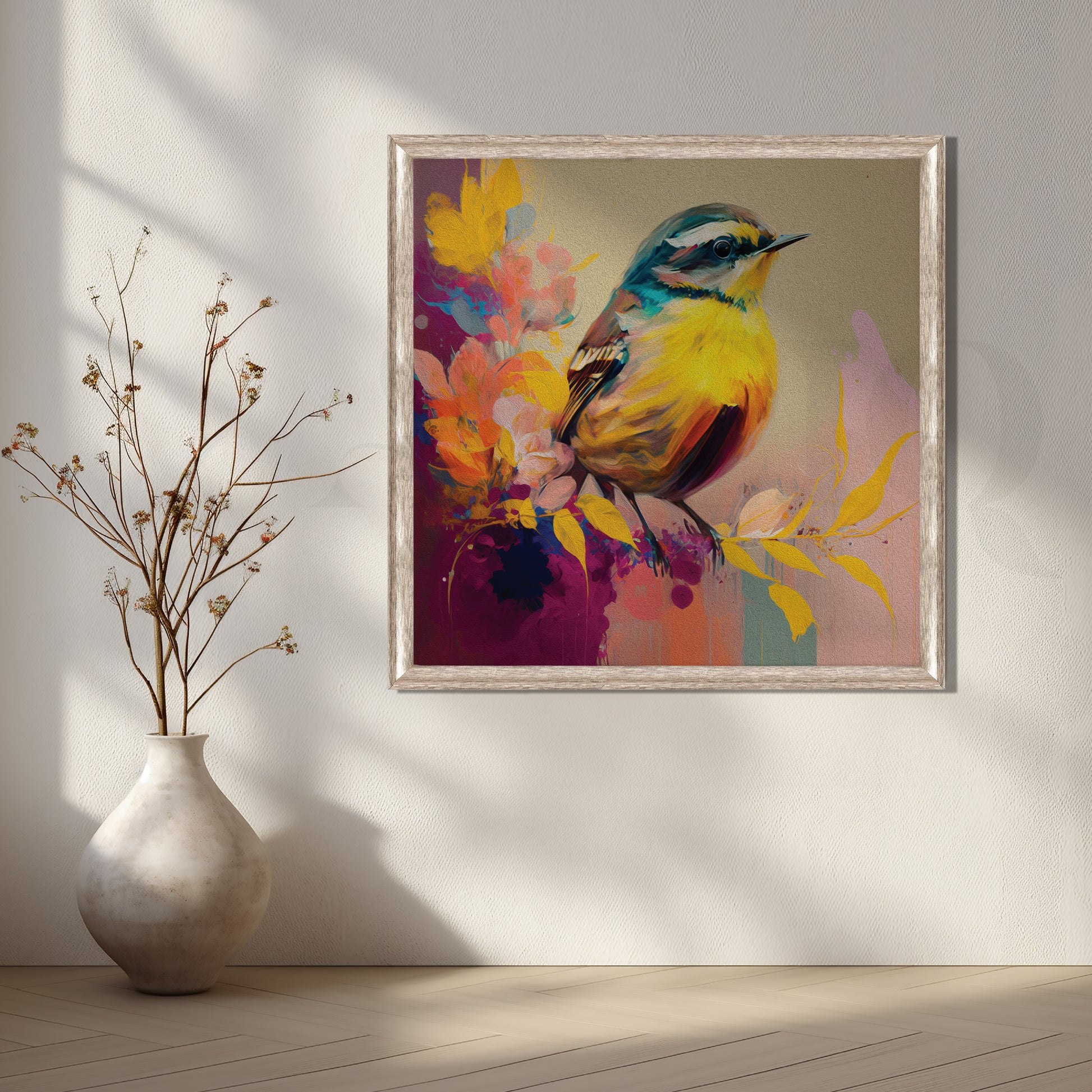 Breathe life into your space with this captivating abstract! A burst of colorful blooms surrounds a majestic bird, its form hinted at in swirling brushstrokes. Invite conversation and spark imagination with this unique piece, perfect for any modern collection.