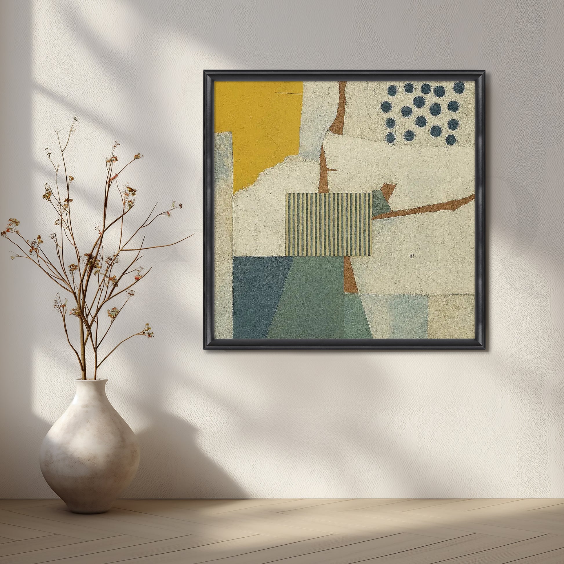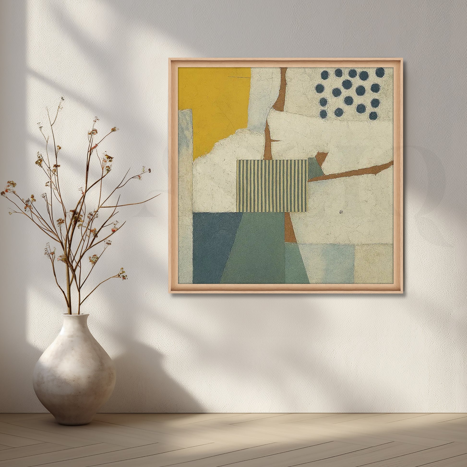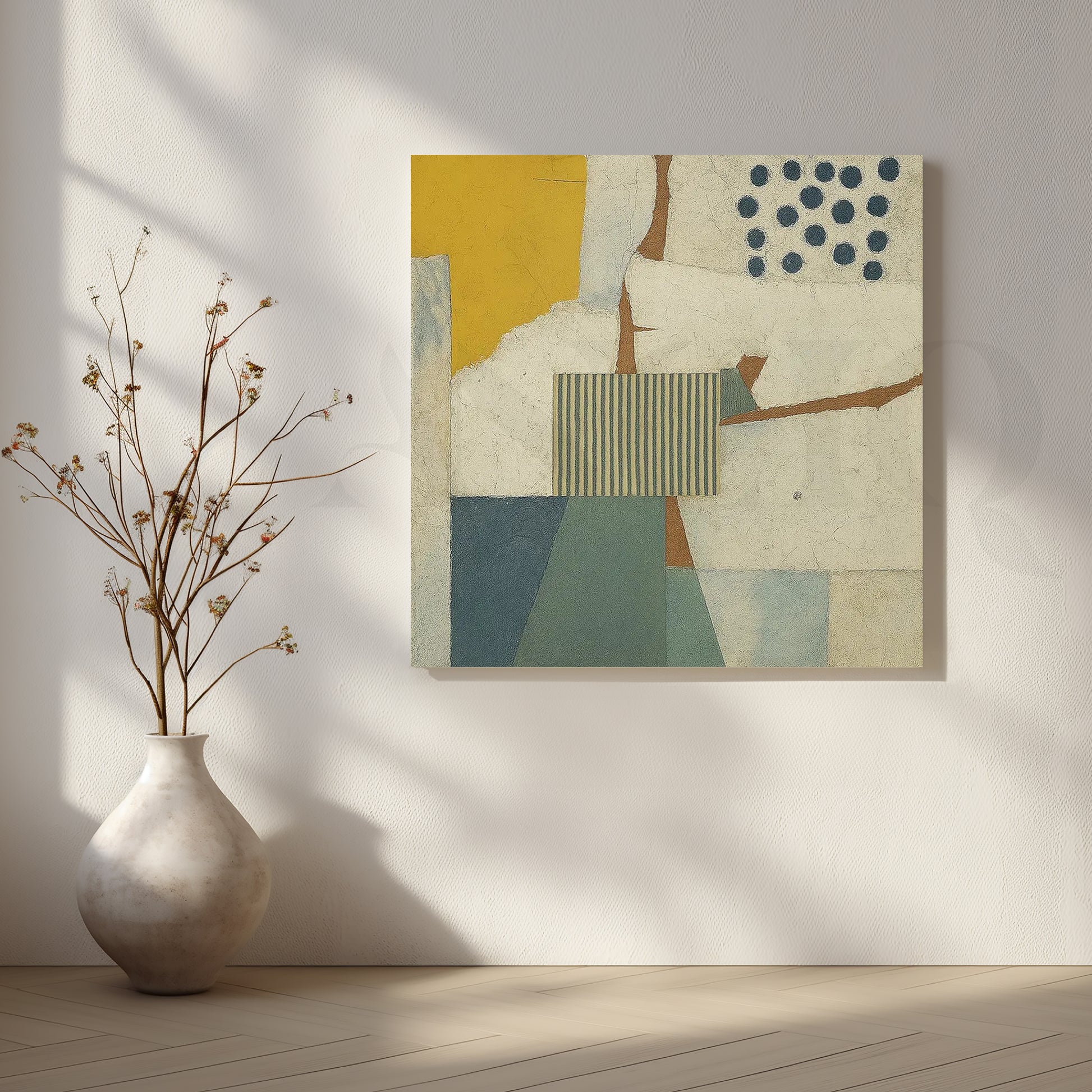This abstract canvas wall art features a calm collage of soft yellow, blue and cream blocks with subtle stripes and dots. The textured, modern design is perfect for Scandinavian interiors, neutral living rooms and cozy reading corners. Ideal for buyers searching for minimal abstract wall art and geometric canvas decor.