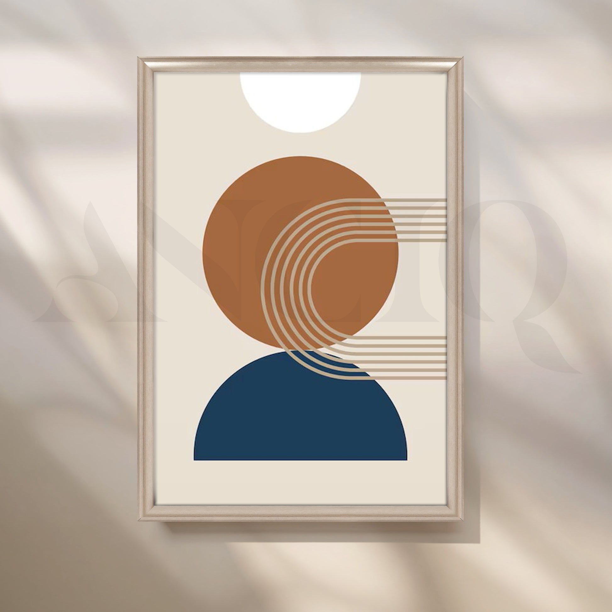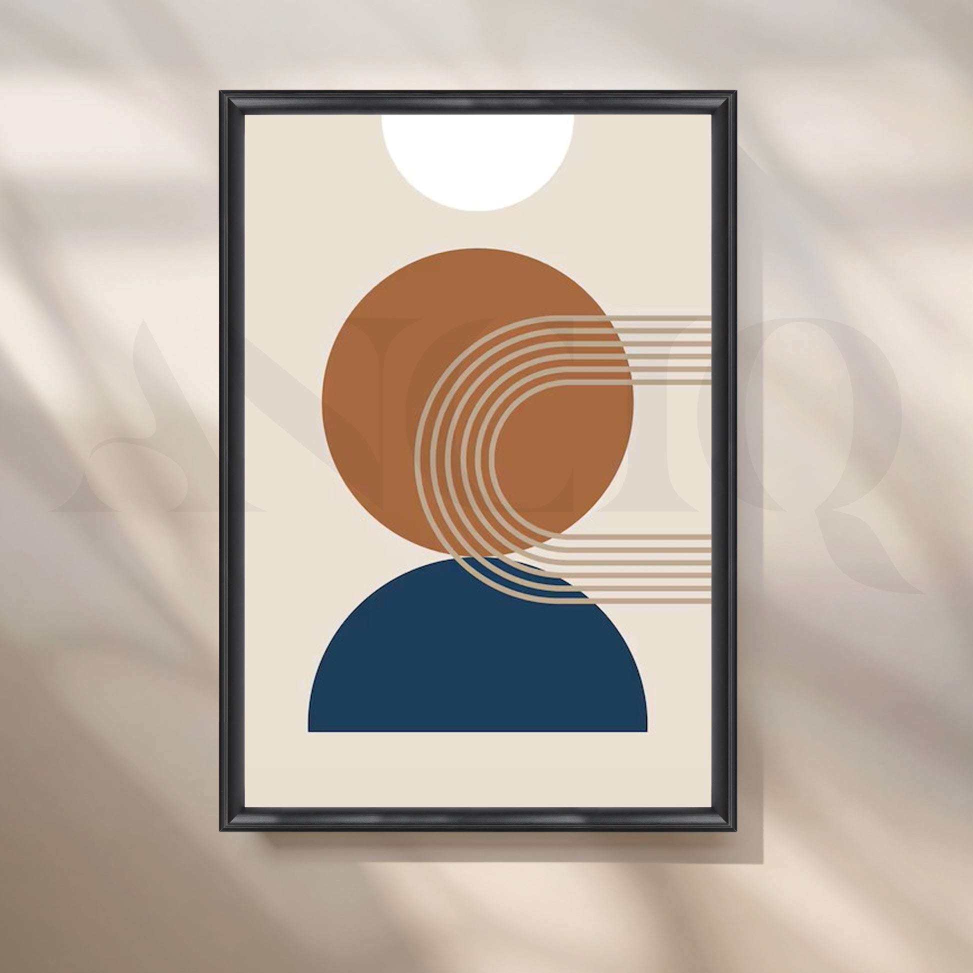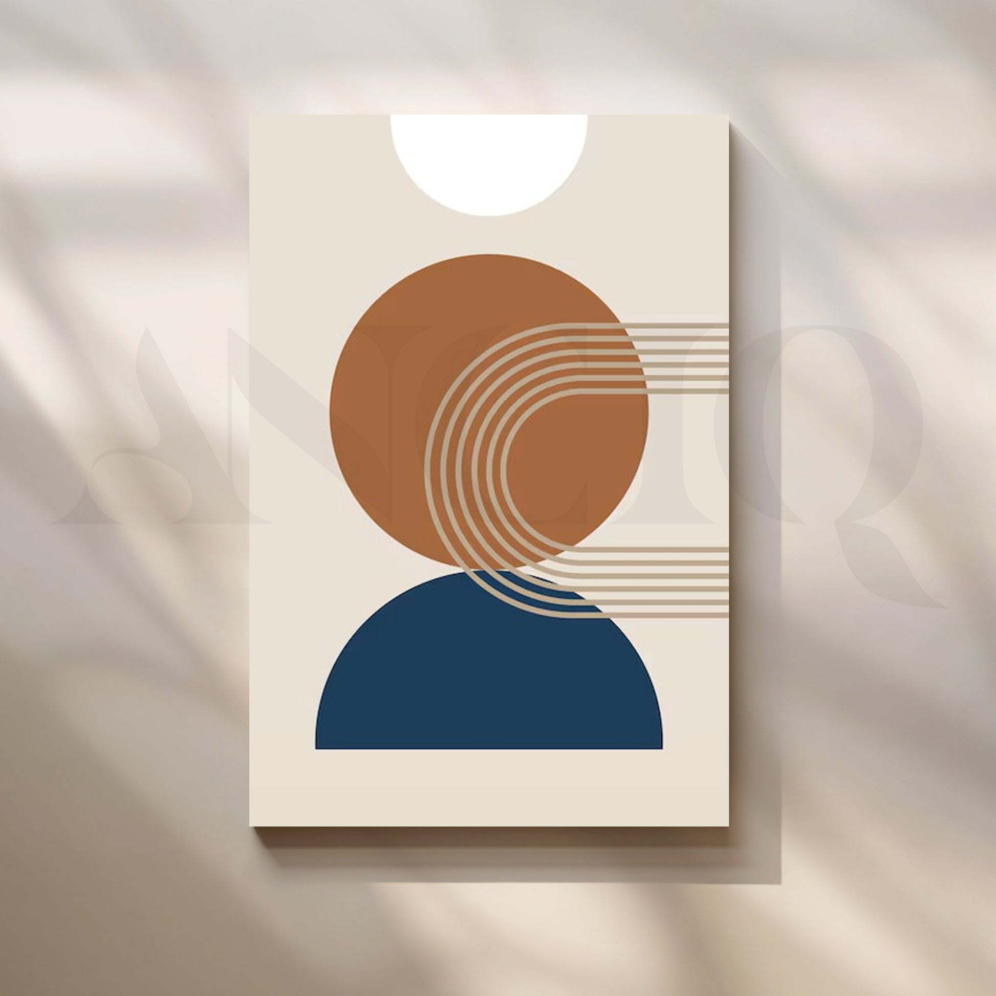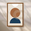 This minimal abstract canvas features a warm brown circle, navy half-moon and soft cream sun, linked with clean curved lines. The calm, modern design suits Scandinavian interiors, boho bedrooms and contemporary living rooms. Perfect for searches like geometric wall art, neutral abstract canvas and minimalist home decor.