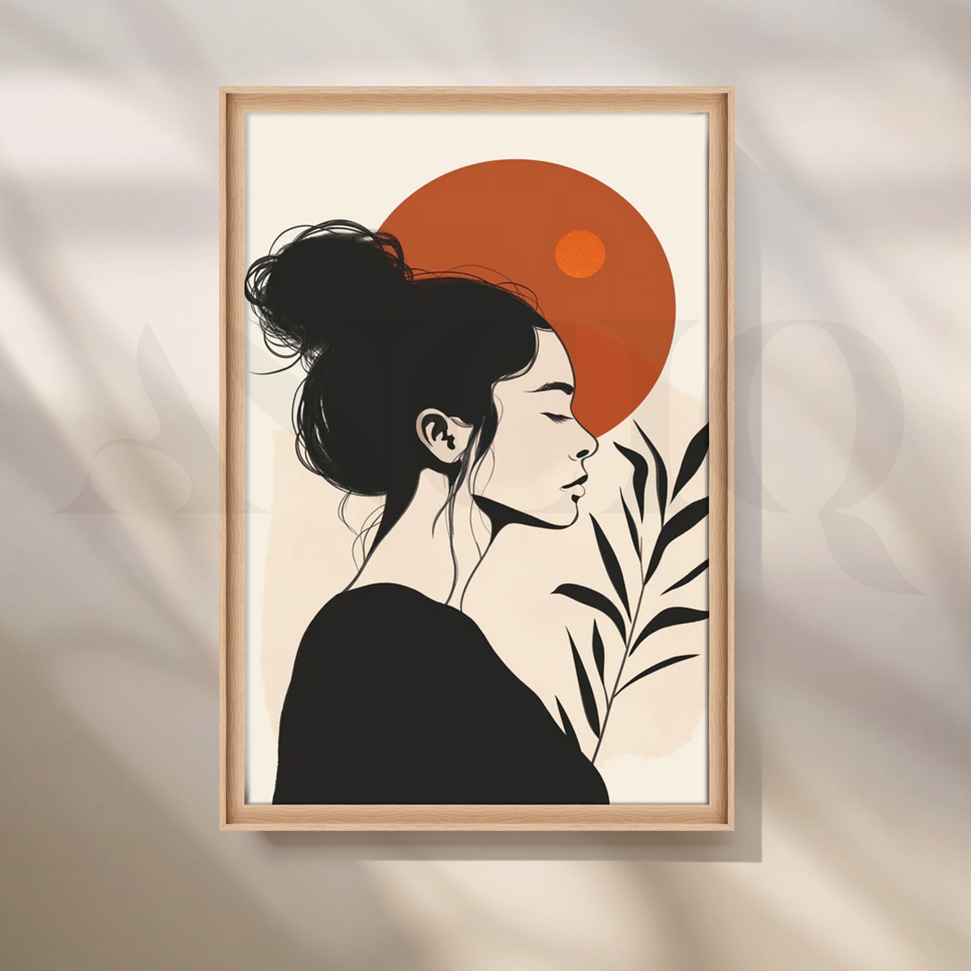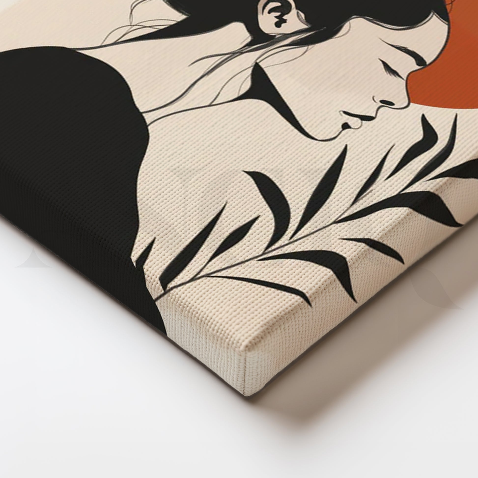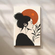 Graphic and elegant, this line-art portrait profiles a woman beneath a terracotta sun, accented with charcoal foliage and clean negative space. The neutral modern palette makes it versatile for Scandinavian, Japandi, or mid-century décor. Perfect as abstract canvas painting for a home office, studio, or hallway, it delivers crisp, contemporary style while pairing effortlessly with natural woods, black accents, and boho bedroom décor.