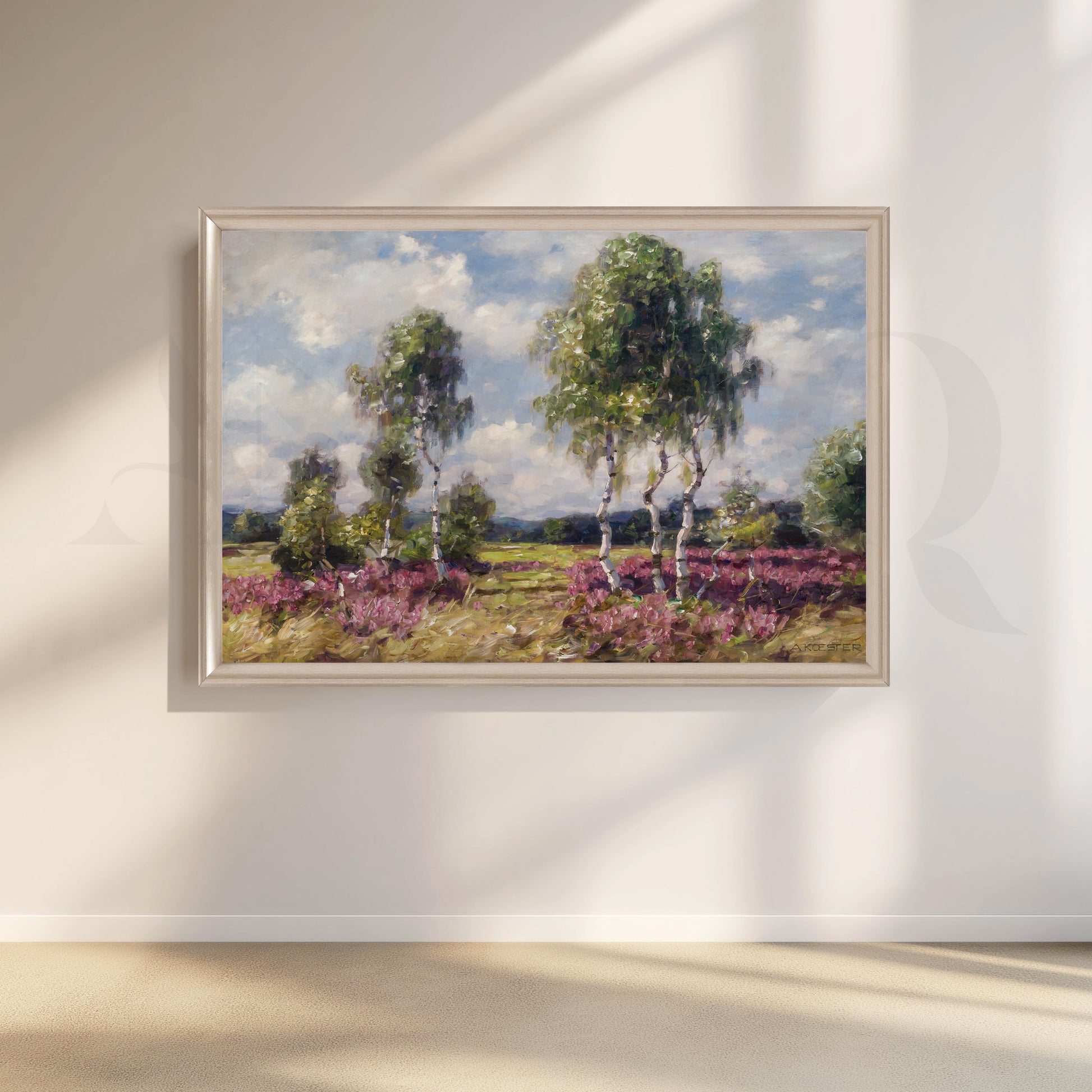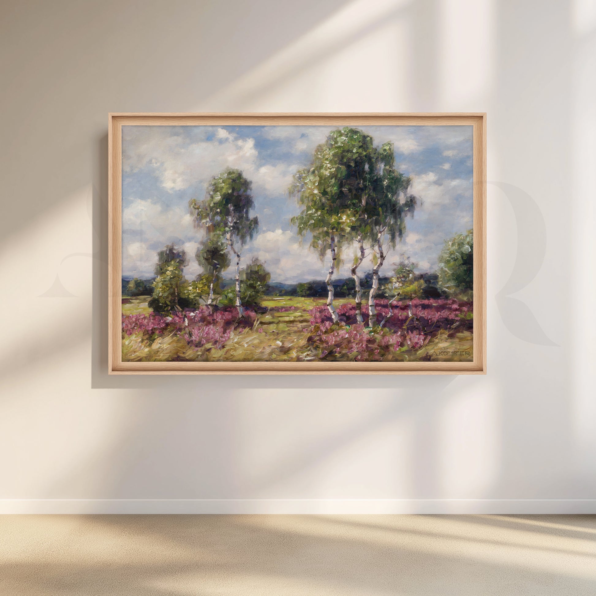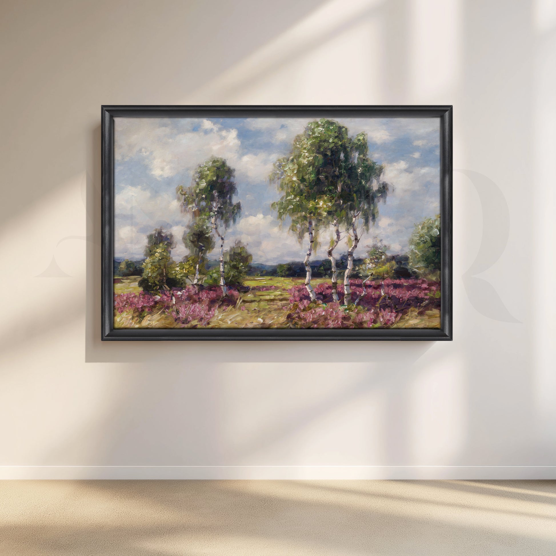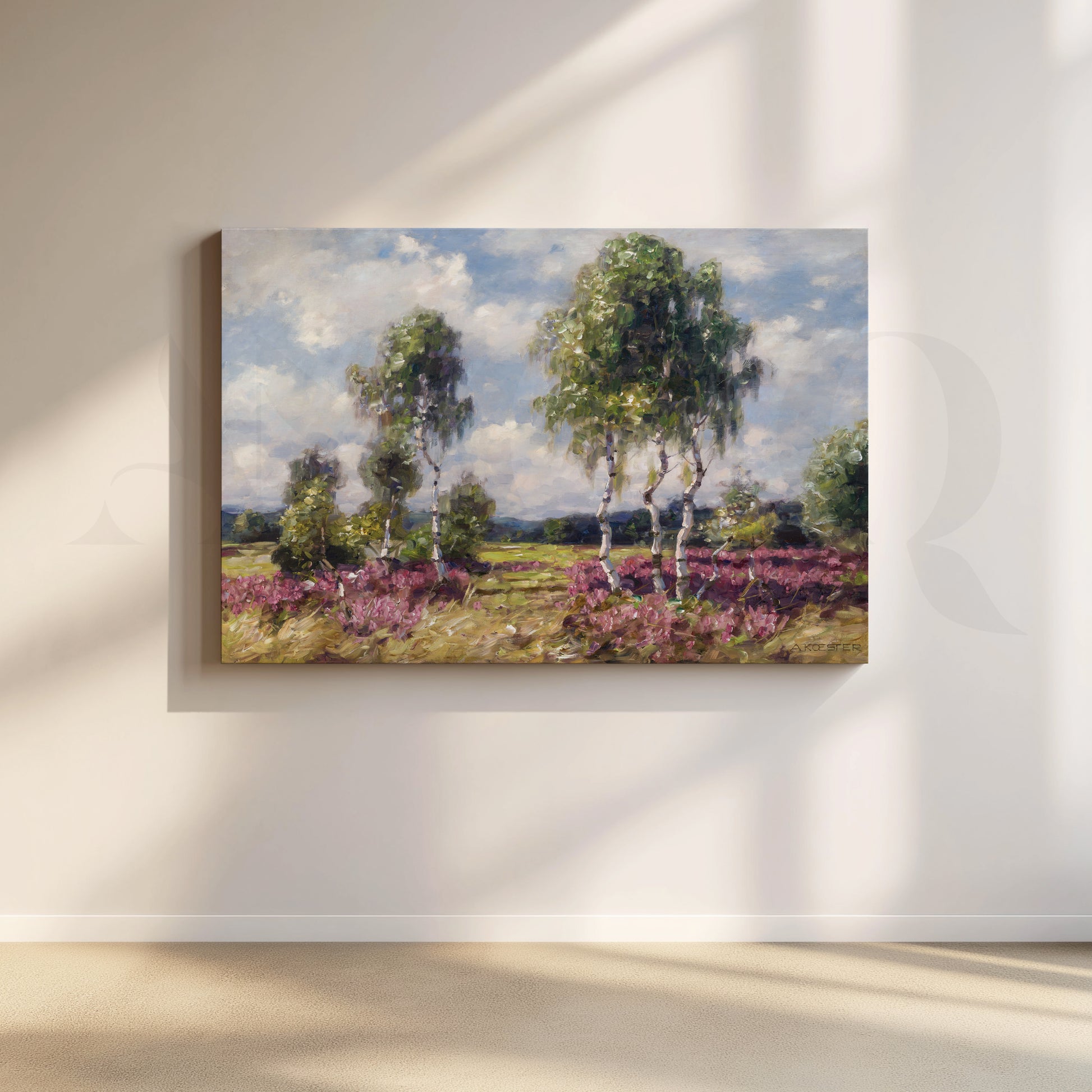 A light-filled landscape of birch trees swaying above soft purple wildflowers under a wide blue sky. This calming canvas wall art brings an airy, Scandinavian feel to modern living rooms, lounges, and reading corners—perfect for nature décor, serene home styling, and minimal interiors.