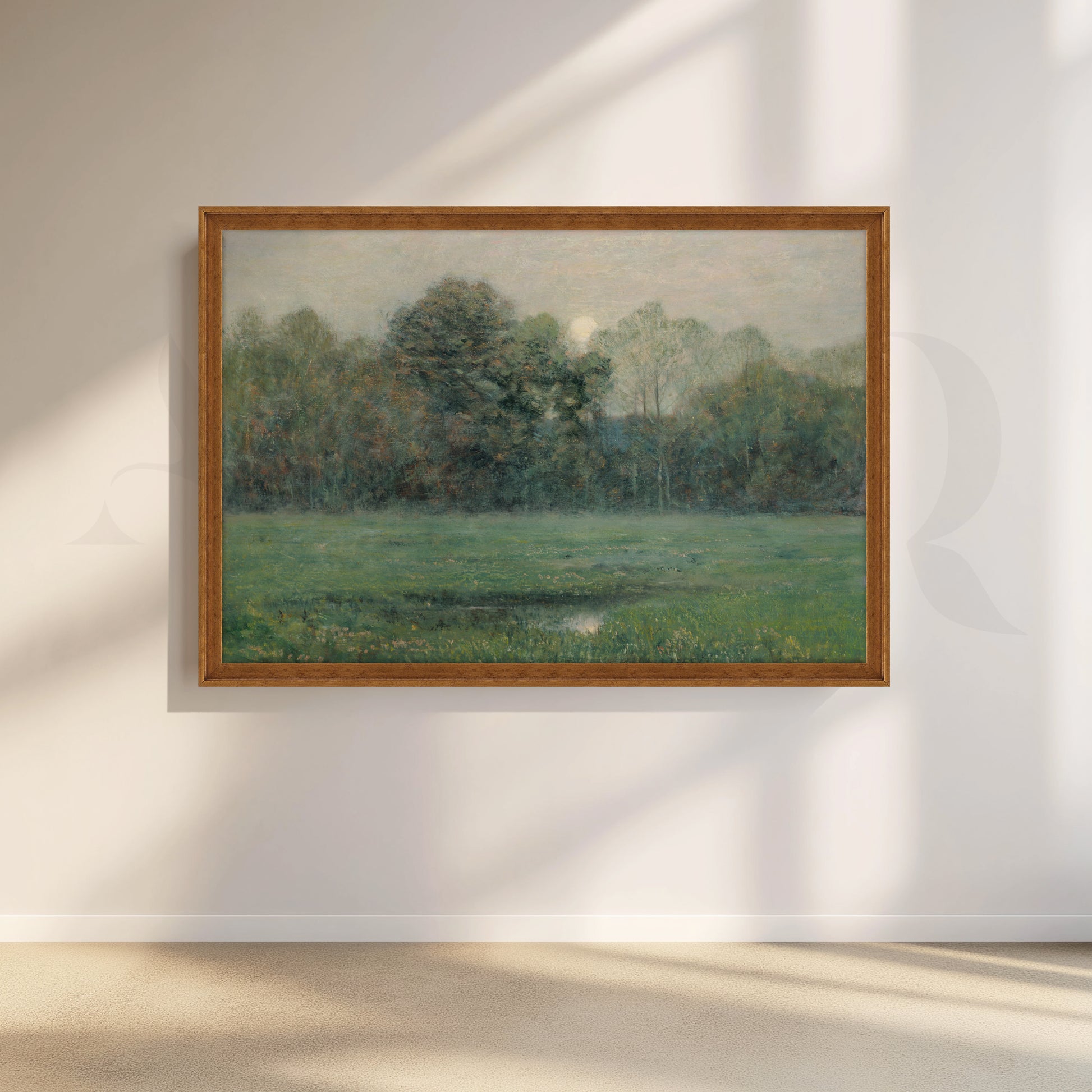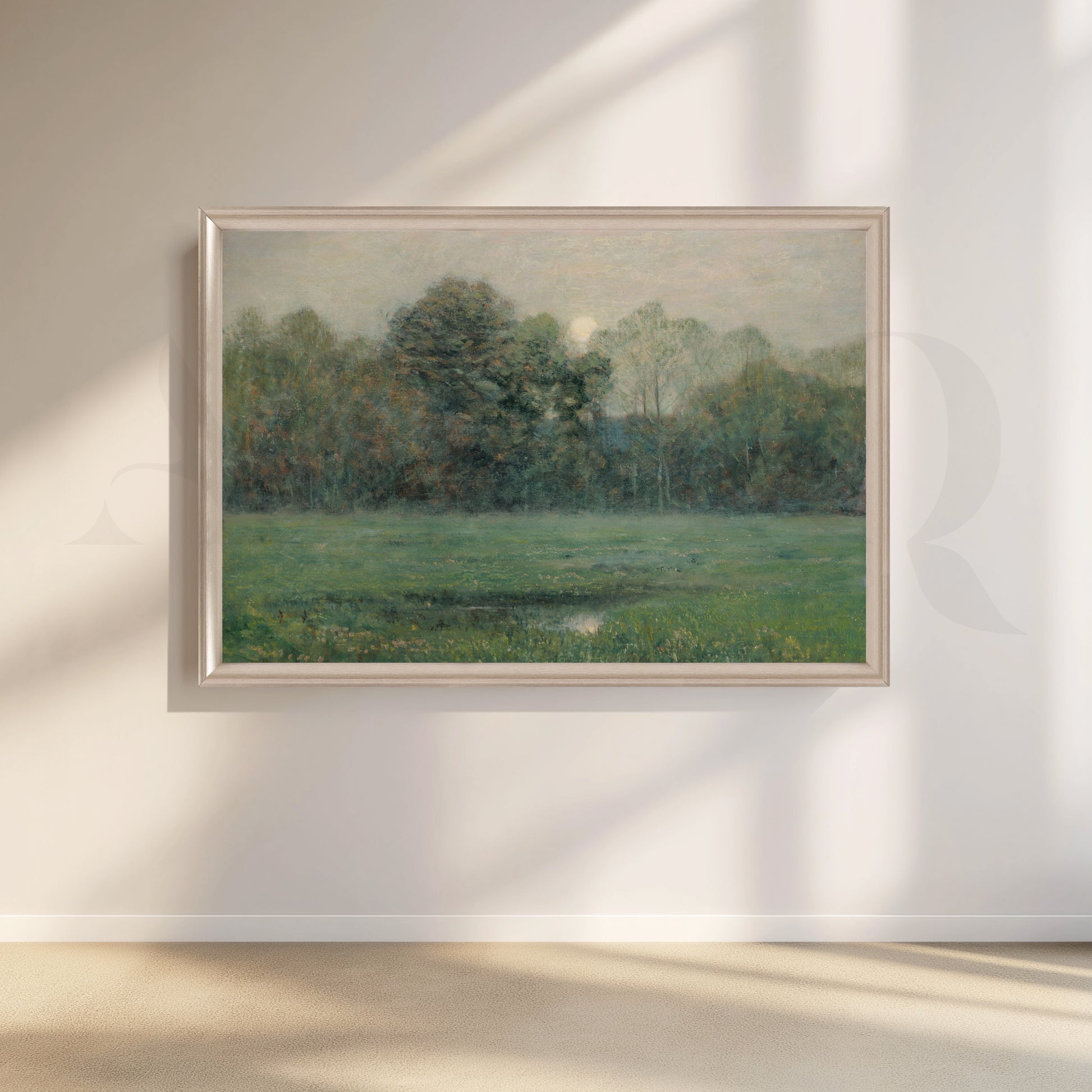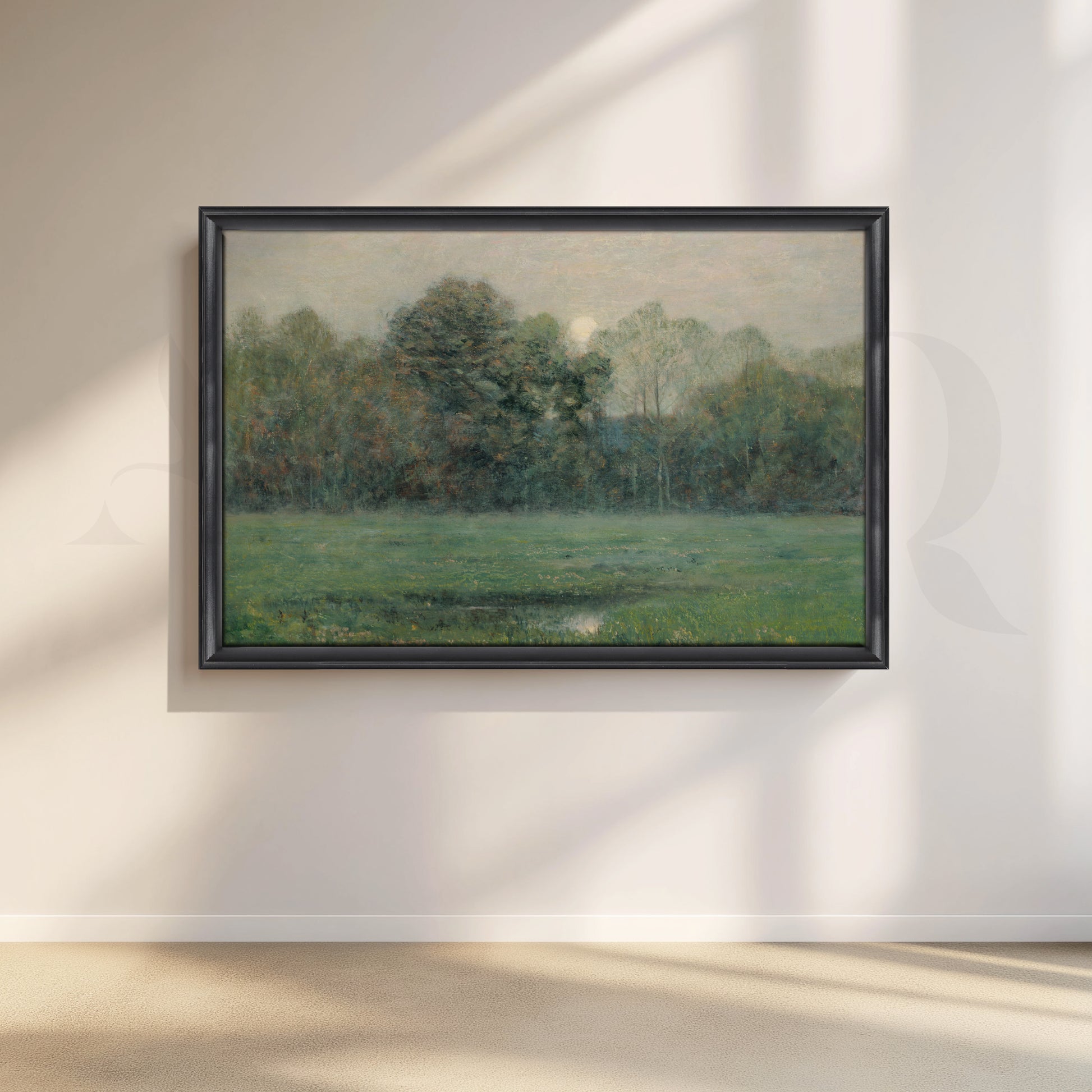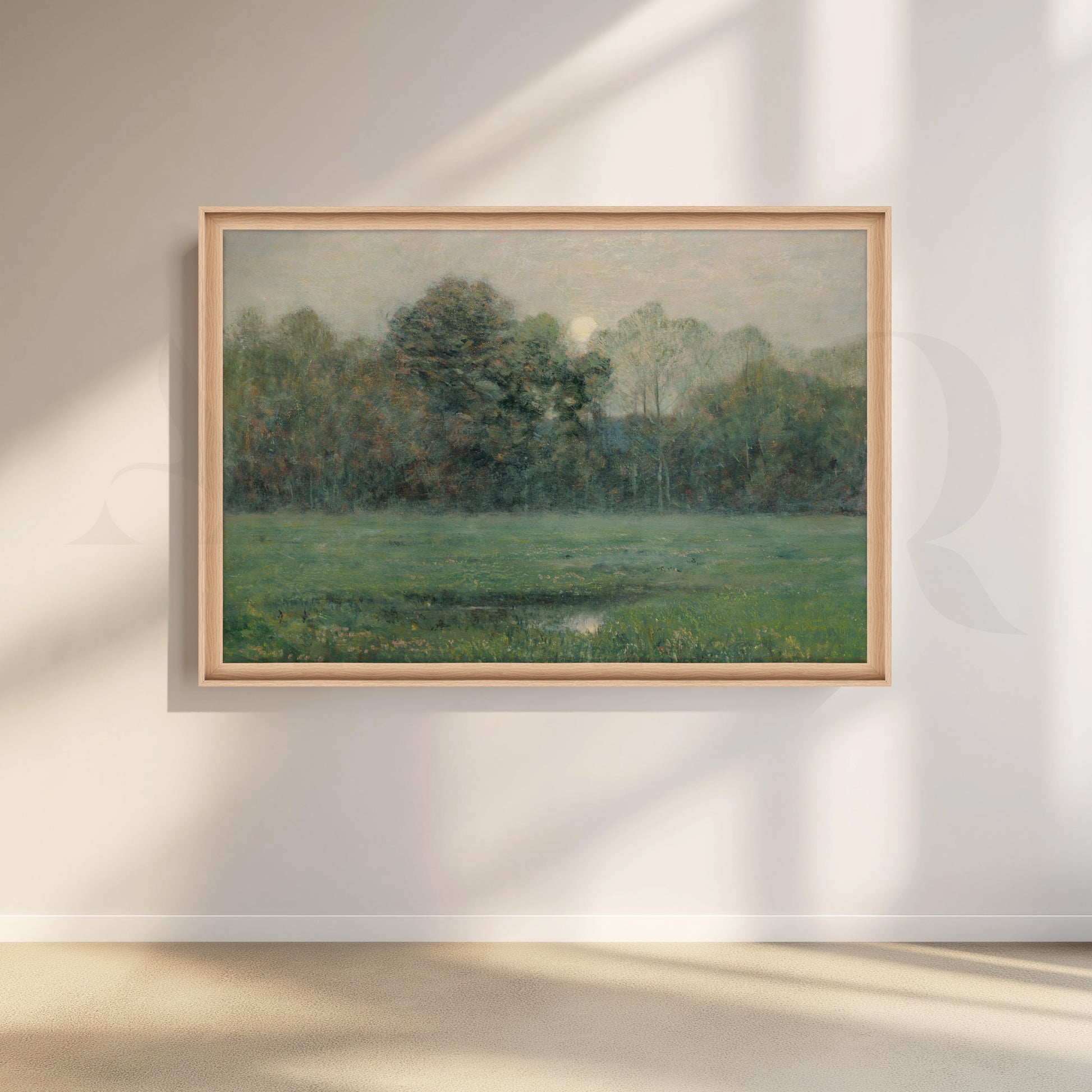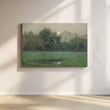 A quiet, atmospheric canvas painting of an open meadow with a tree line and gentle mist, in muted greens and greys. This serene nature wall art suits modern, Scandinavian, and minimal interiors—perfect for entryways, living rooms, and soothing bedroom décor.