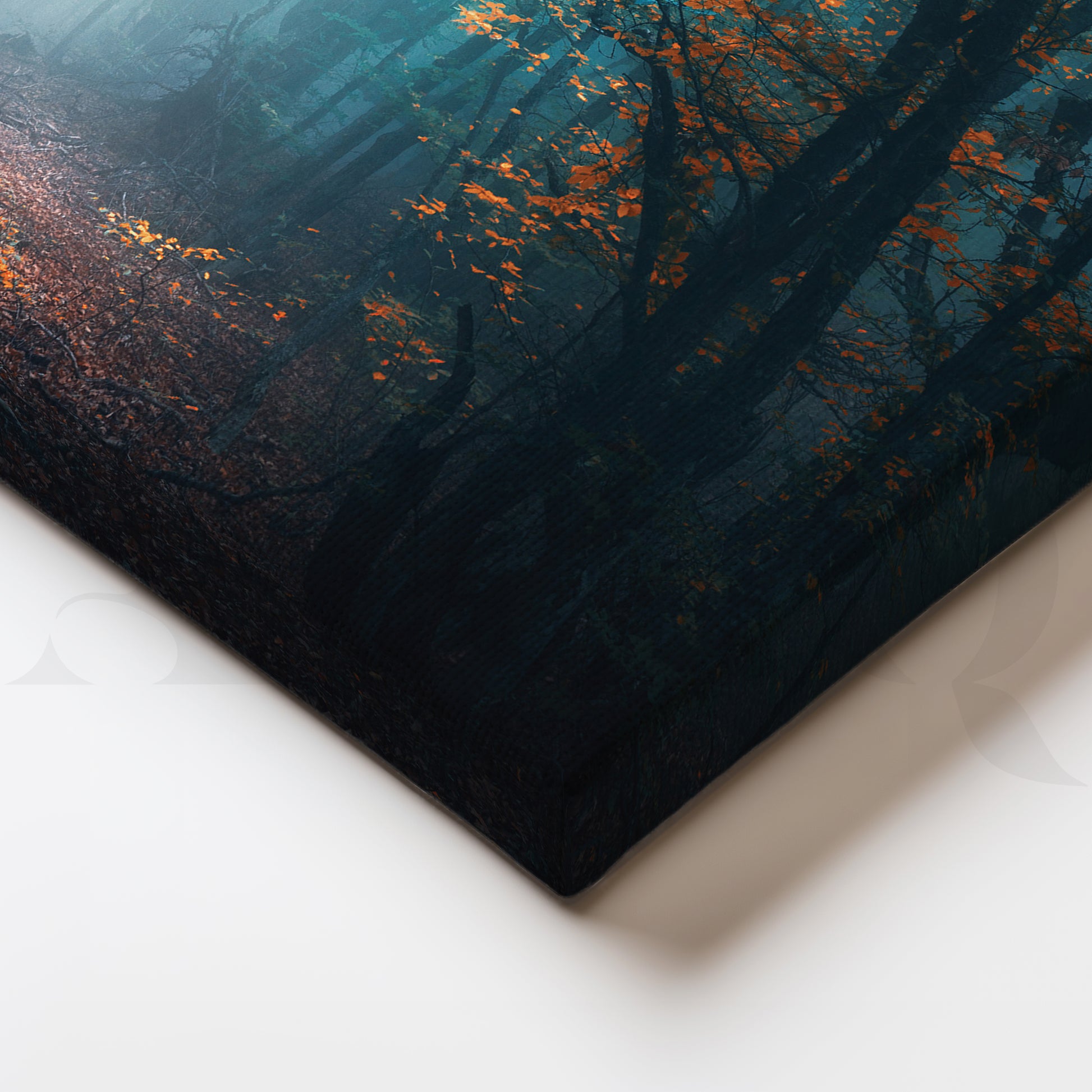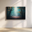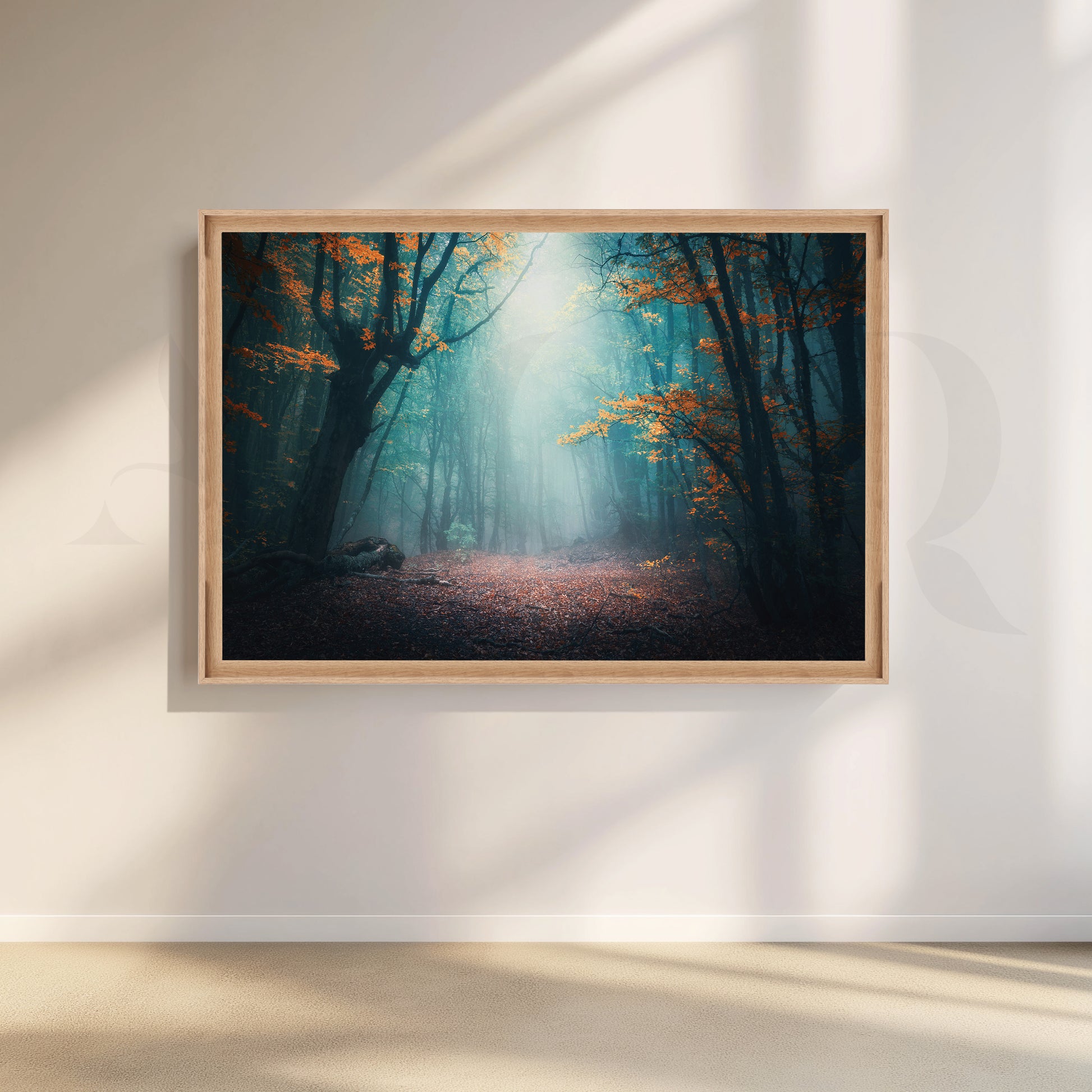 Immerse yourself in the serenity of a mystical forest with this stunning canvas painting. The sunlight peeks through the dense fog, casting an ethereal glow on the colorful leaves of the trees. The perfect piece to bring some natural serenity into your home.