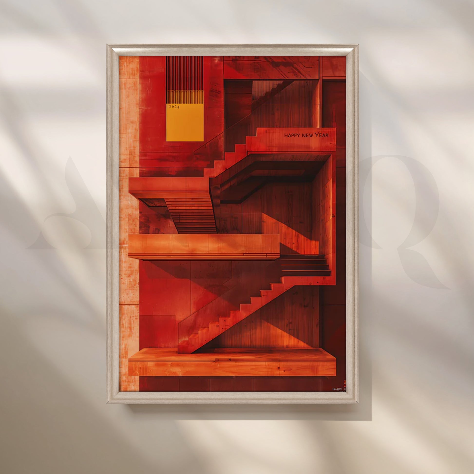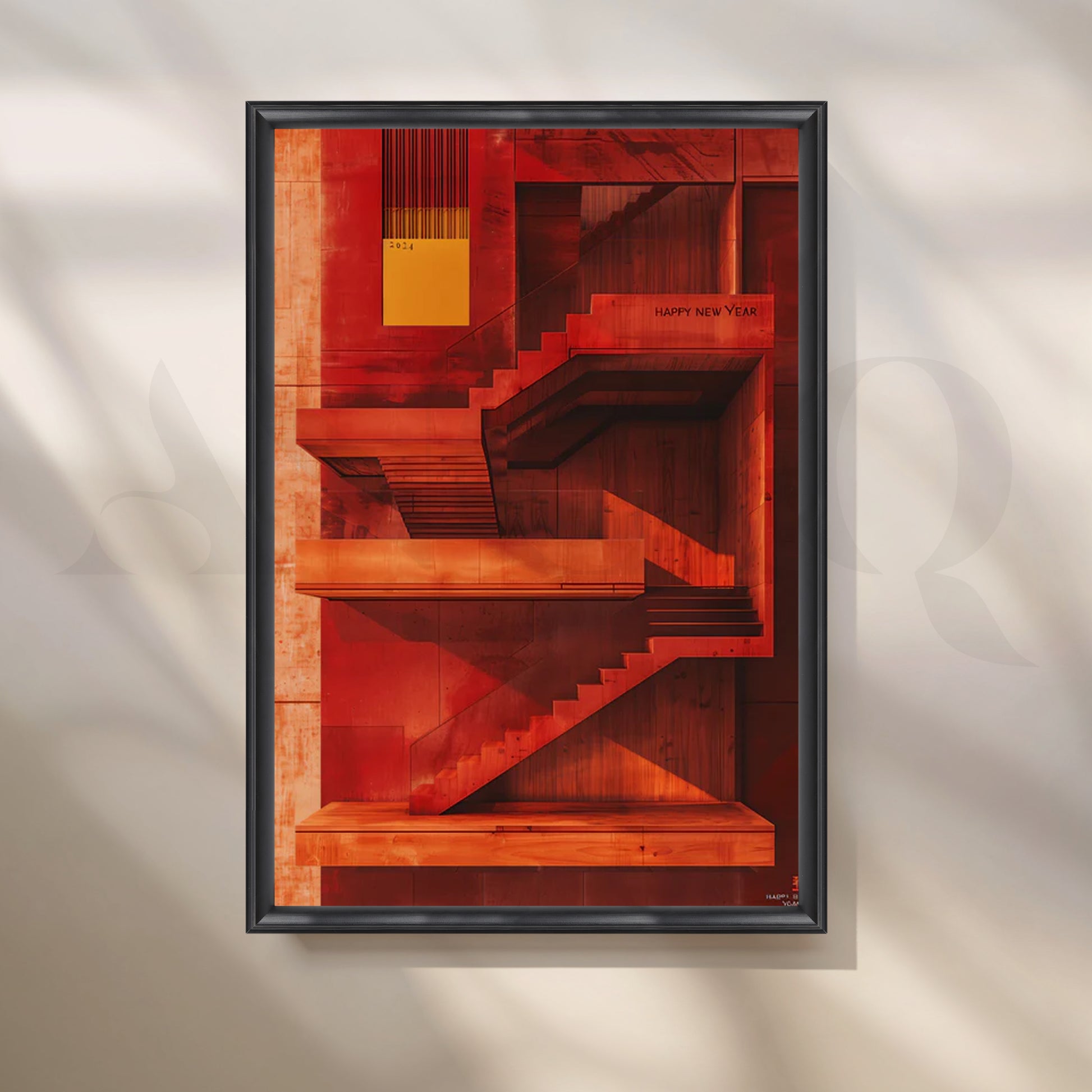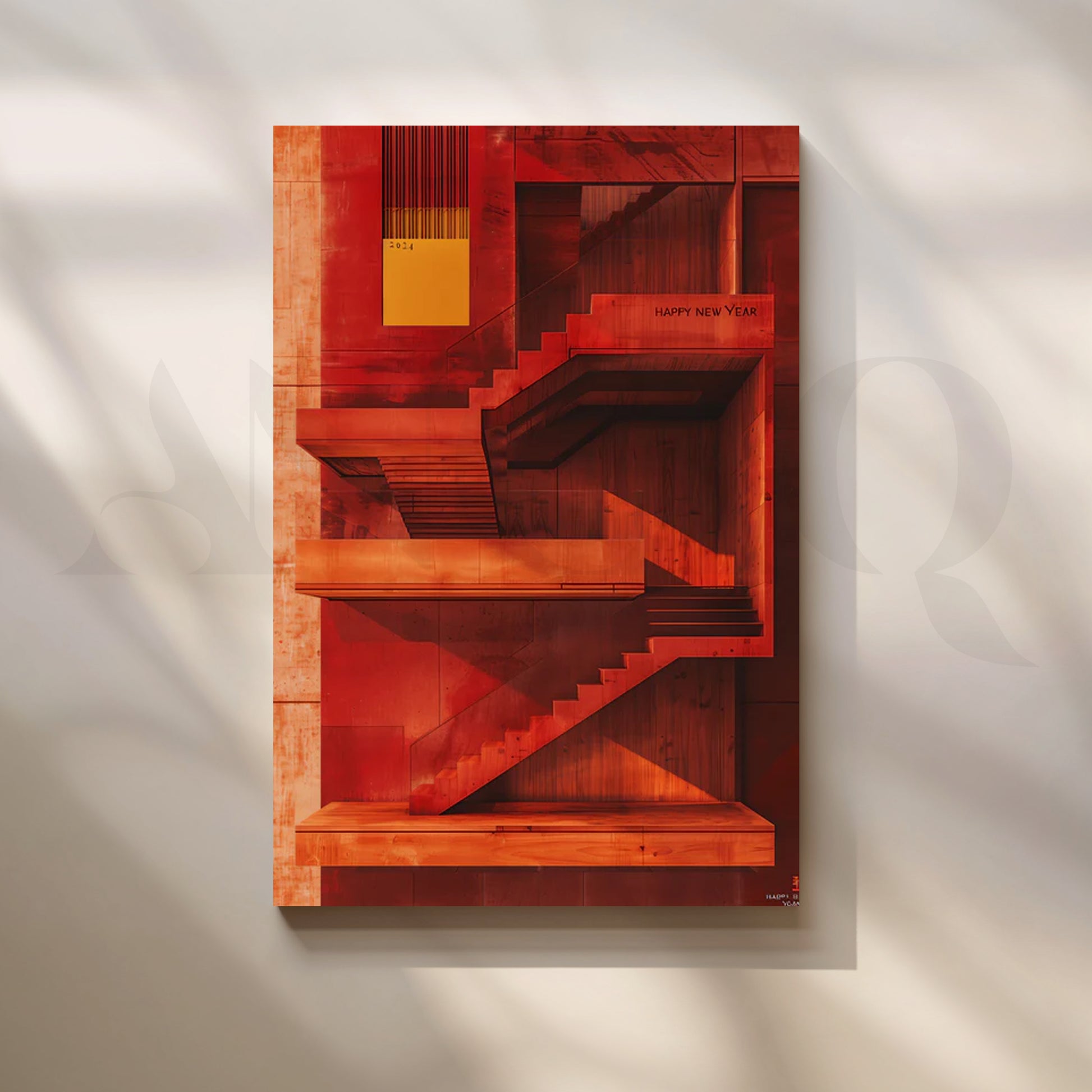 The Modern Abstract Staircase Poster features a captivating interplay of geometric forms and warm red tones. Highlighting staircases and architectural patterns, this wall poster creates a contemporary ambiance, ideal for art lovers and modern interiors.