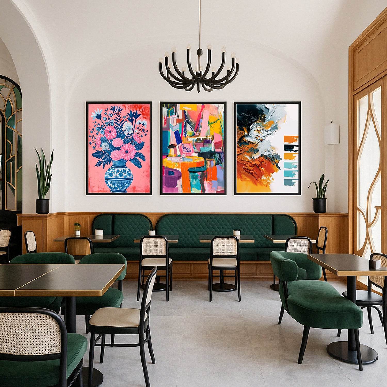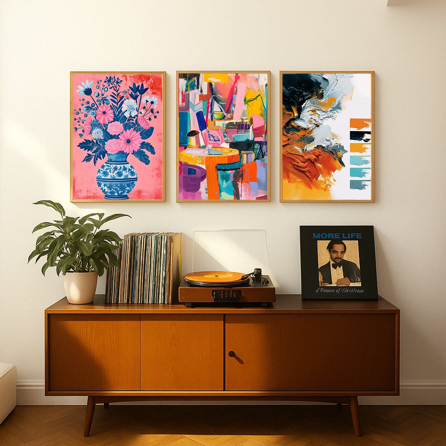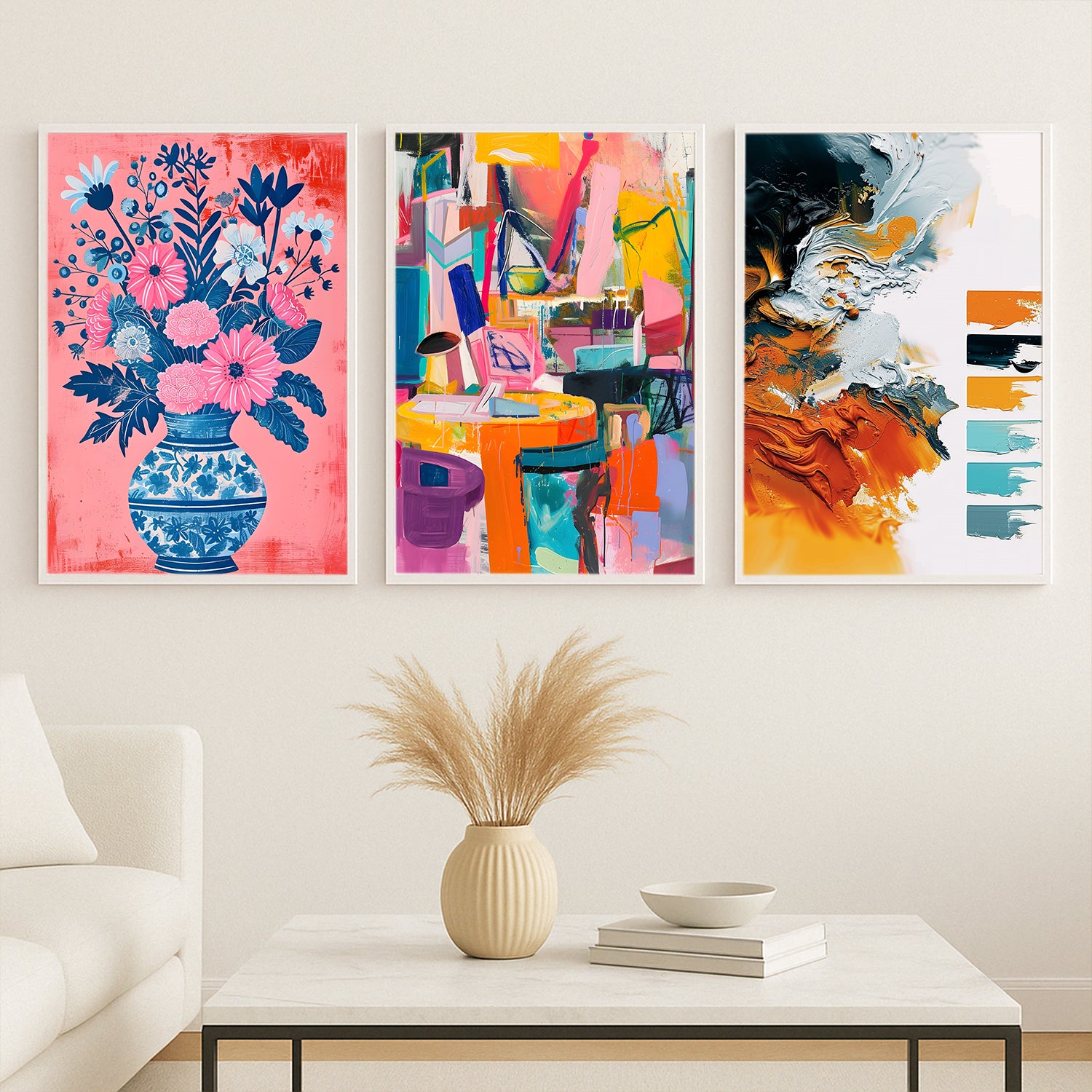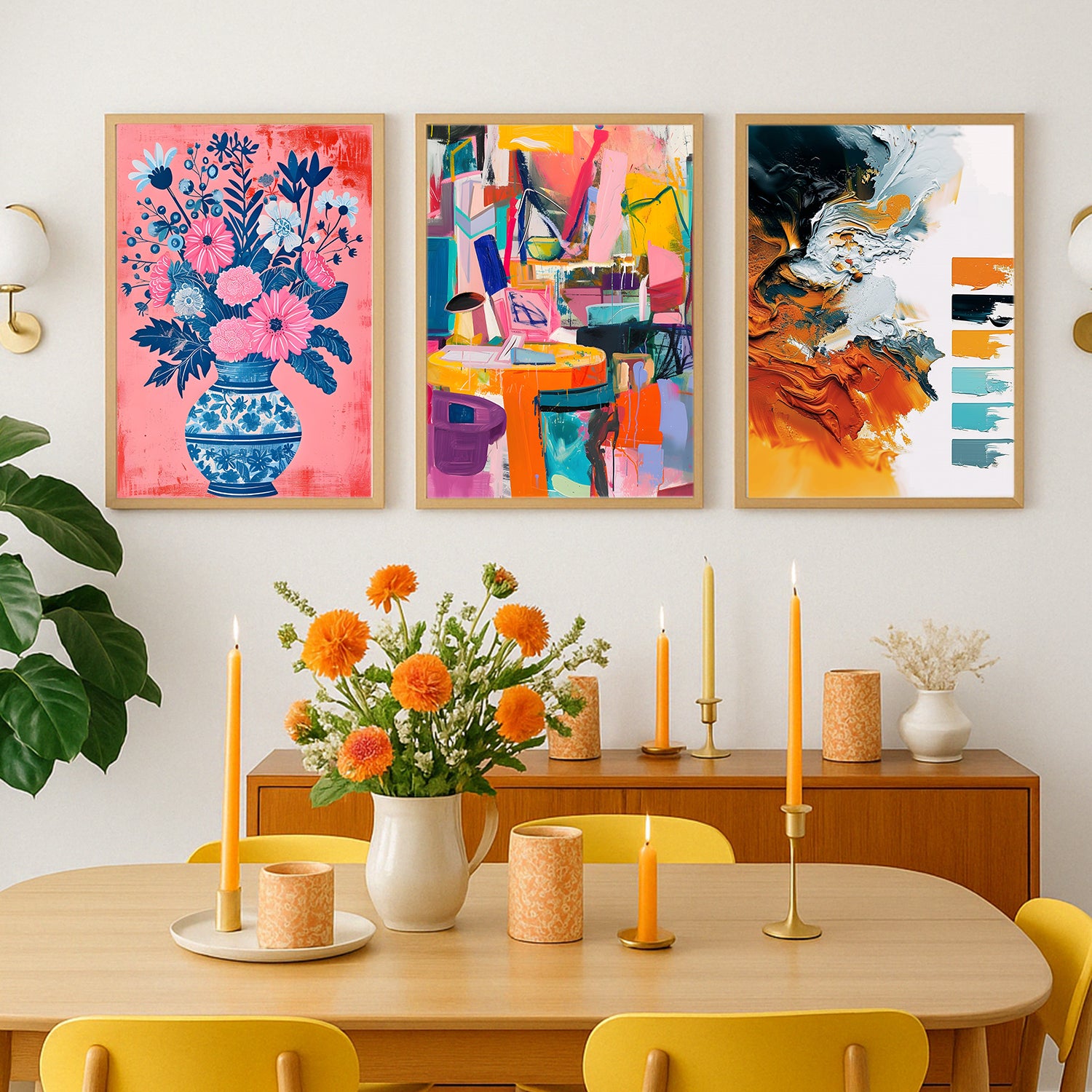 Modern Bold Hues Gallery Walls combine floral charm, expressive abstract strokes, and fiery color palettes. This Gallery walls set adds warmth and personality—ideal for dining spaces with a love for modern eclectic style.