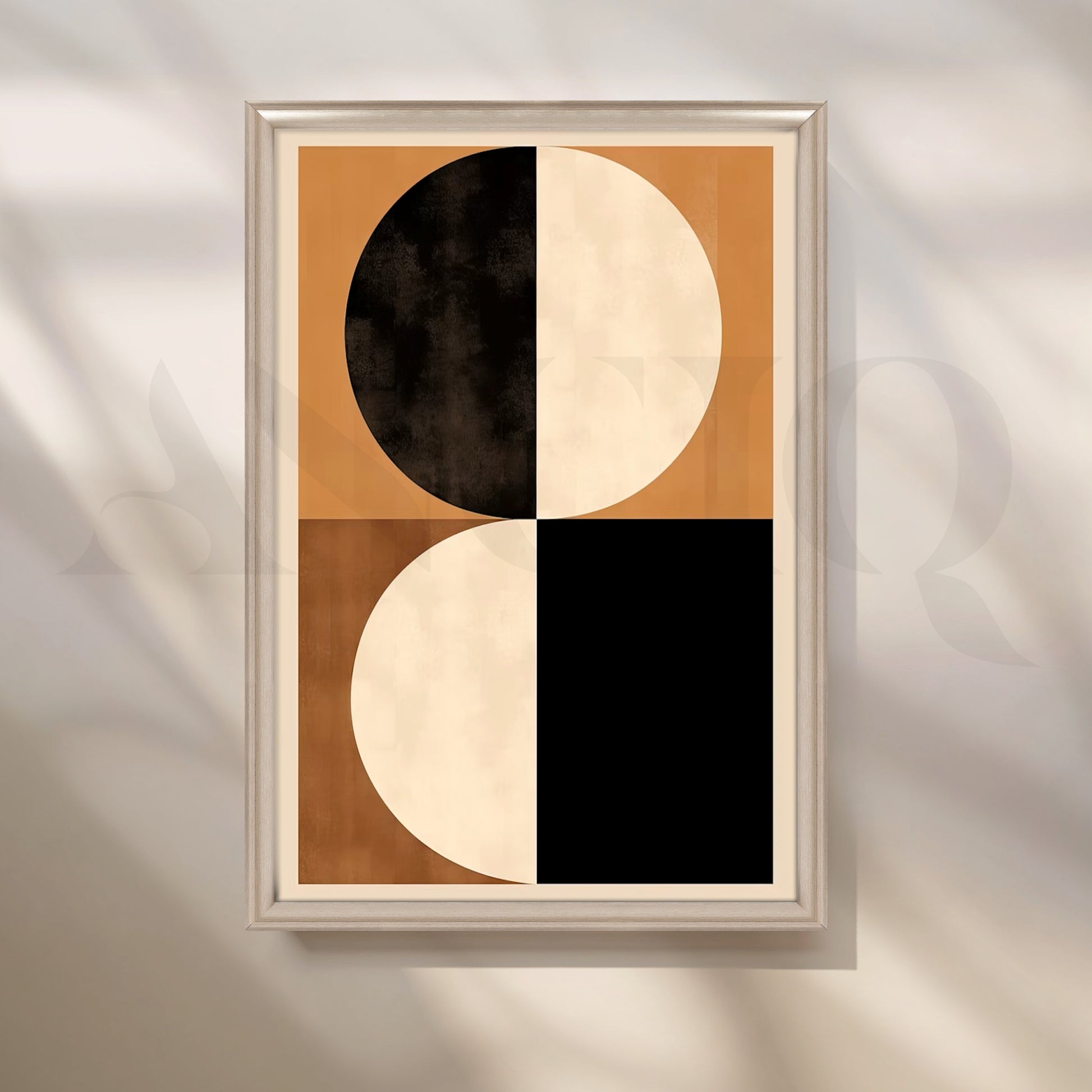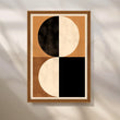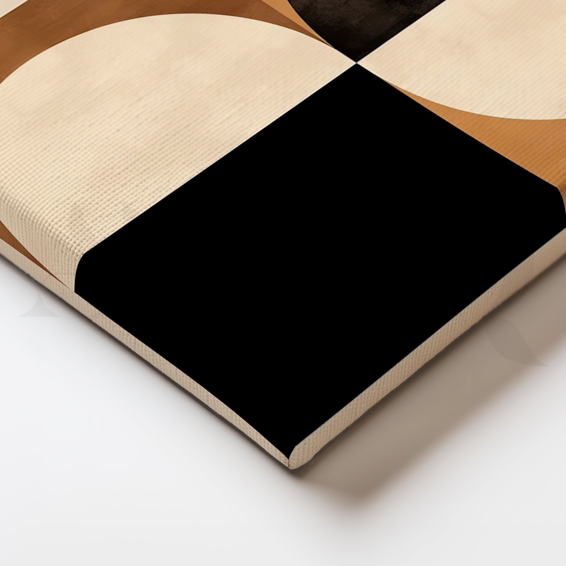 A clean geometric canvas featuring intersecting circles and blocks in black, beige, and warm tan tones. This minimal abstract wall art suits contemporary living rooms, hallways, and offices, ideal for styling neutral interiors. Perfect for searches like modern geometric art, Scandi wall decor, and abstract canvas prints.