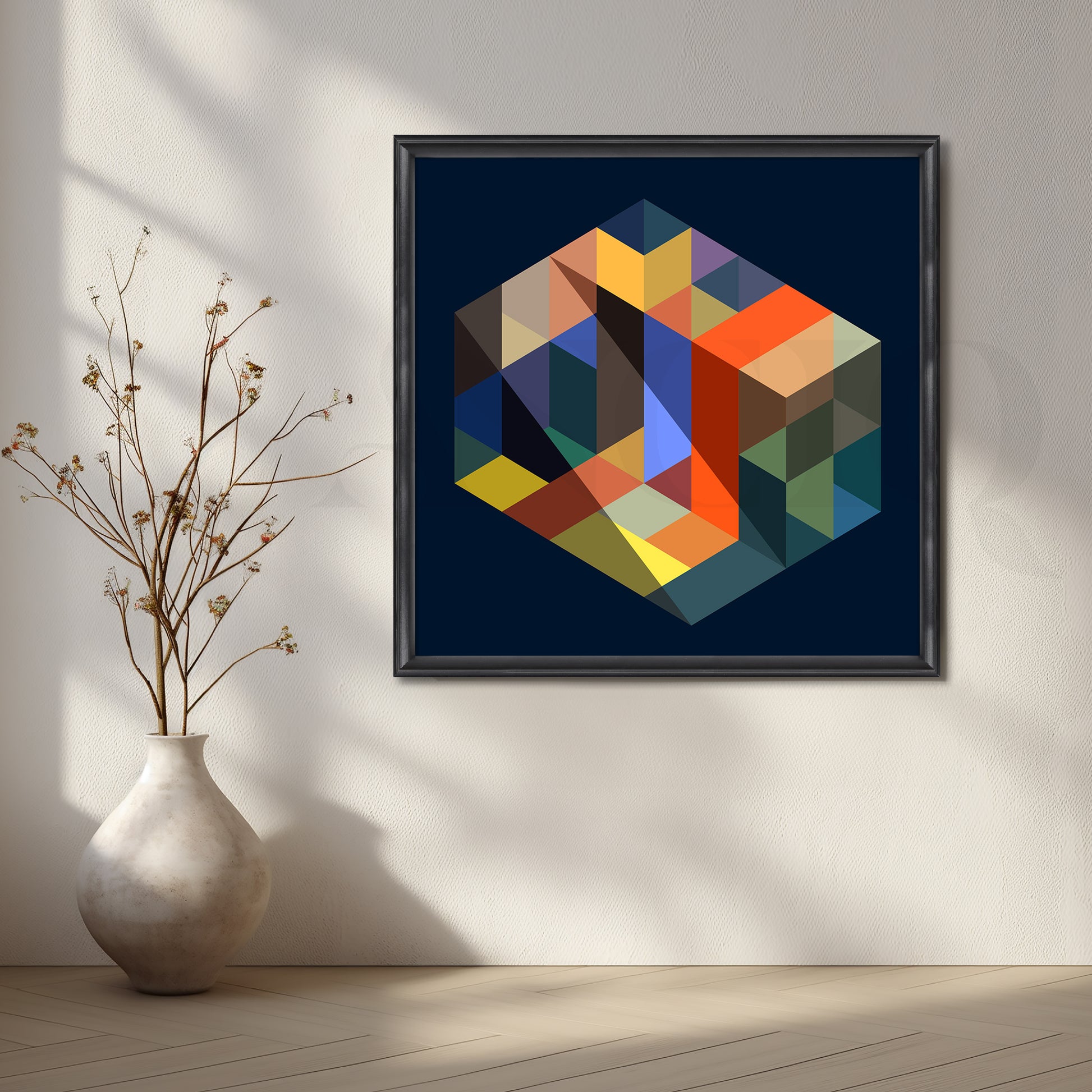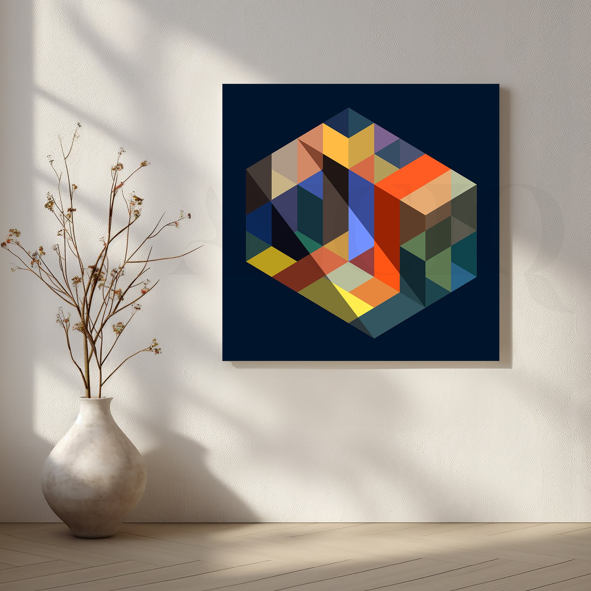 This geometric canvas artwork showcases an isometric cube made of colourful triangles on a deep navy background, creating a 3D illusion. Ideal for contemporary living rooms, study rooms, and workspaces, it’s great for those searching for geometric wall art, modern abstract canvas, and bold minimal decor.