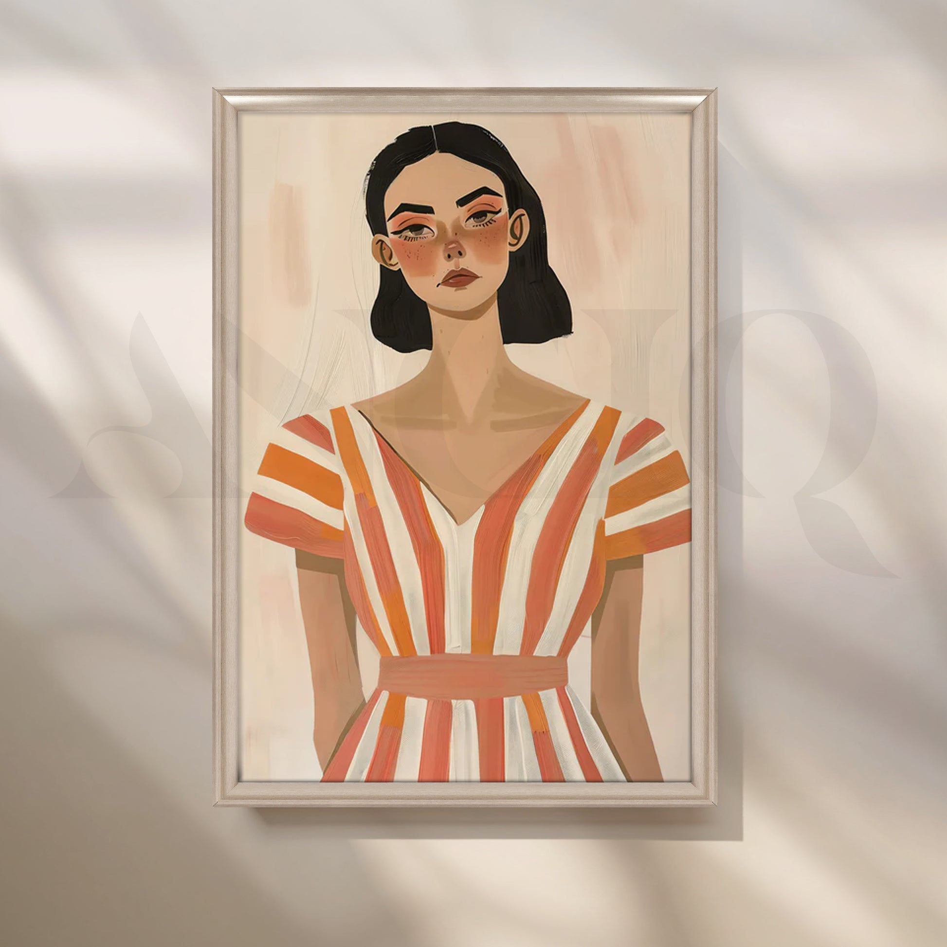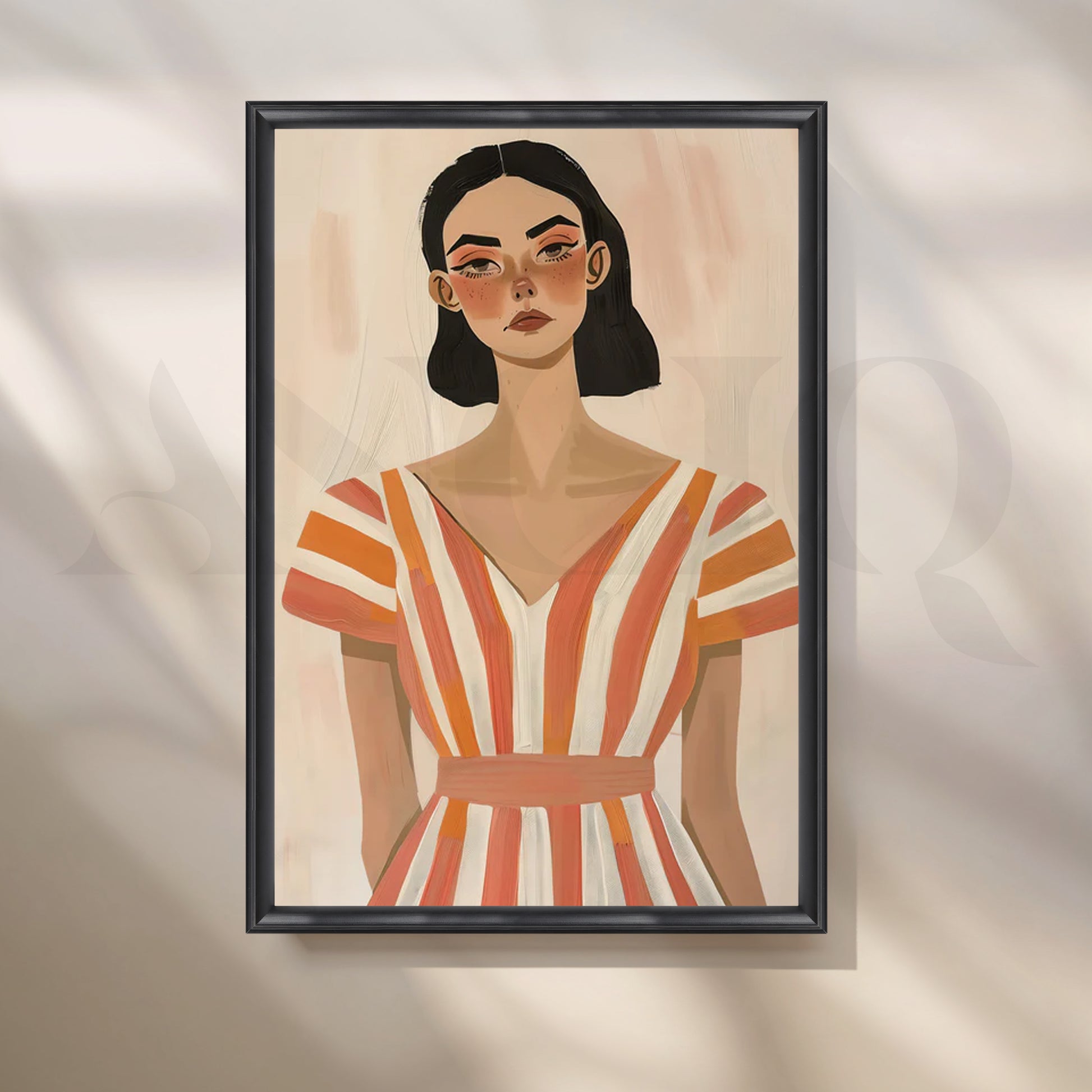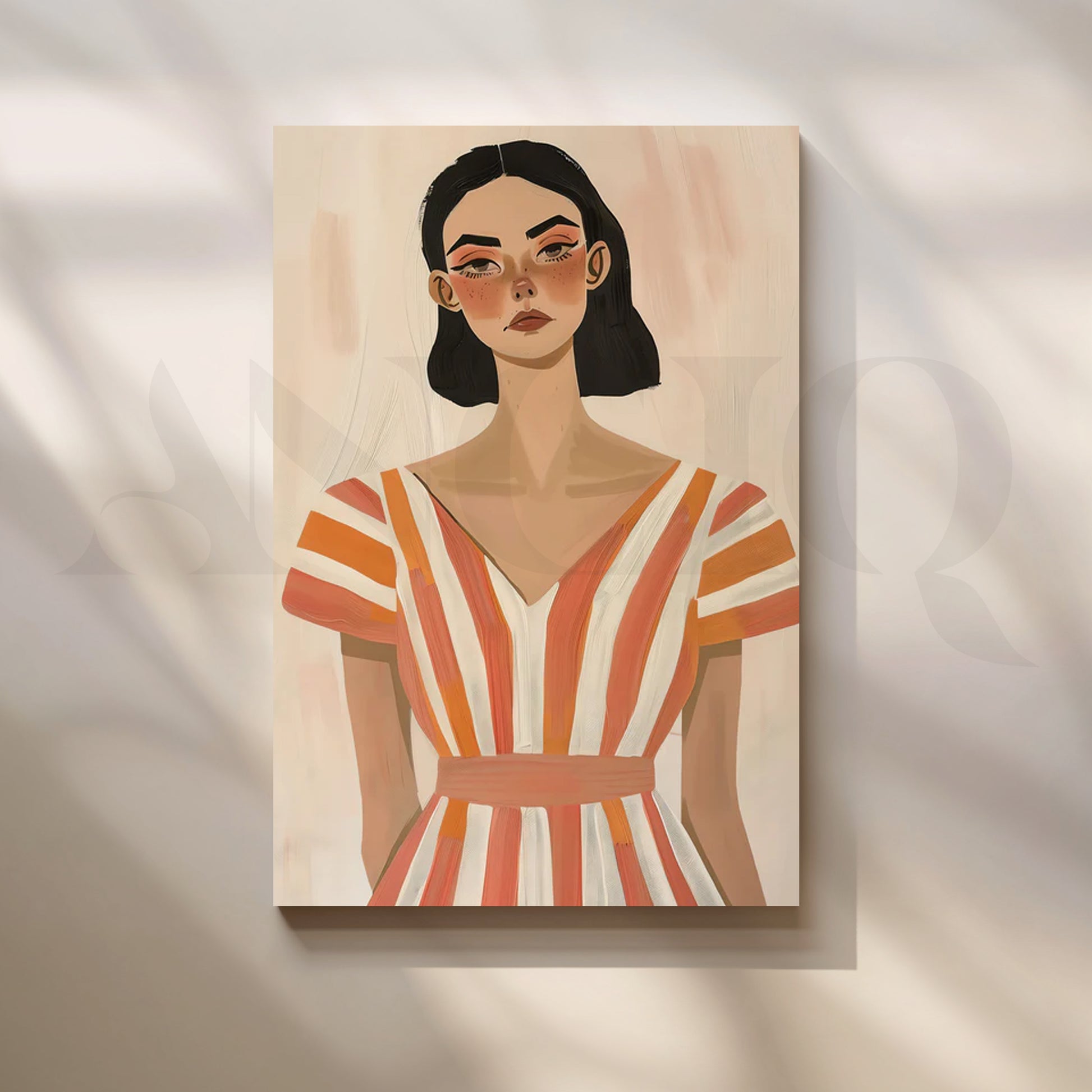 The Modern Portrait Wall Poster highlights a contemporary illustration of a woman with a striped orange and white dress. This wall poster exudes elegance with its soft color palette and minimalistic style, perfect for enhancing any modern or artistic space.