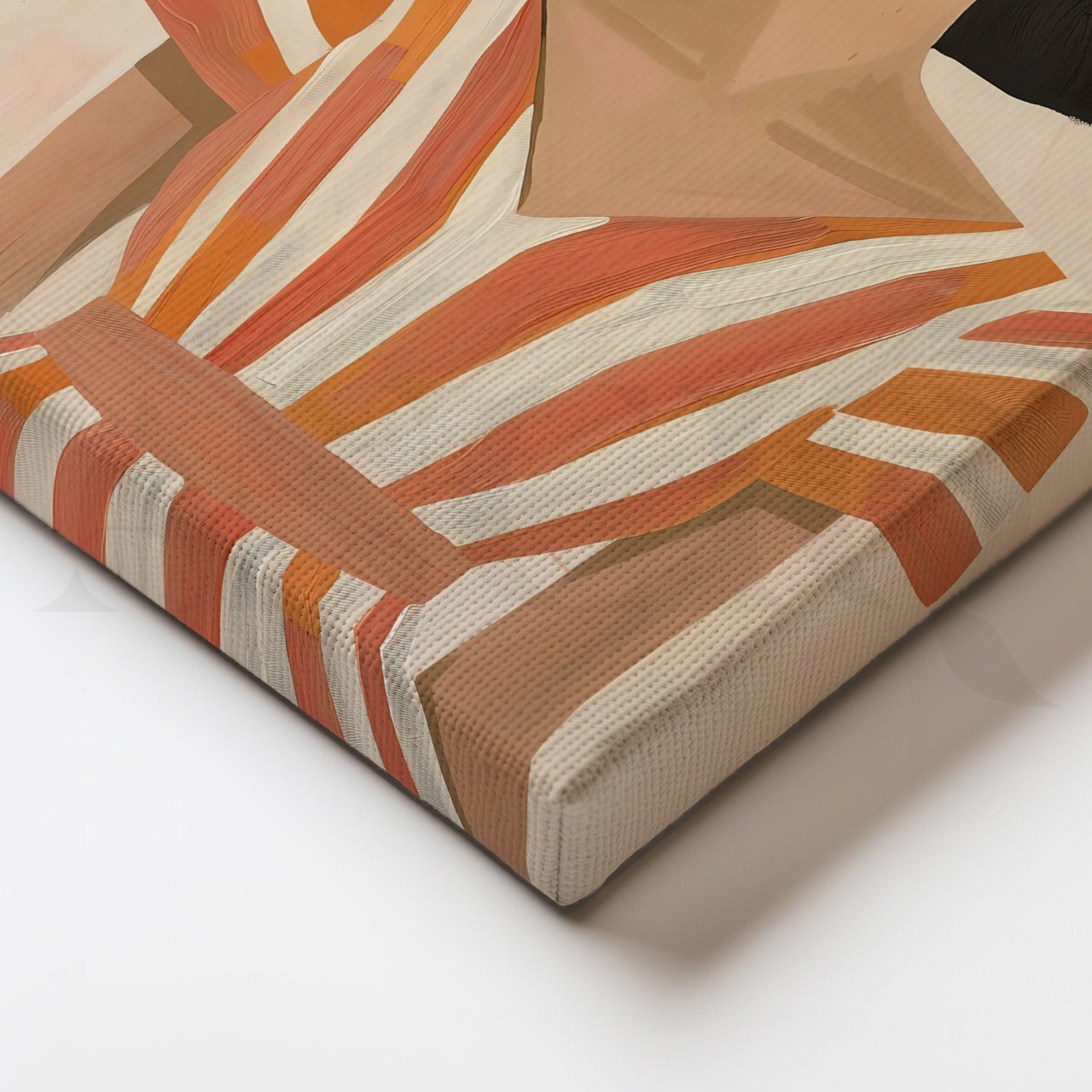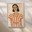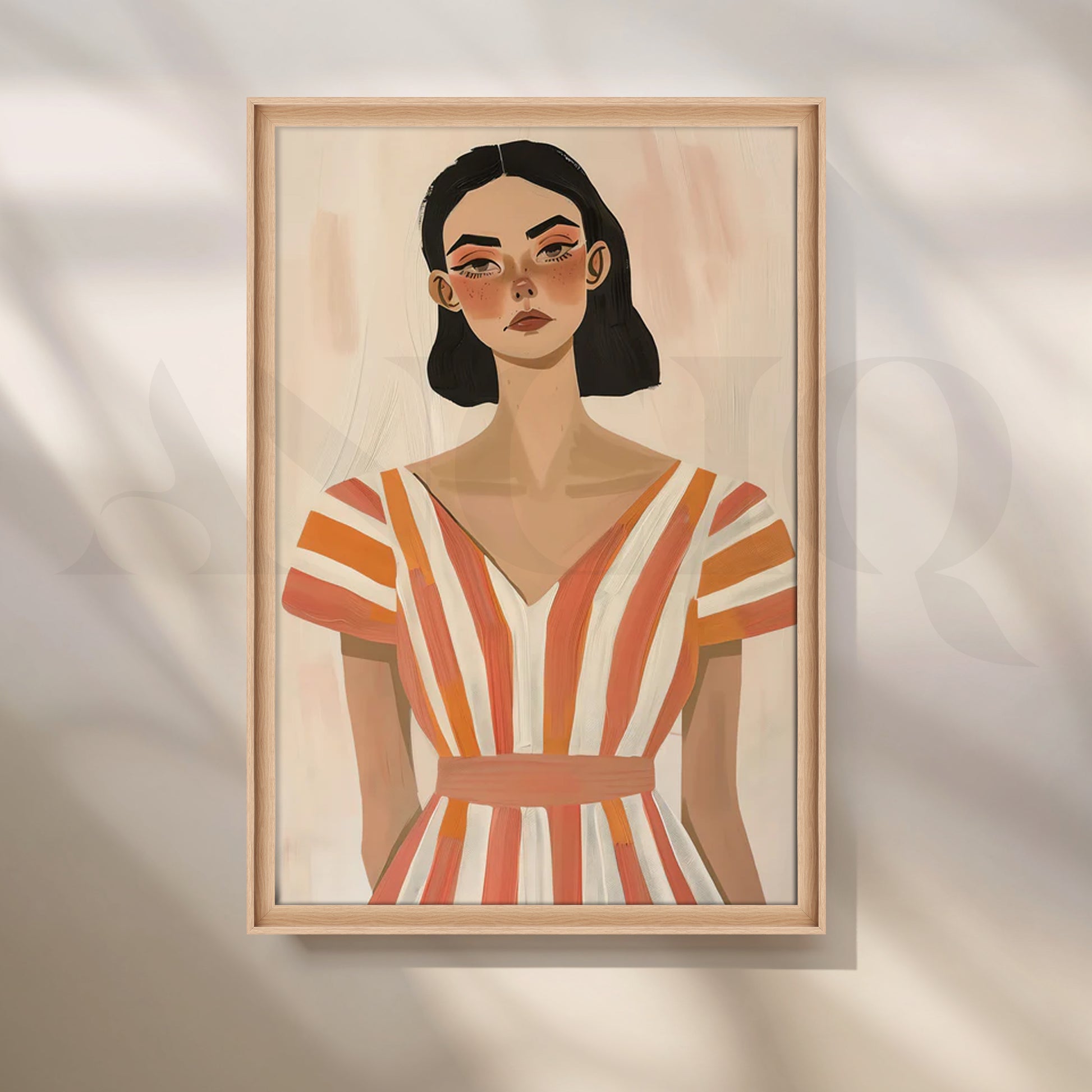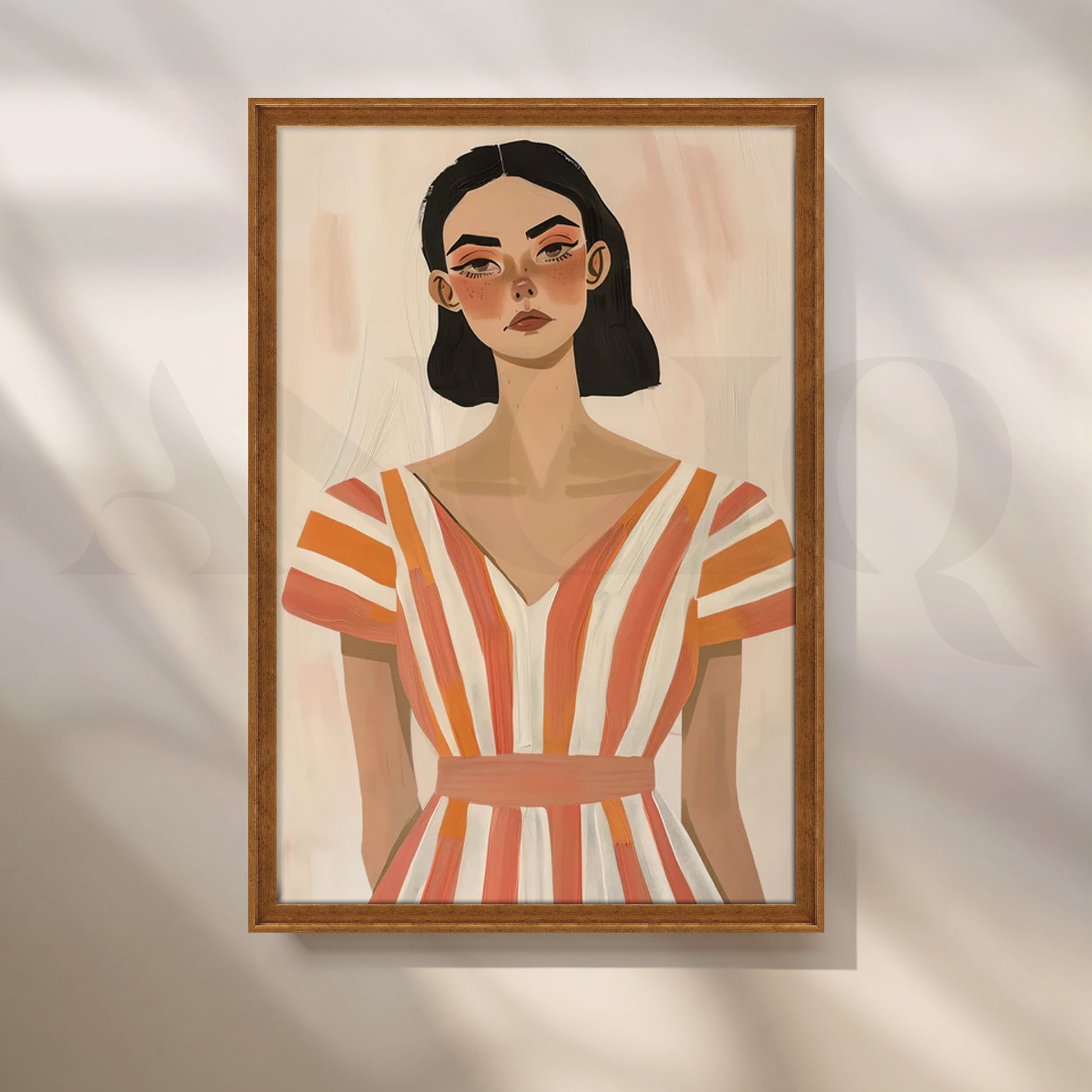 The Modern Portrait Wall Poster highlights a contemporary illustration of a woman with a striped orange and white dress. This wall poster exudes elegance with its soft color palette and minimalistic style, perfect for enhancing any modern or artistic space.