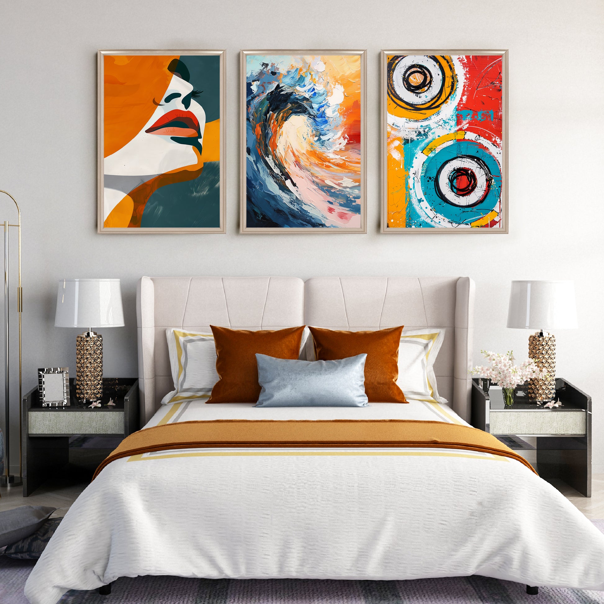 Anciq ‘Modern Waves & Muse’ Gallery Wall blends abstract expression and bold colors to energize your space. Perfect for bedrooms, living rooms, or modern apartments, this 3-piece canvas art set adds vibrancy and balance to contemporary interiors. Ideal for those searching for abstract gallery wall décor or modern canvas wall art.