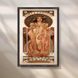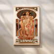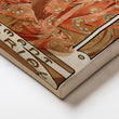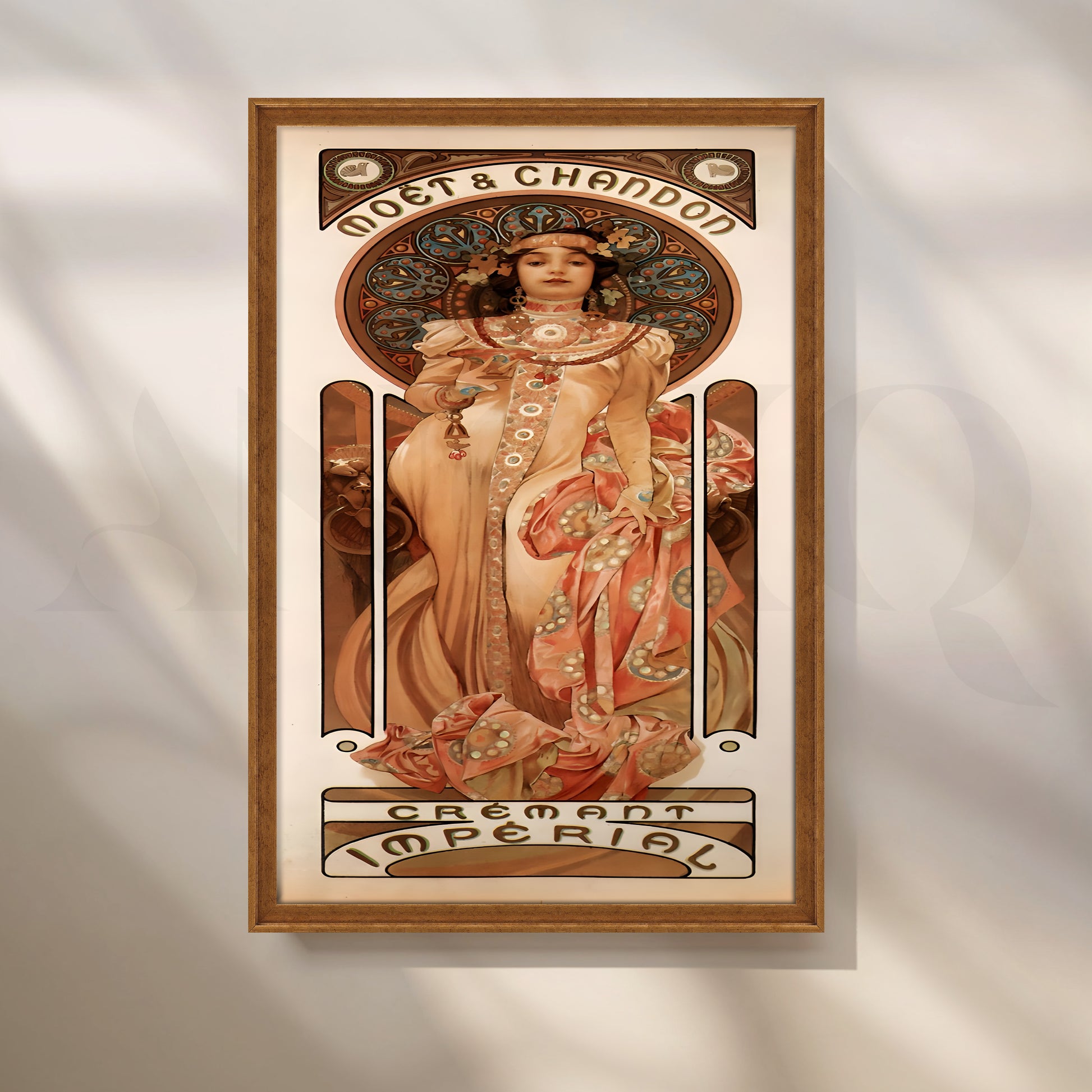 Classic Art Nouveau champagne poster in warm peach, beige and bronze—elegant figure with jeweled gown and ornate halo, “Moët & Chandon” typography. Perfect for dining rooms, home bars and cafés. Keywords: Moet & Chandon wall art, vintage French poster, champagne advertisement canvas, Mucha style print, Art Nouveau décor, peach and gold artwork, vertical canvas for bar area.