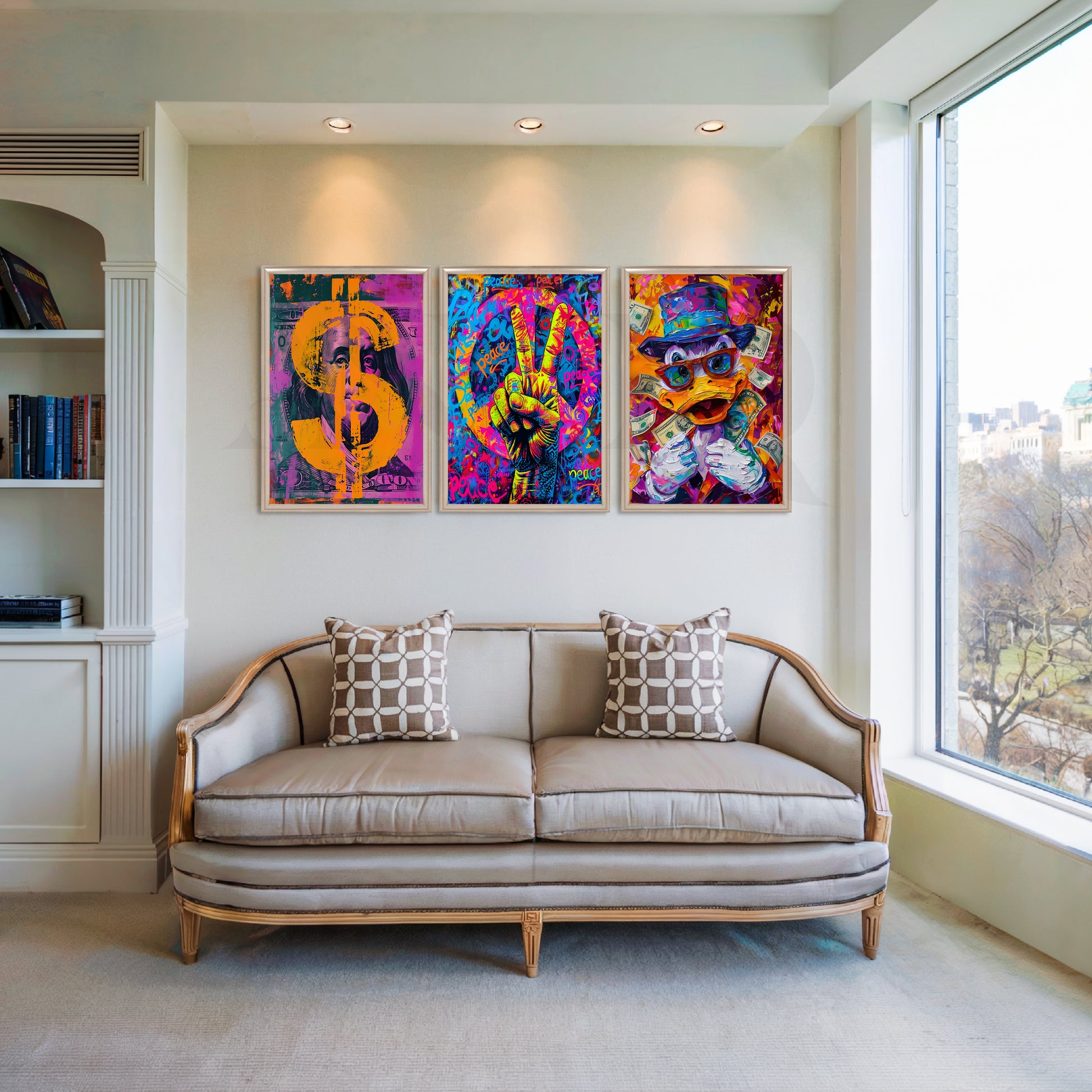 Anciq ‘Money Moves Pop Art’ Gallery Wall brings playful luxury to your space with a dollar sign portrait, peace hand, and quirky money-loving duck. Perfect for living rooms, bachelor pads, game rooms, or home offices, this 3-piece set adds bold colour and attitude. Ideal for pop art wall décor and statement interiors.