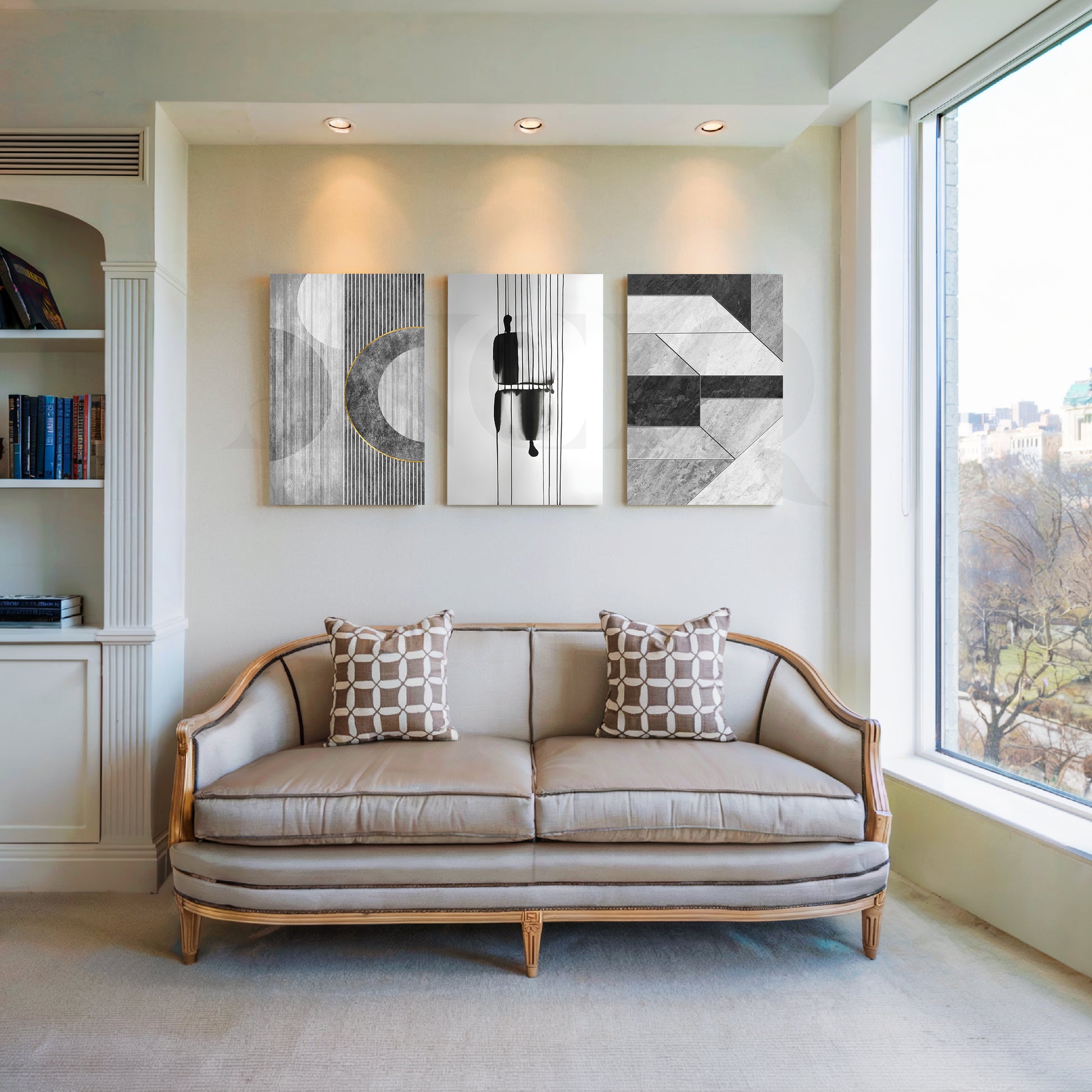 Anciq ‘Monochrome Silent Story’ Gallery Wall mixes geometric textures with a solitary swinging figure for a calm, reflective vibe. Perfect for living rooms, hallways, offices, or reception areas, this 3-piece black-and-white art set suits minimalist and modern interiors. Ideal for monochrome gallery wall décor and contemporary abstract wall art.